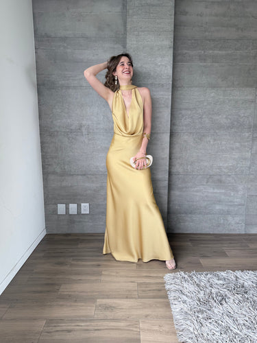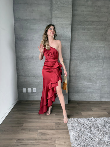 Galatea - Vestido largo asimétrico de satín color chocolate