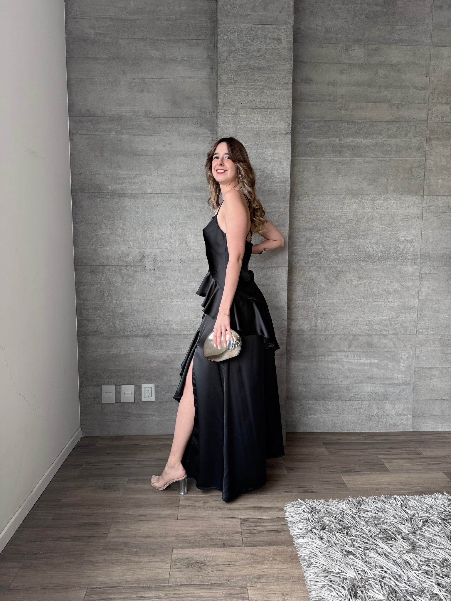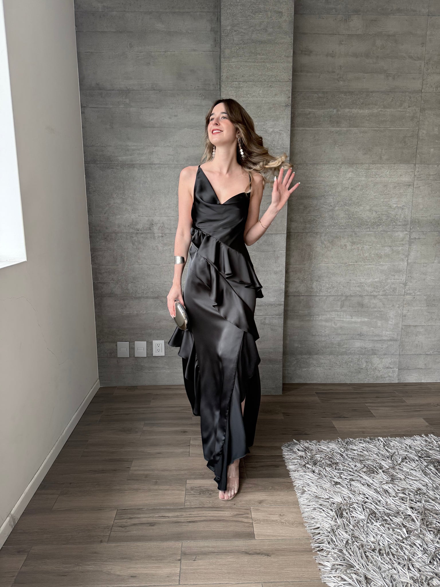 Agatha - Vestido largo de satin con olanes negro