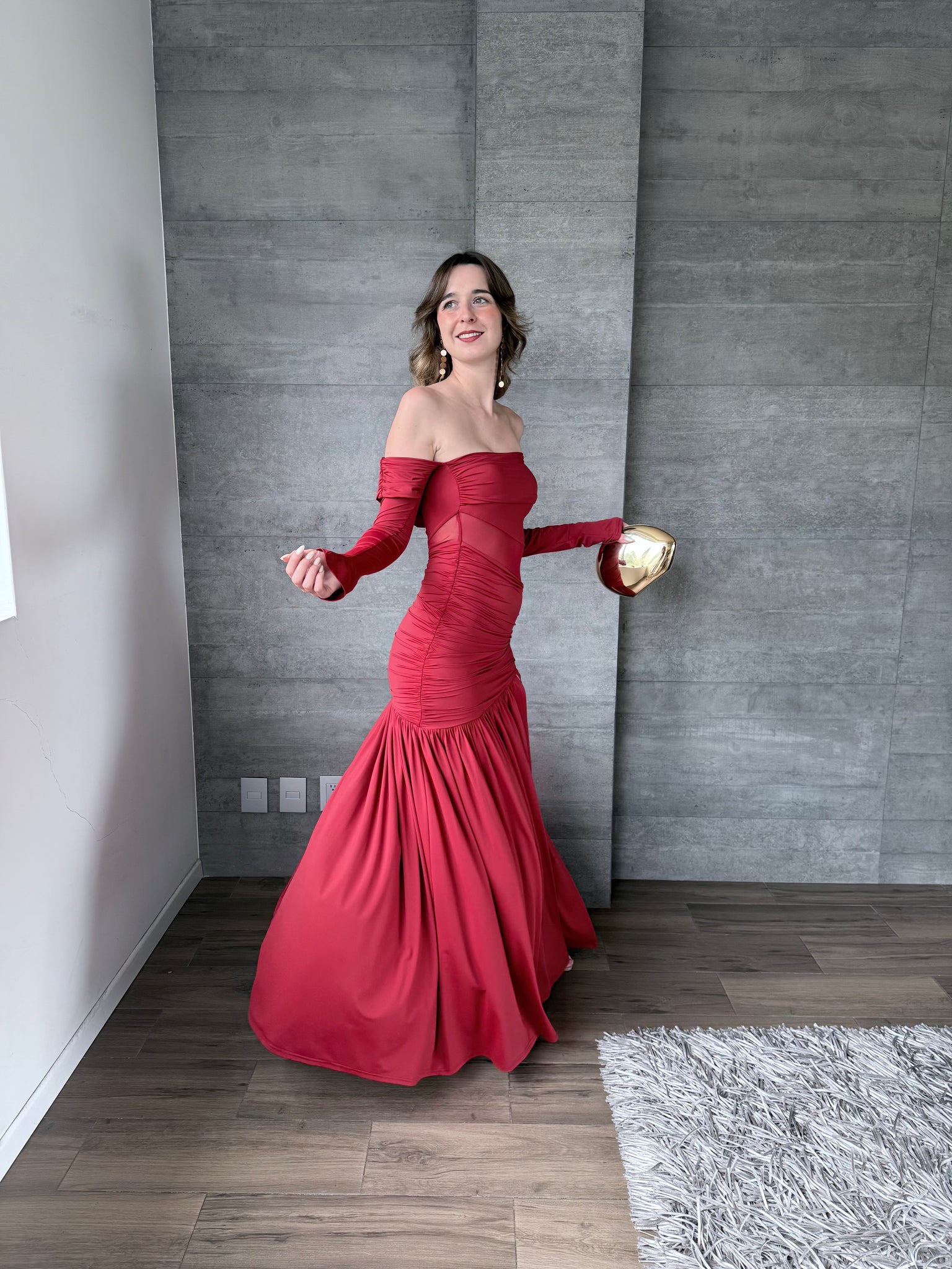 Vestido largo de lycra con mangas, transparencia en abdomen, abertura en pierna.