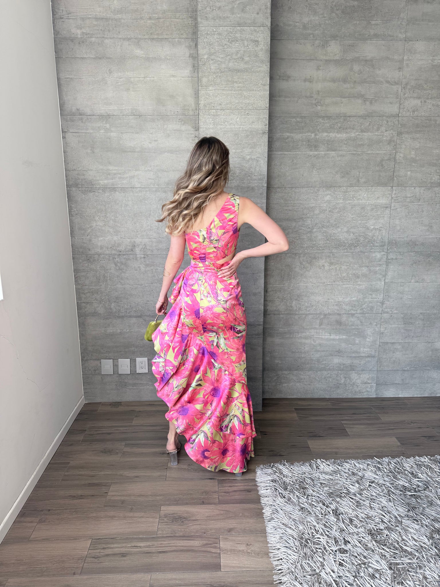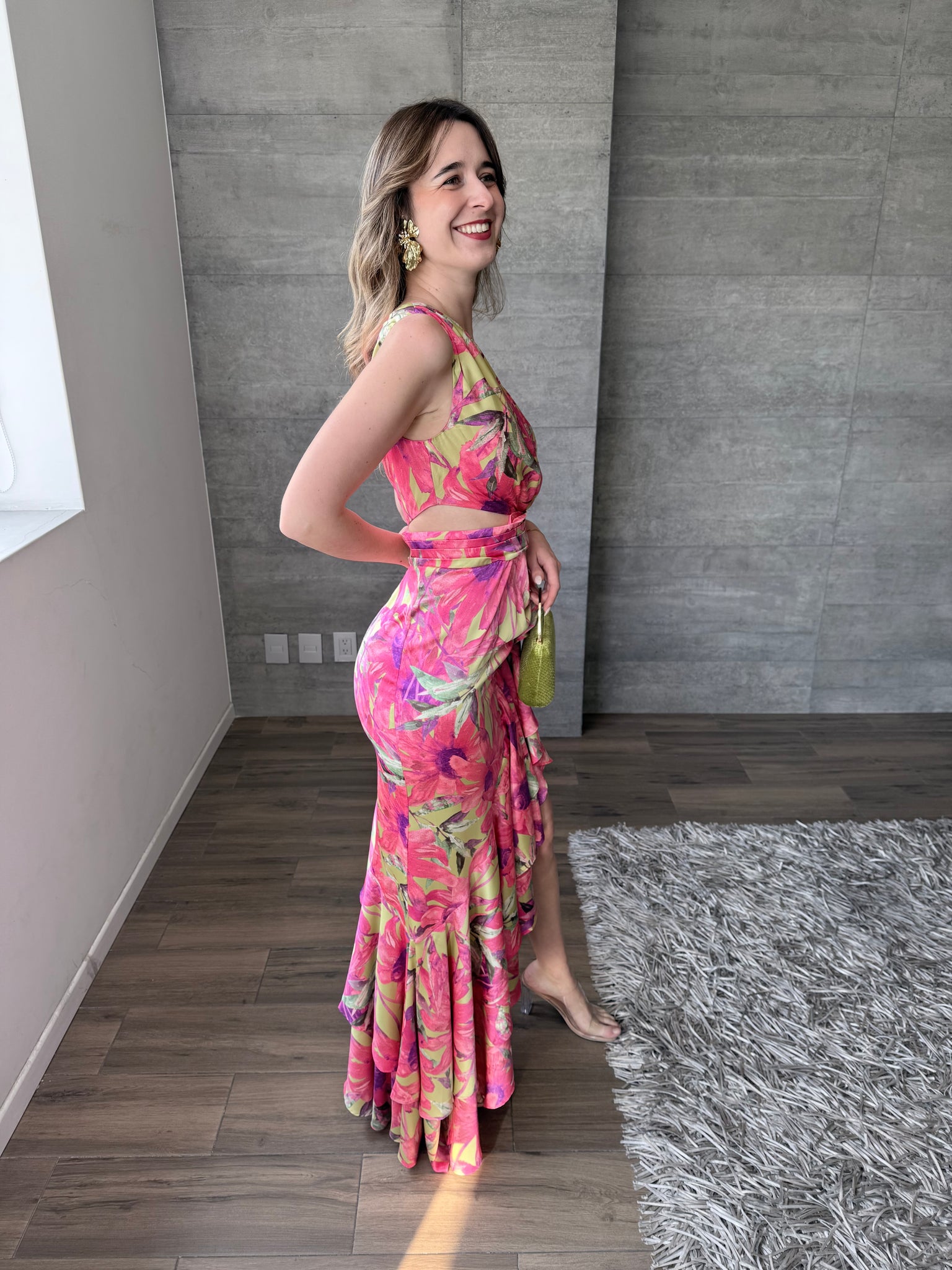 Vestido largo asimetrico con olanes, cutout lateral. Tela satinada con estampado floral.