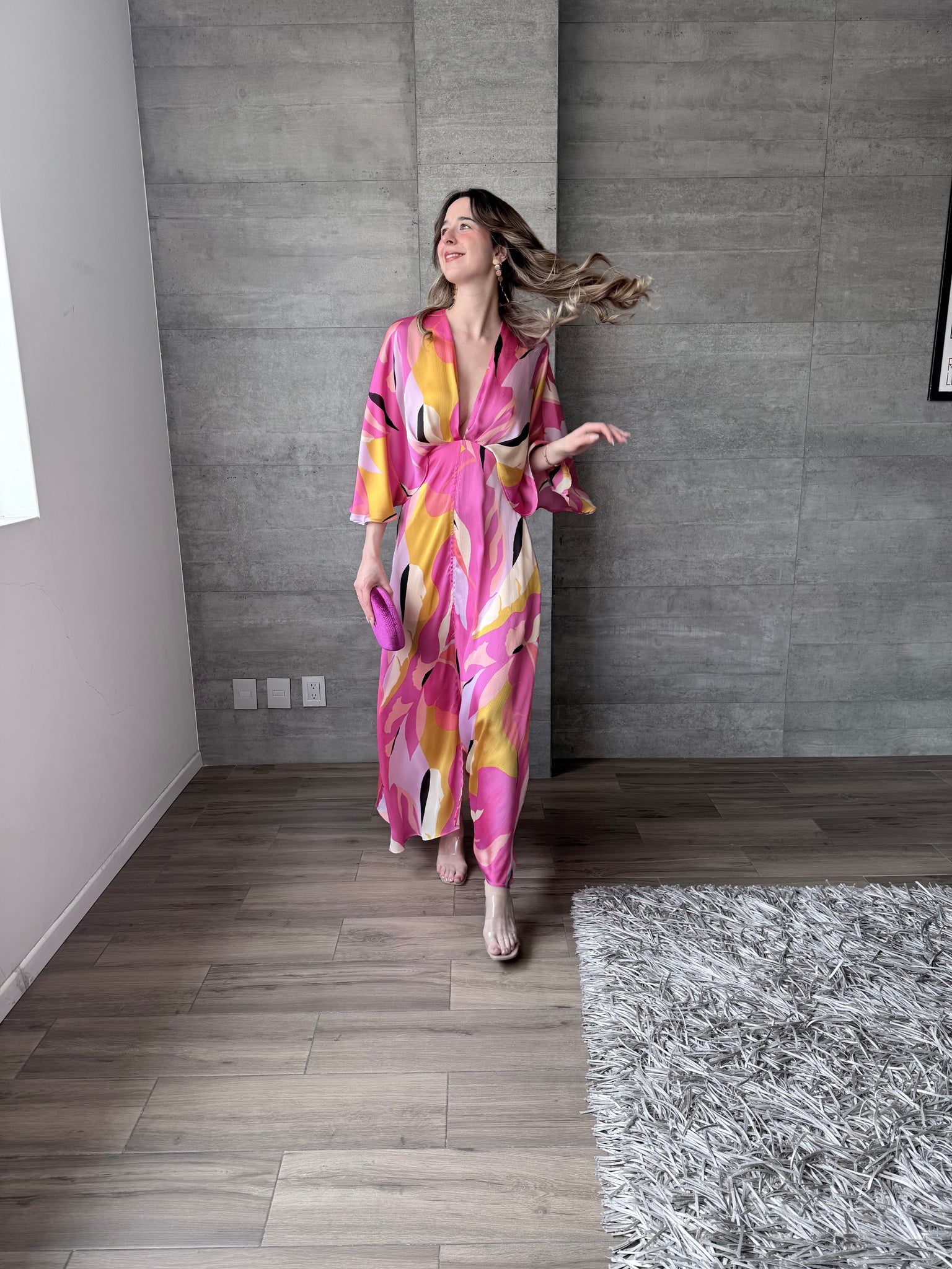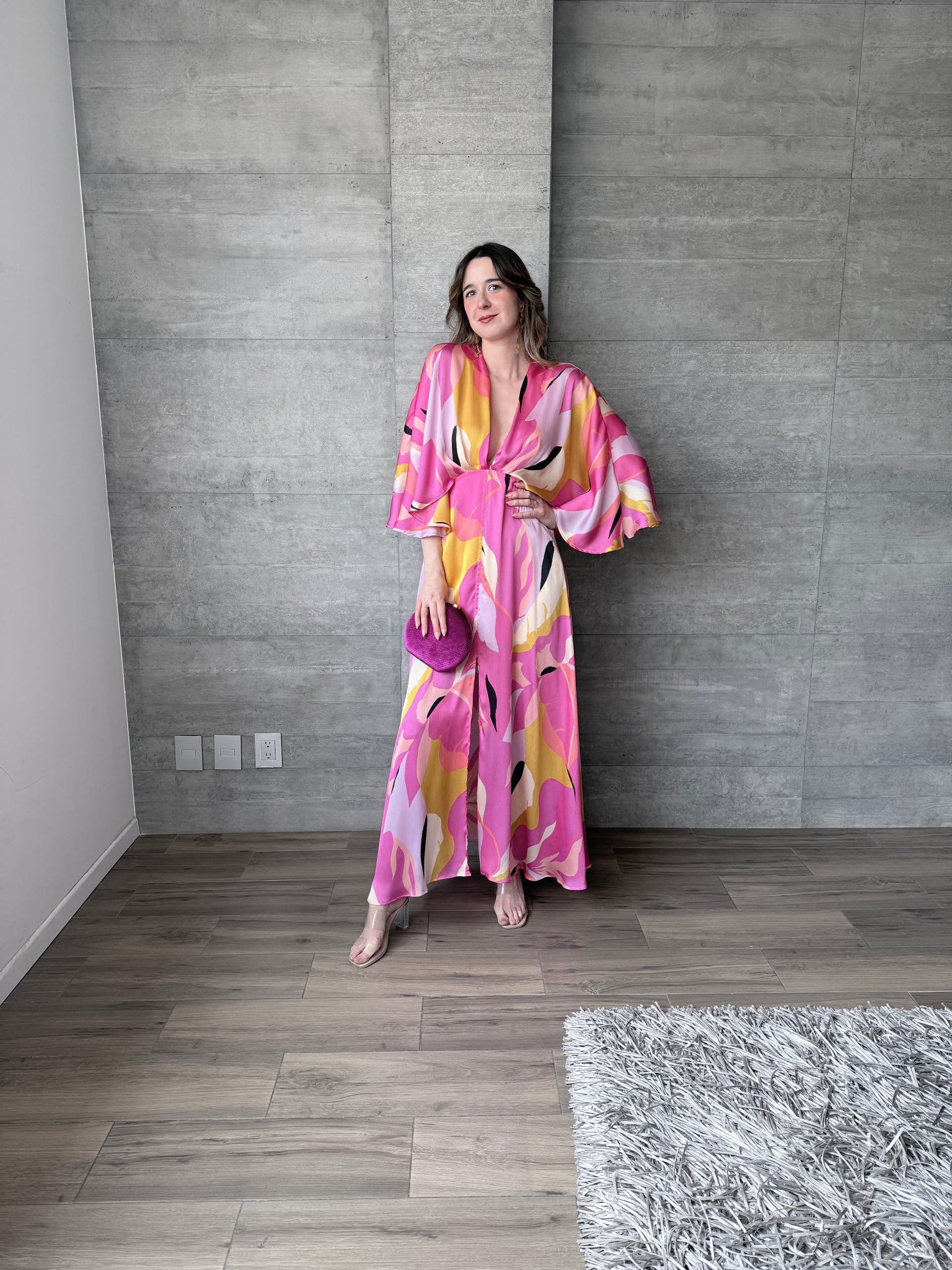 Kaftan multicolor con tela satinada, escote en V y abertura frontal.