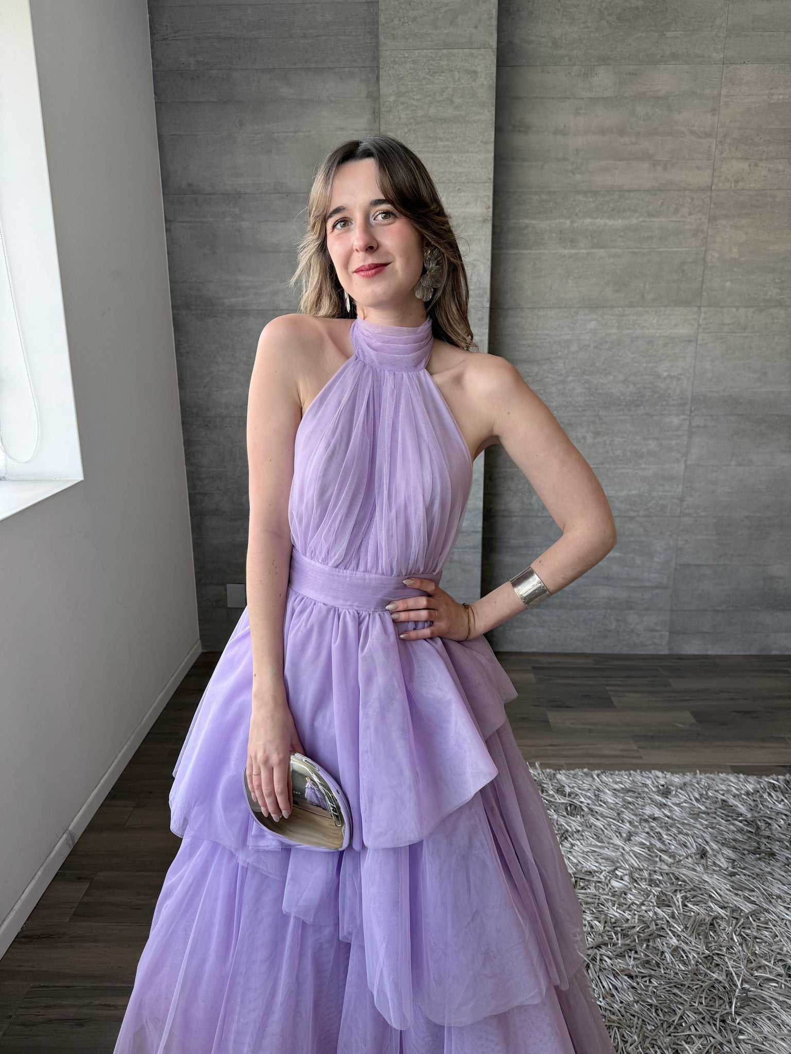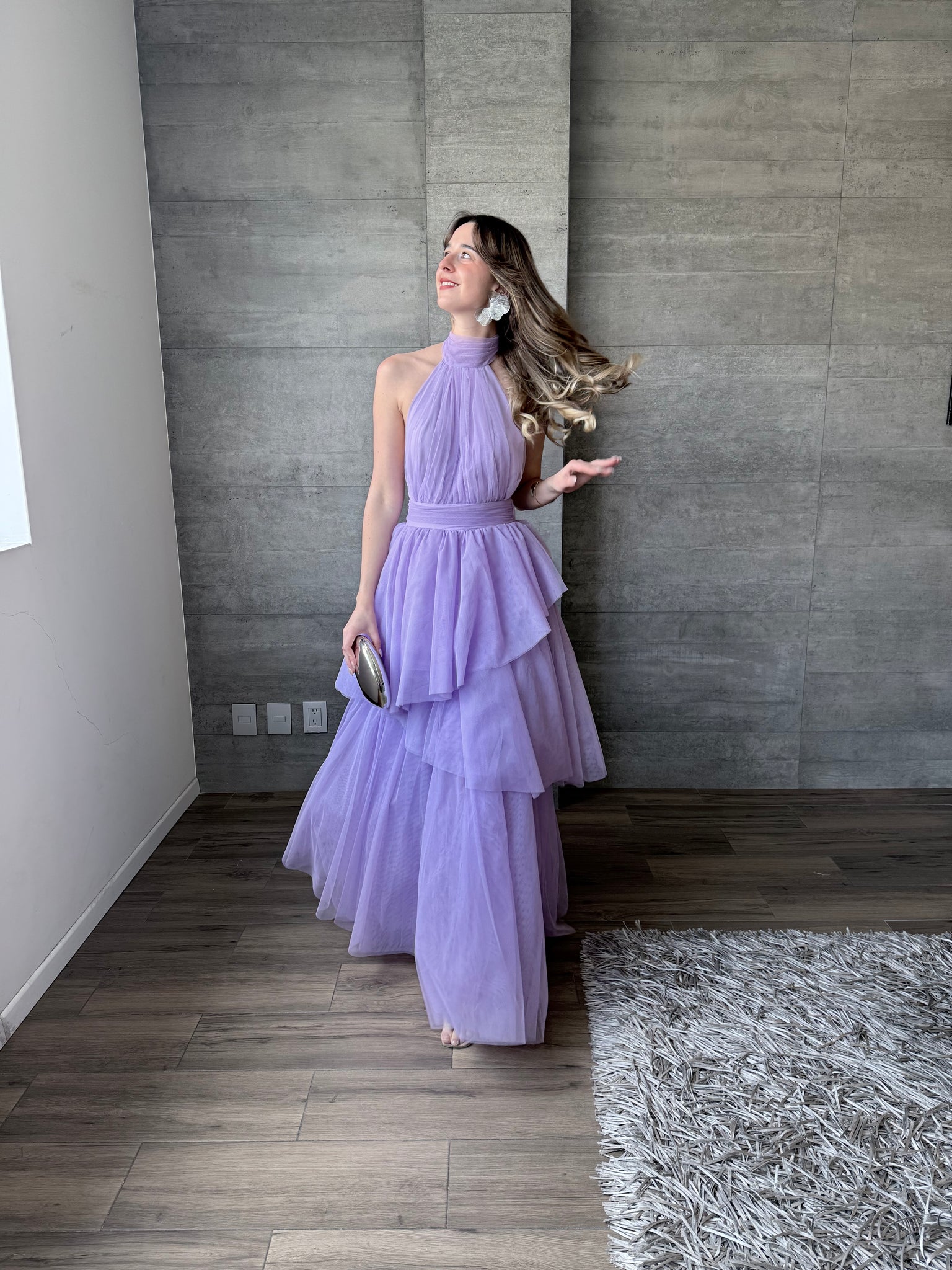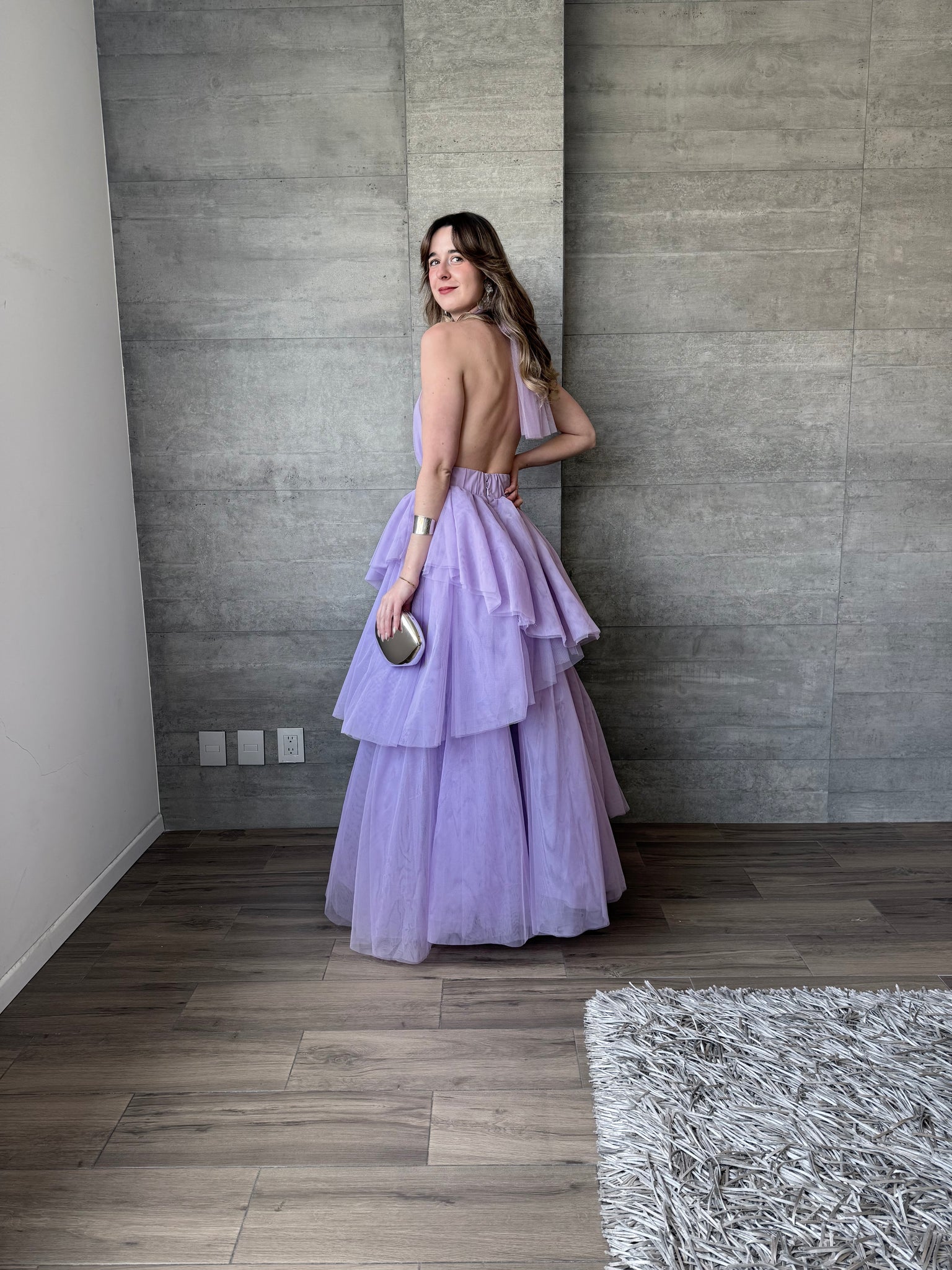 Vestido largo halter con capas de tul y espalda descubierta en color lavanda.