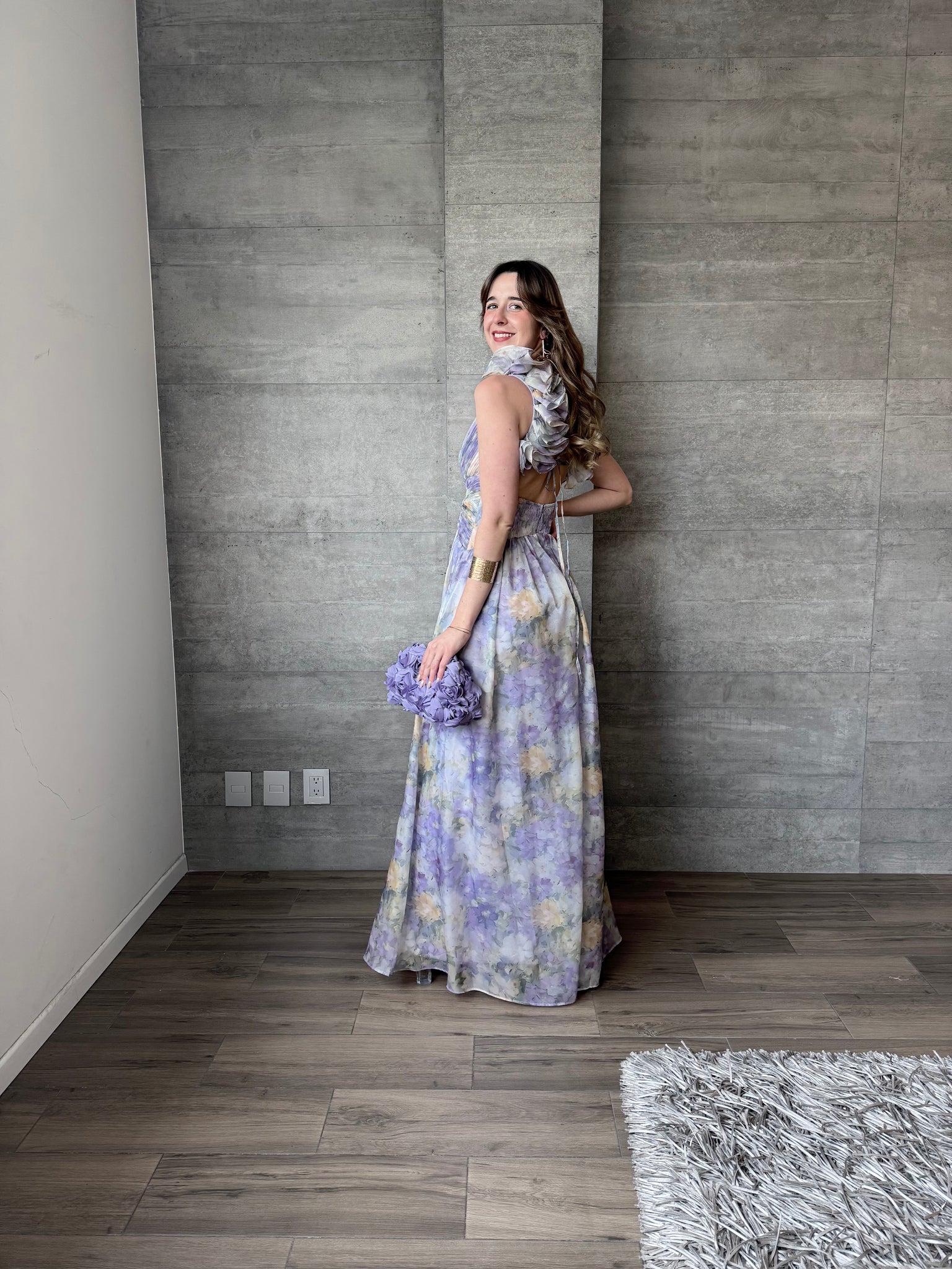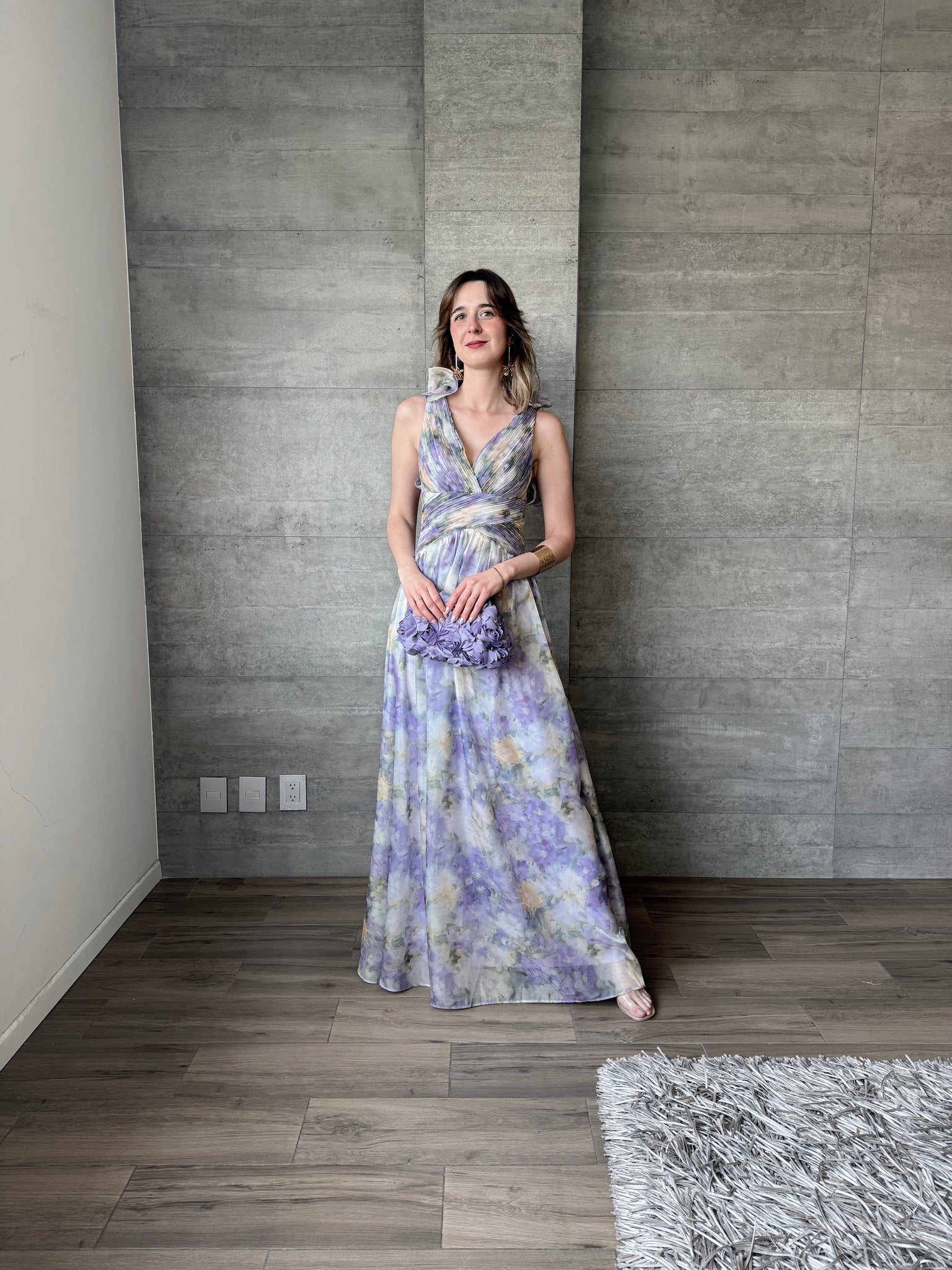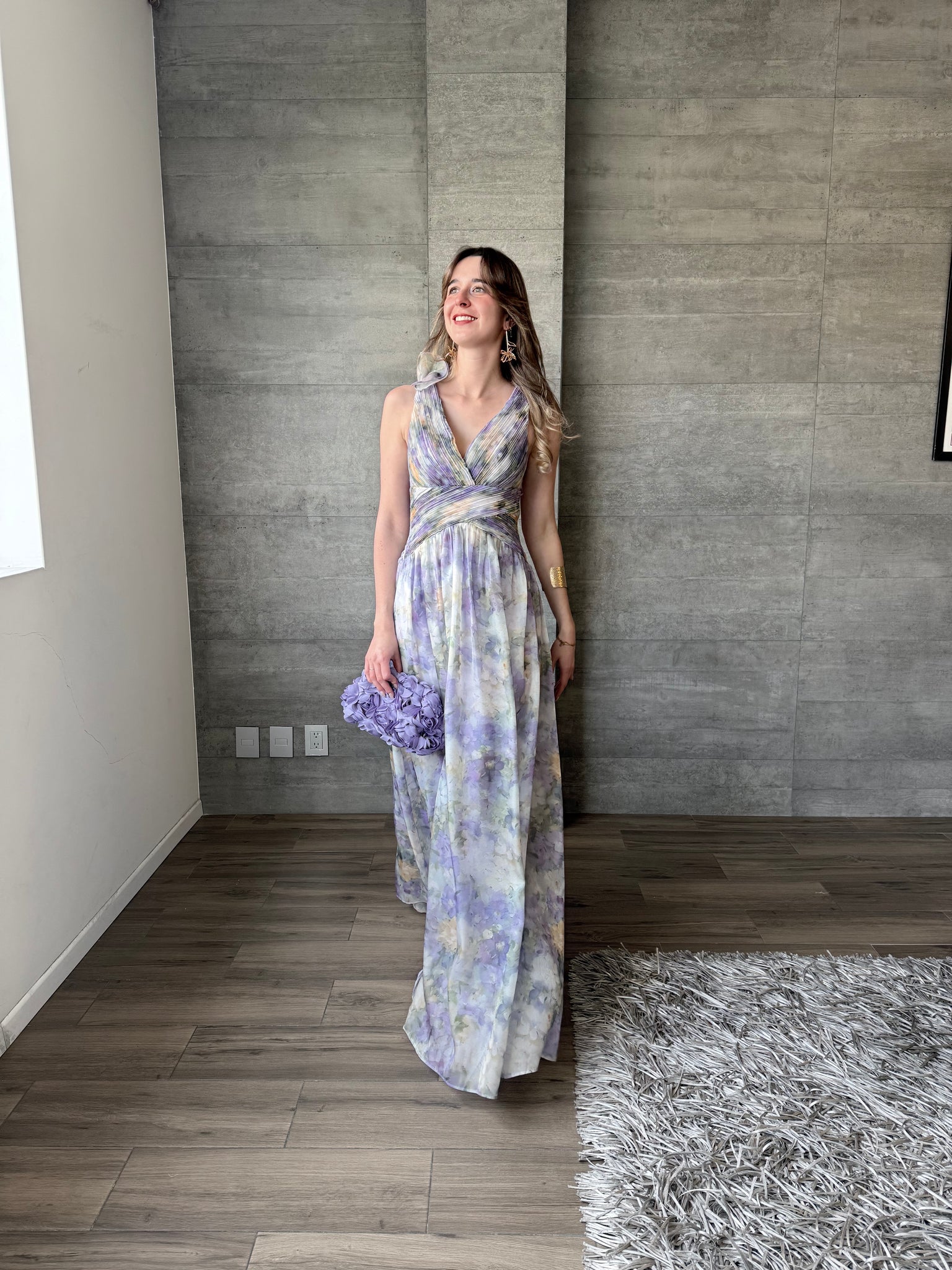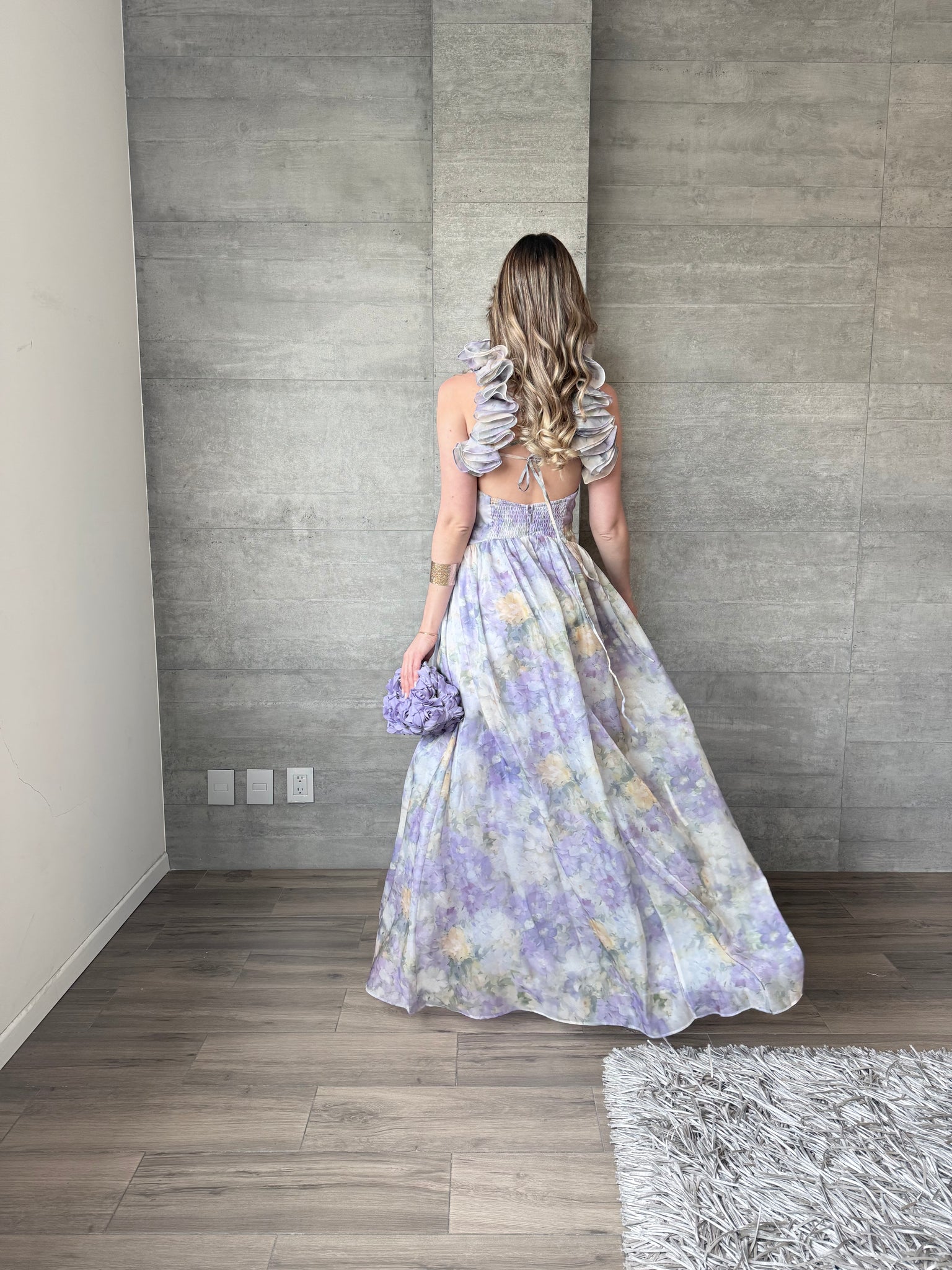 Vestido largo con estampado floral en tonos lavanda. Escote en V, espalda descubierta y detalle sutil de olanes en hombros.