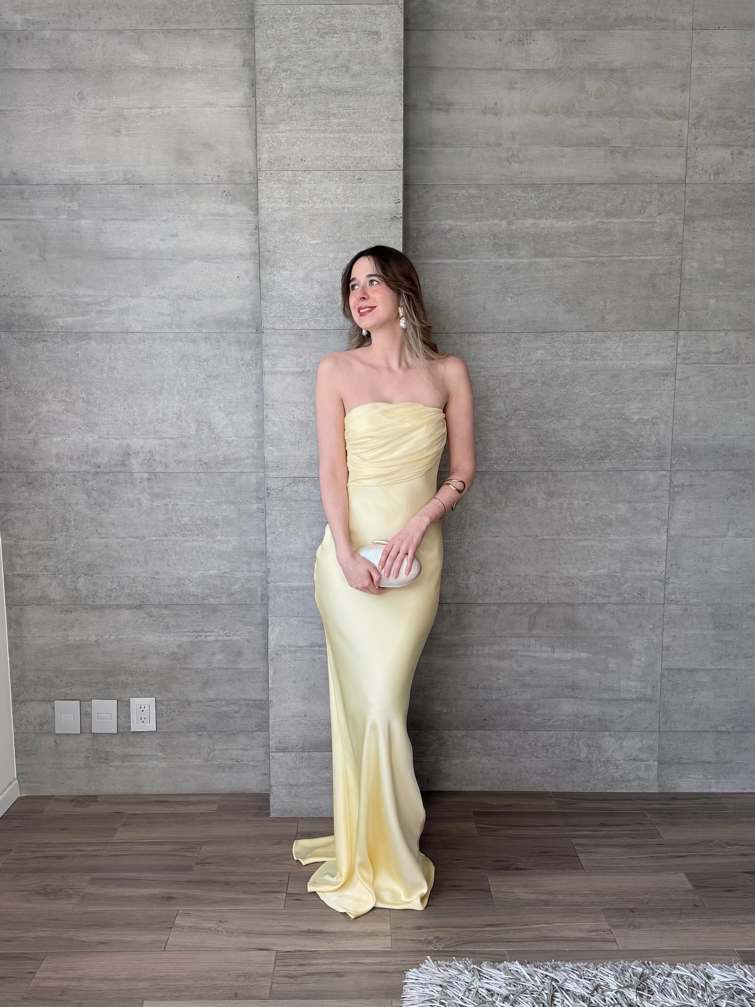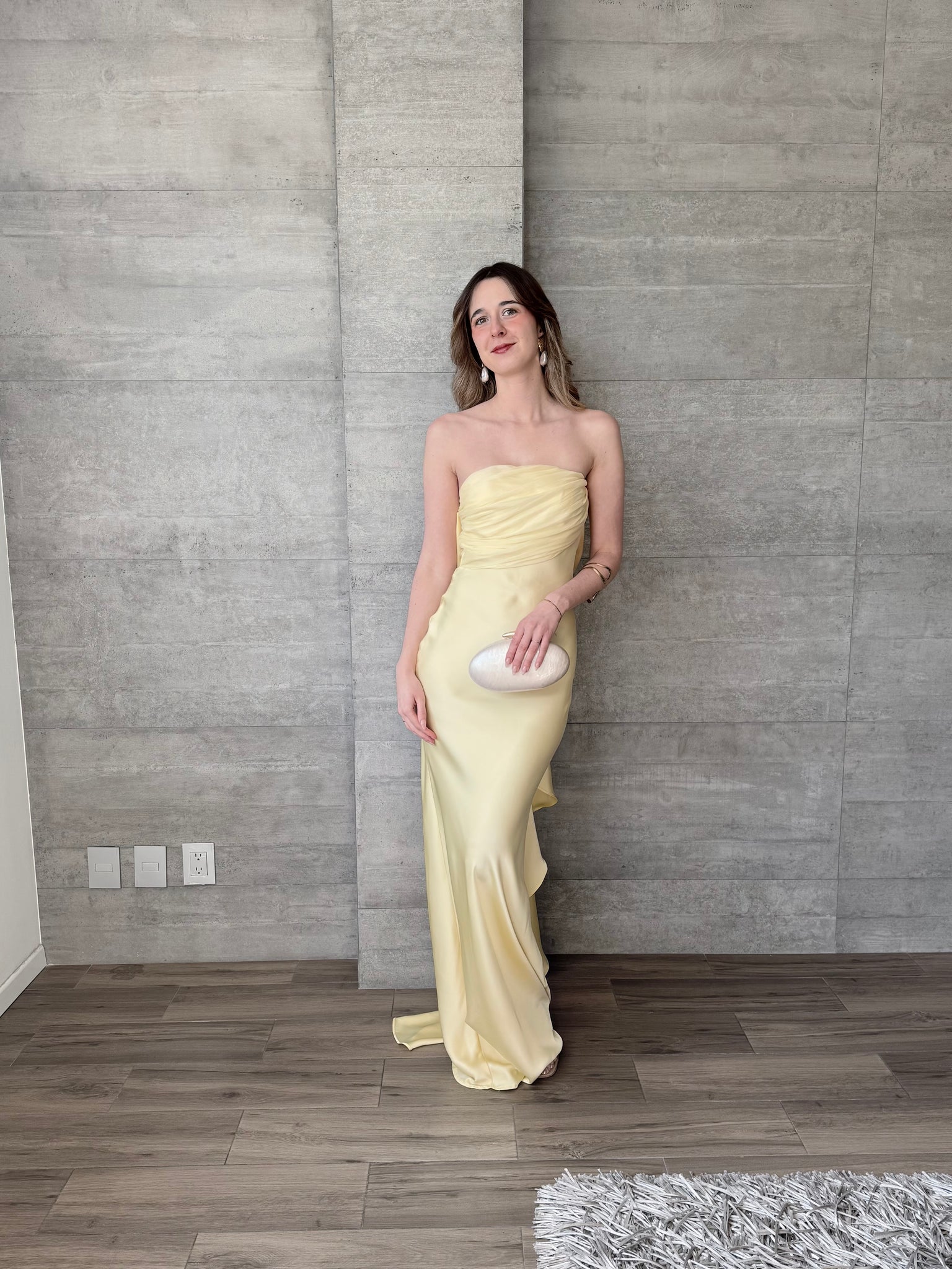 Vestido largo satinado amarillo mantequilla strapless con detalle de moño en espalda.
