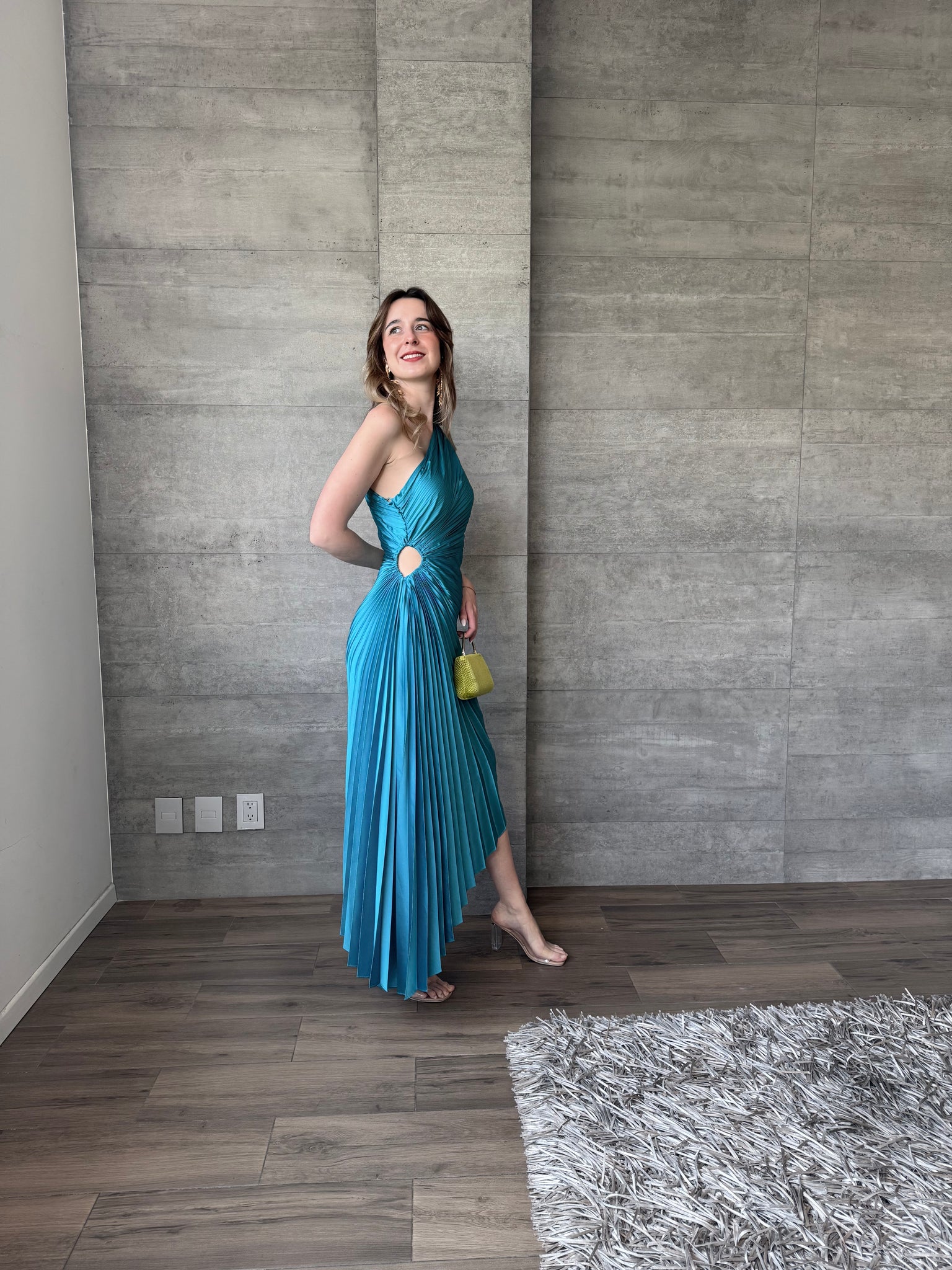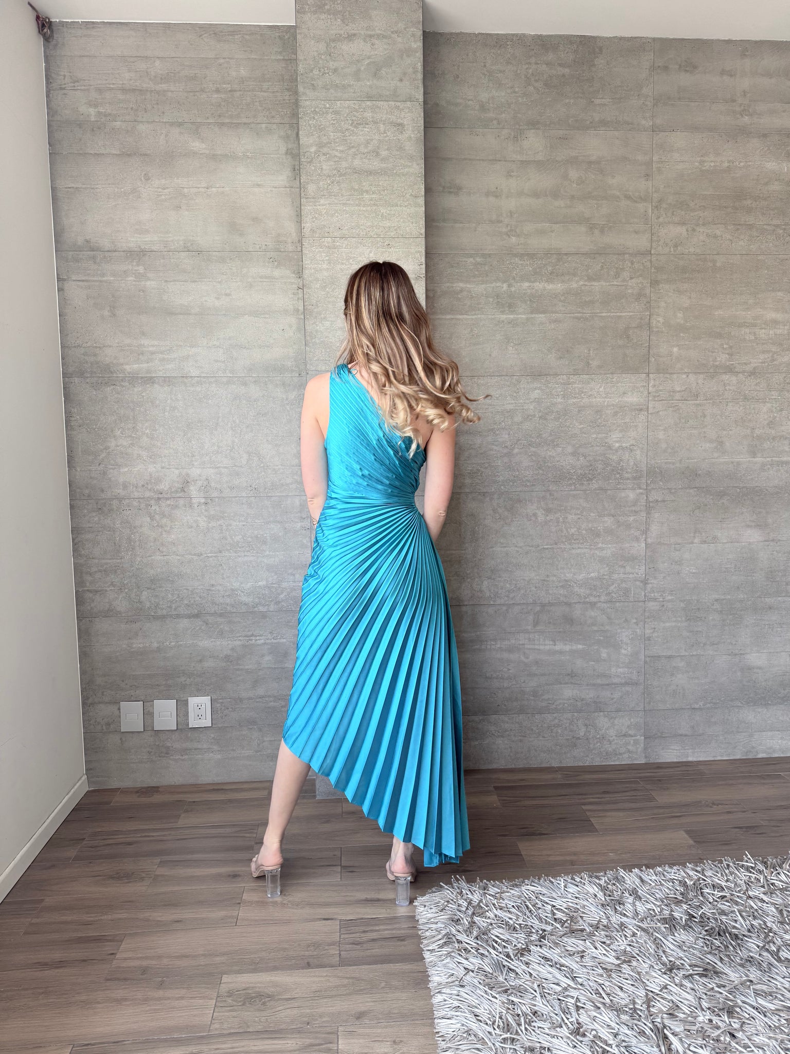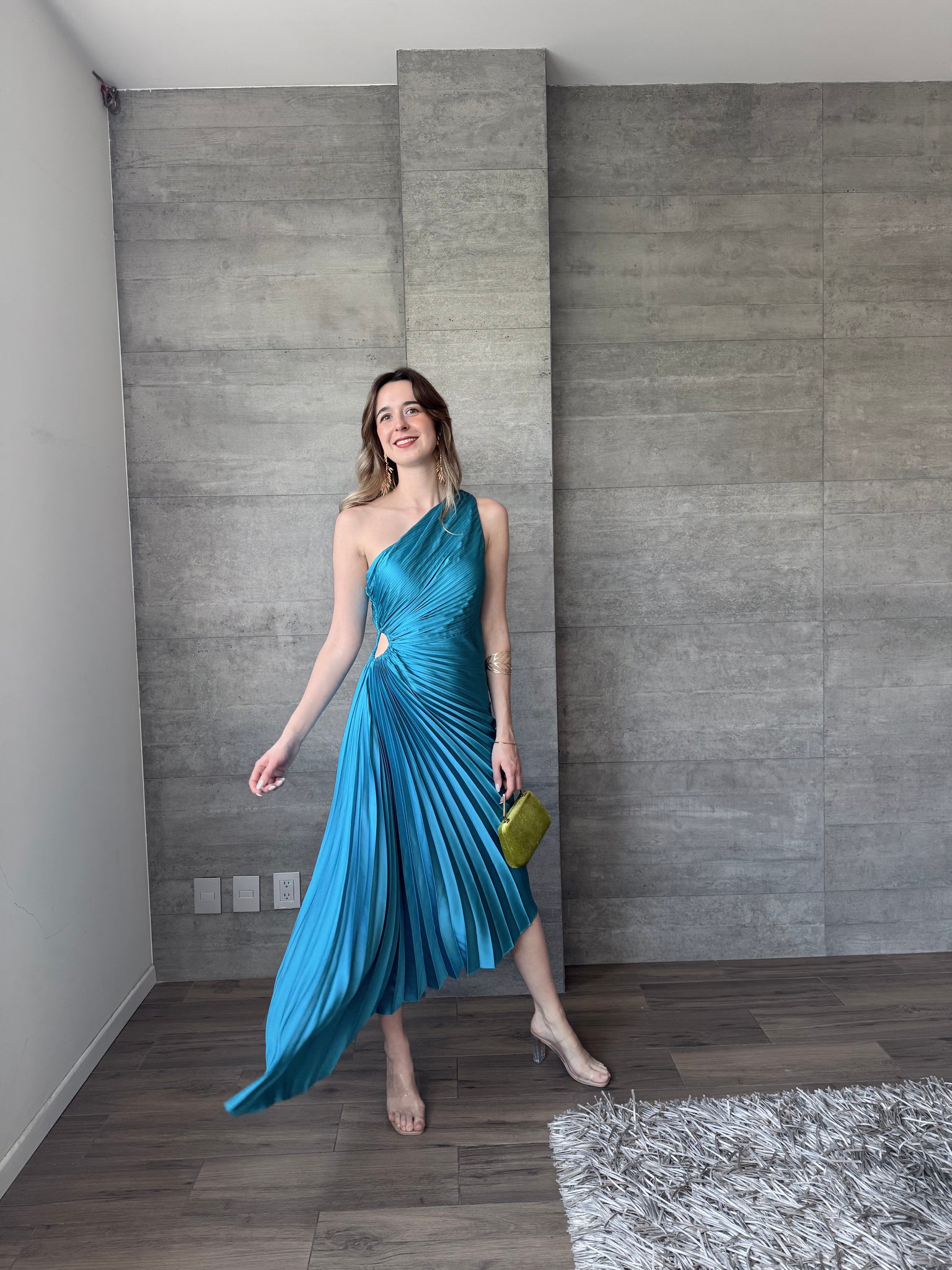 Vestido midi plisado, asimetrico, cutout lateral. Tela satinada.