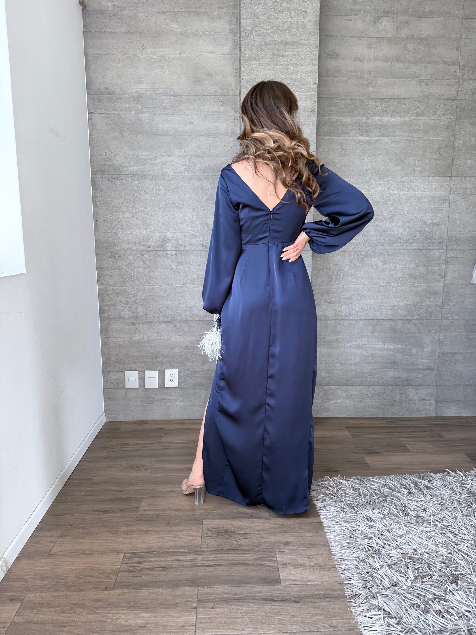 Vestido satinado largo con mangas y abertura en pierna. Cierre en espalda.