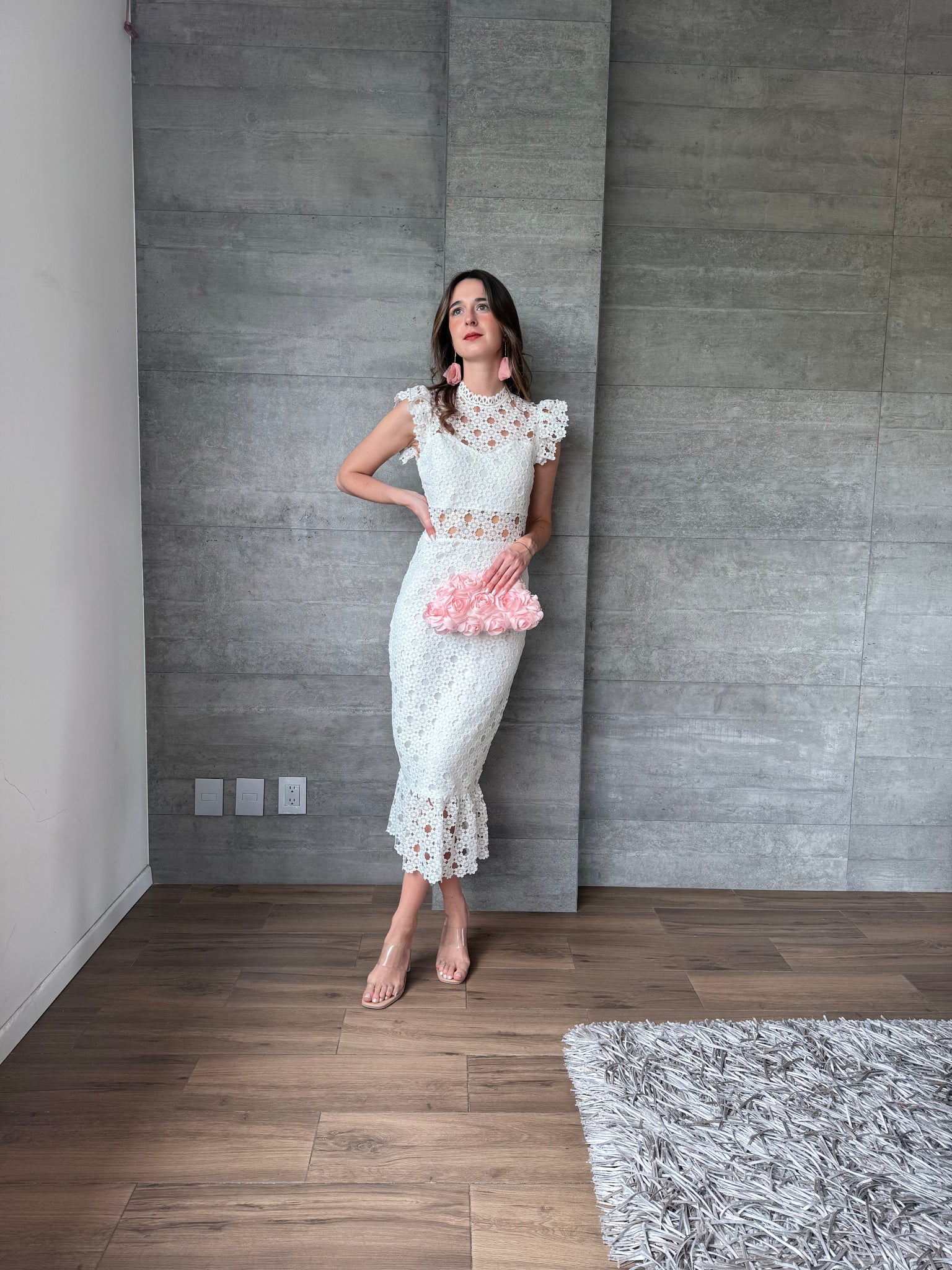 Vestido midi crochet color blanco, entallado a la silueta, con cuello alto, delicados olanes en hombros y falda con ligero vuelo, ideal para eventos de día y celebraciones especiales.