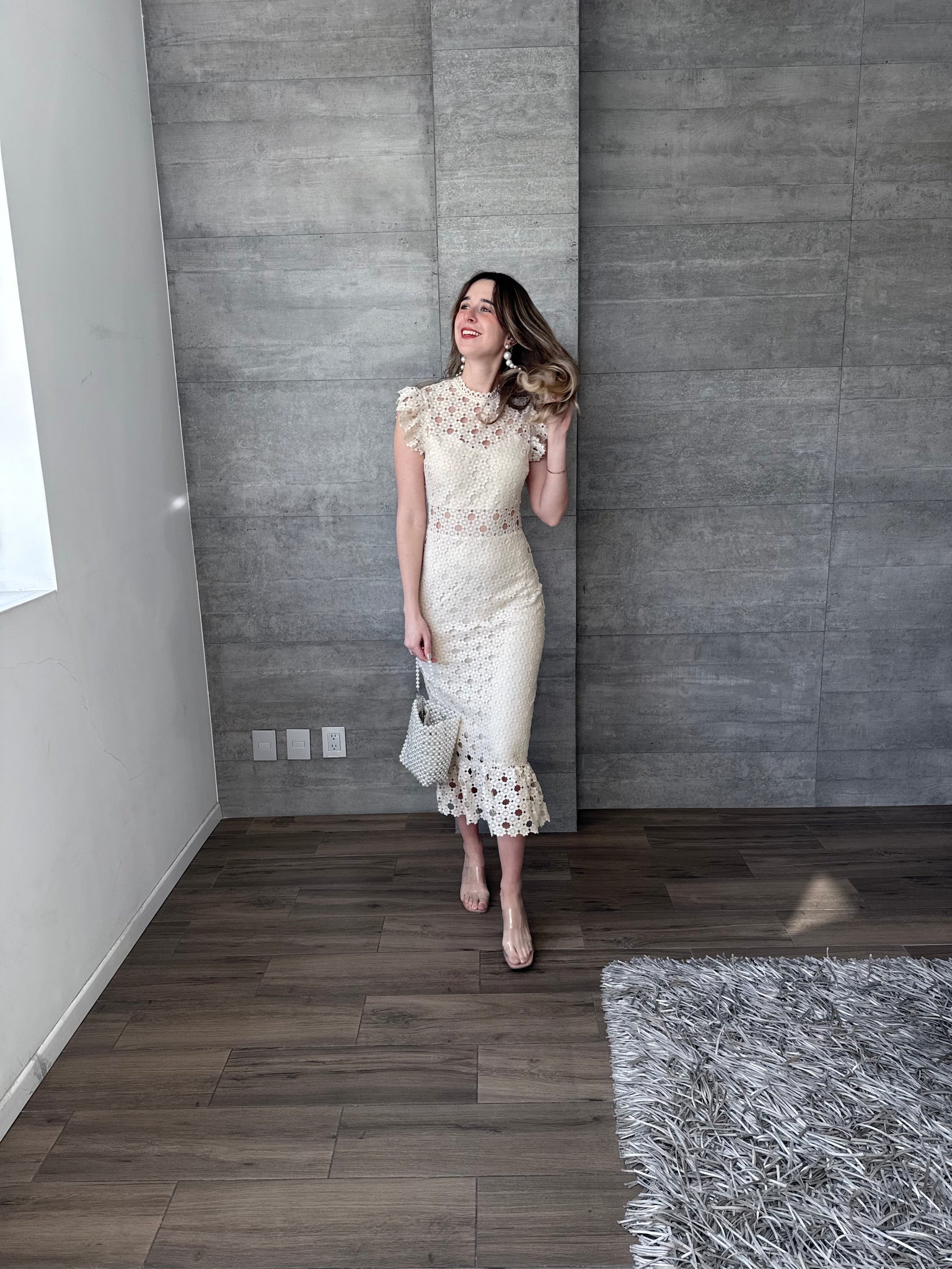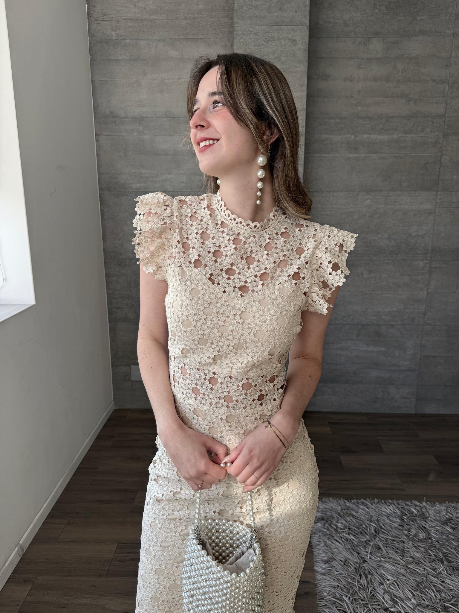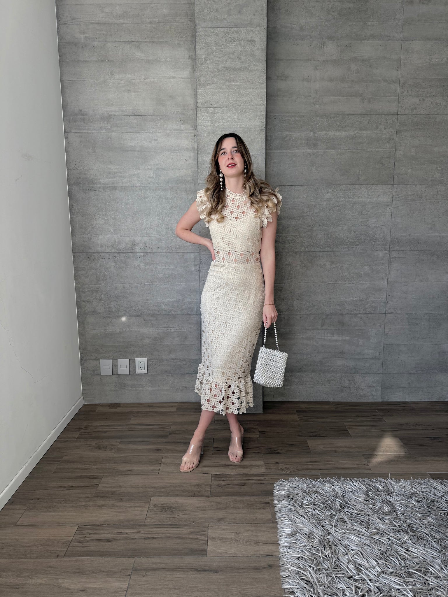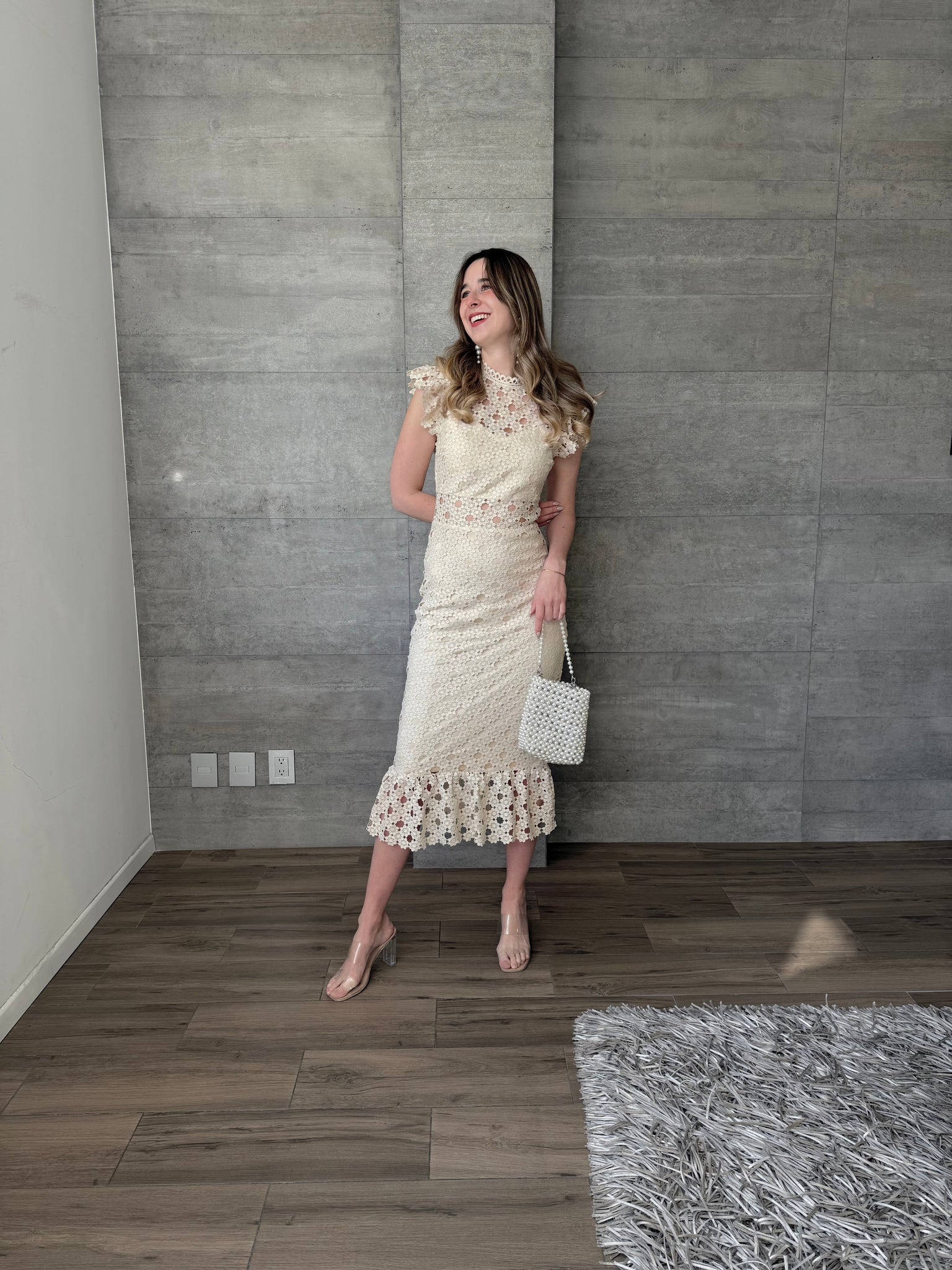 Vestido midi crochet color nude, entallado a la silueta, con cuello alto, delicados olanes en hombros y falda con ligero vuelo, ideal para eventos de día y celebraciones especiales.
