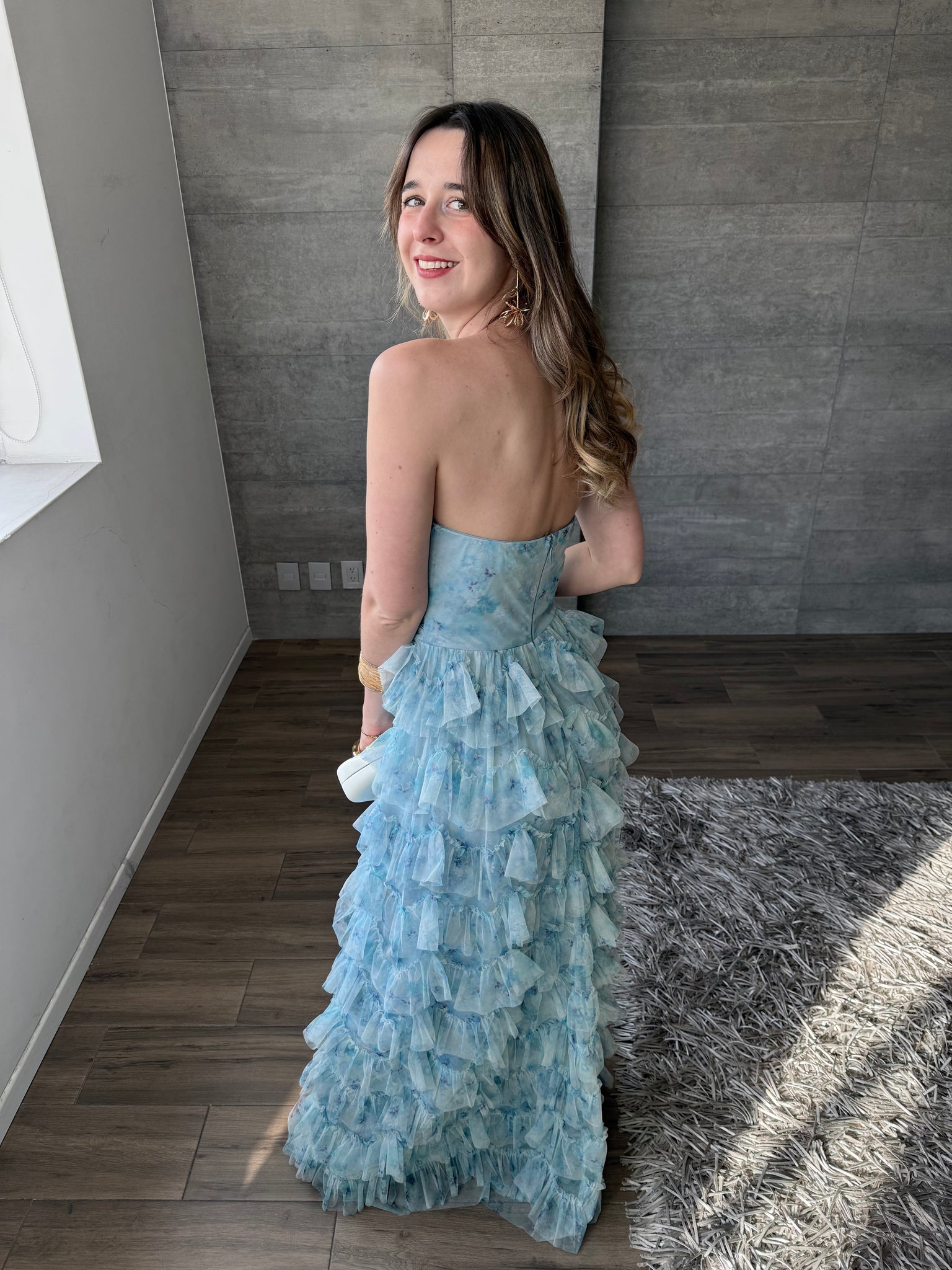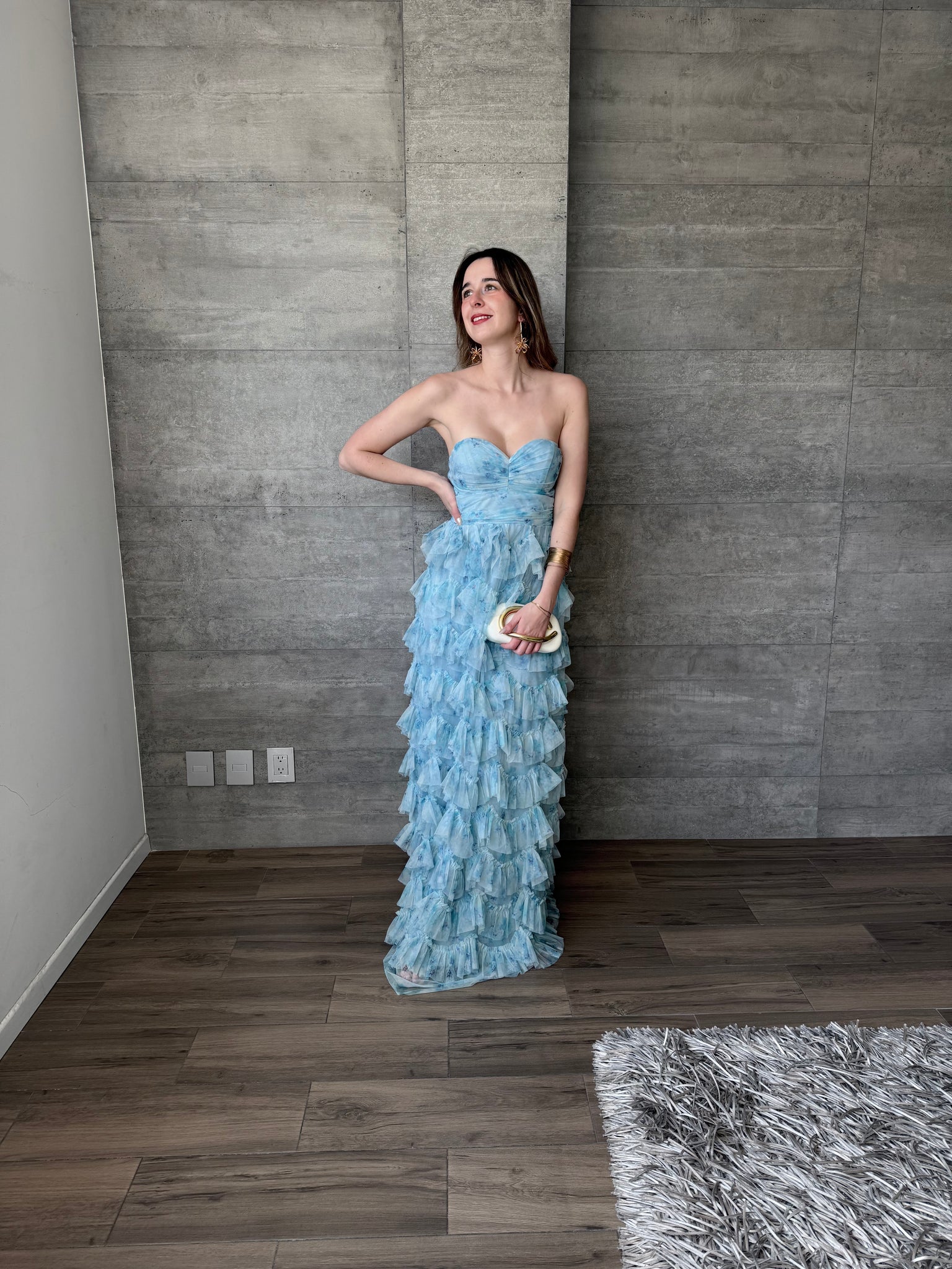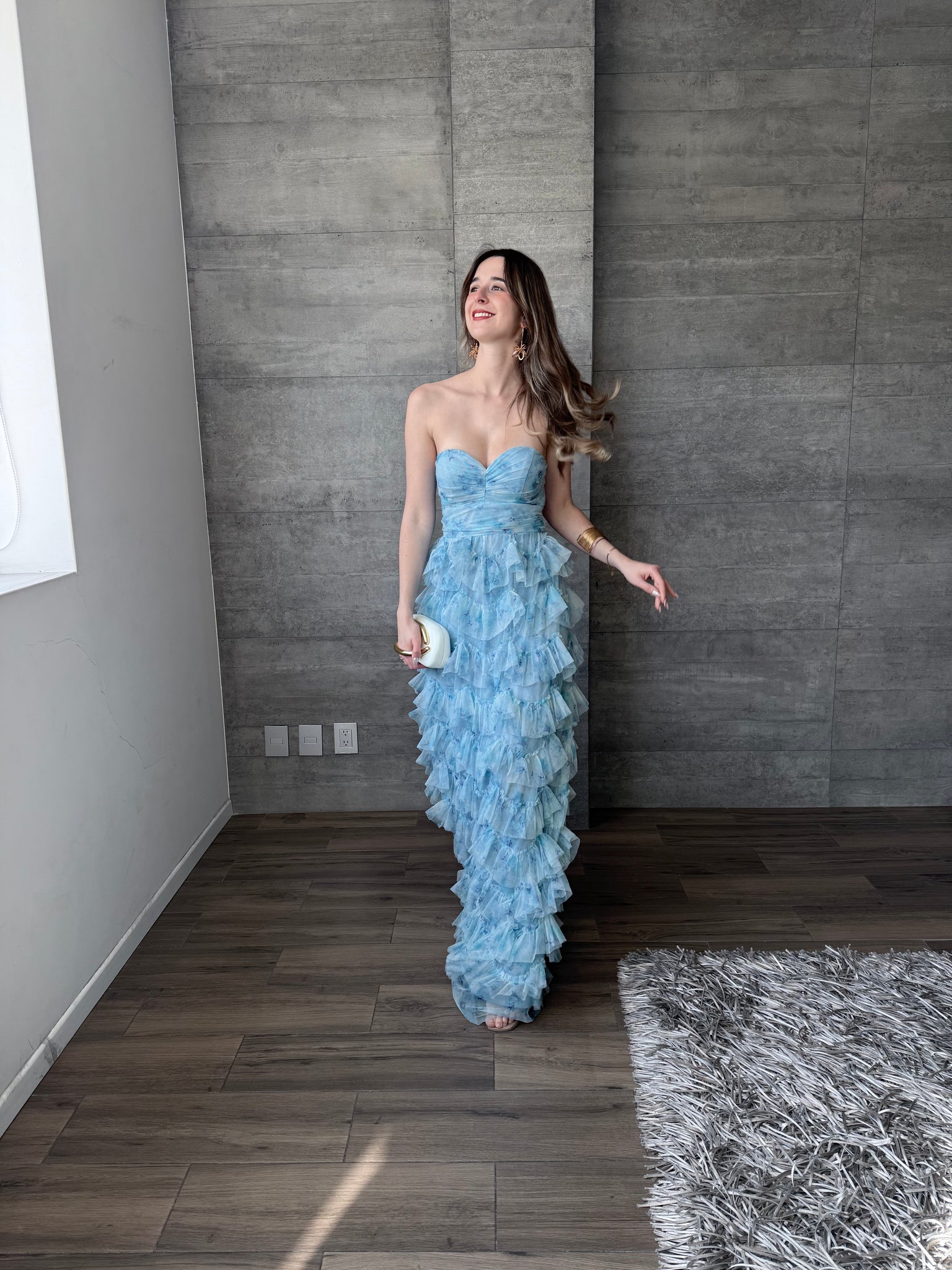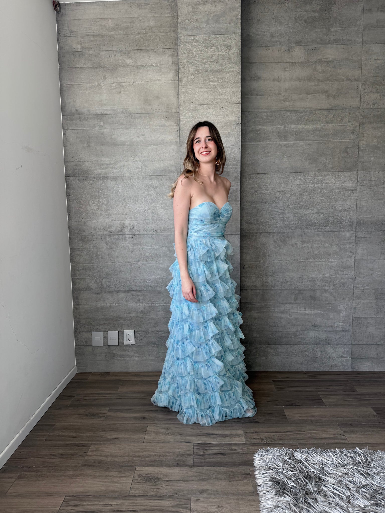 Vestido strapless largo de tul con olanes, estampado floral en azul turquesa.