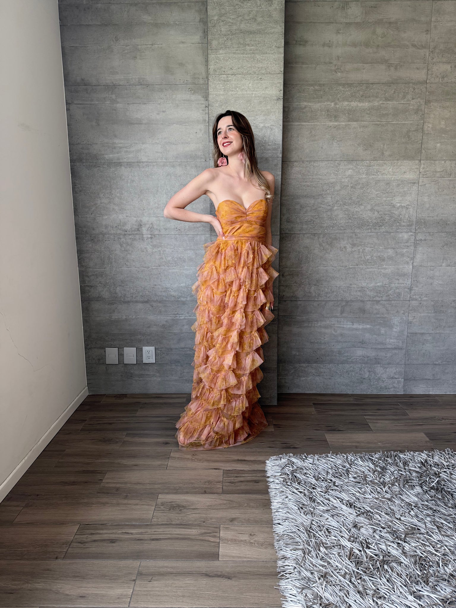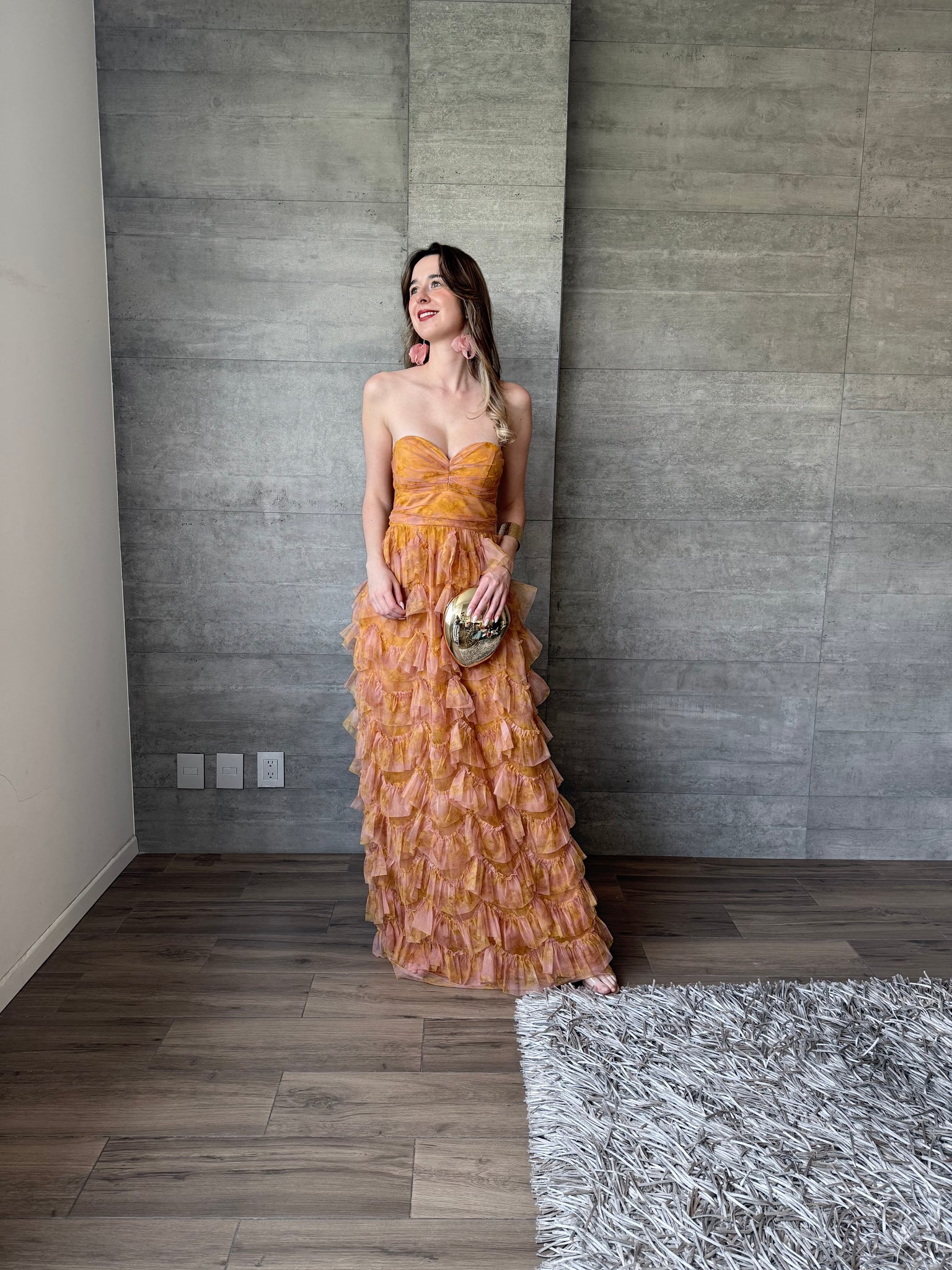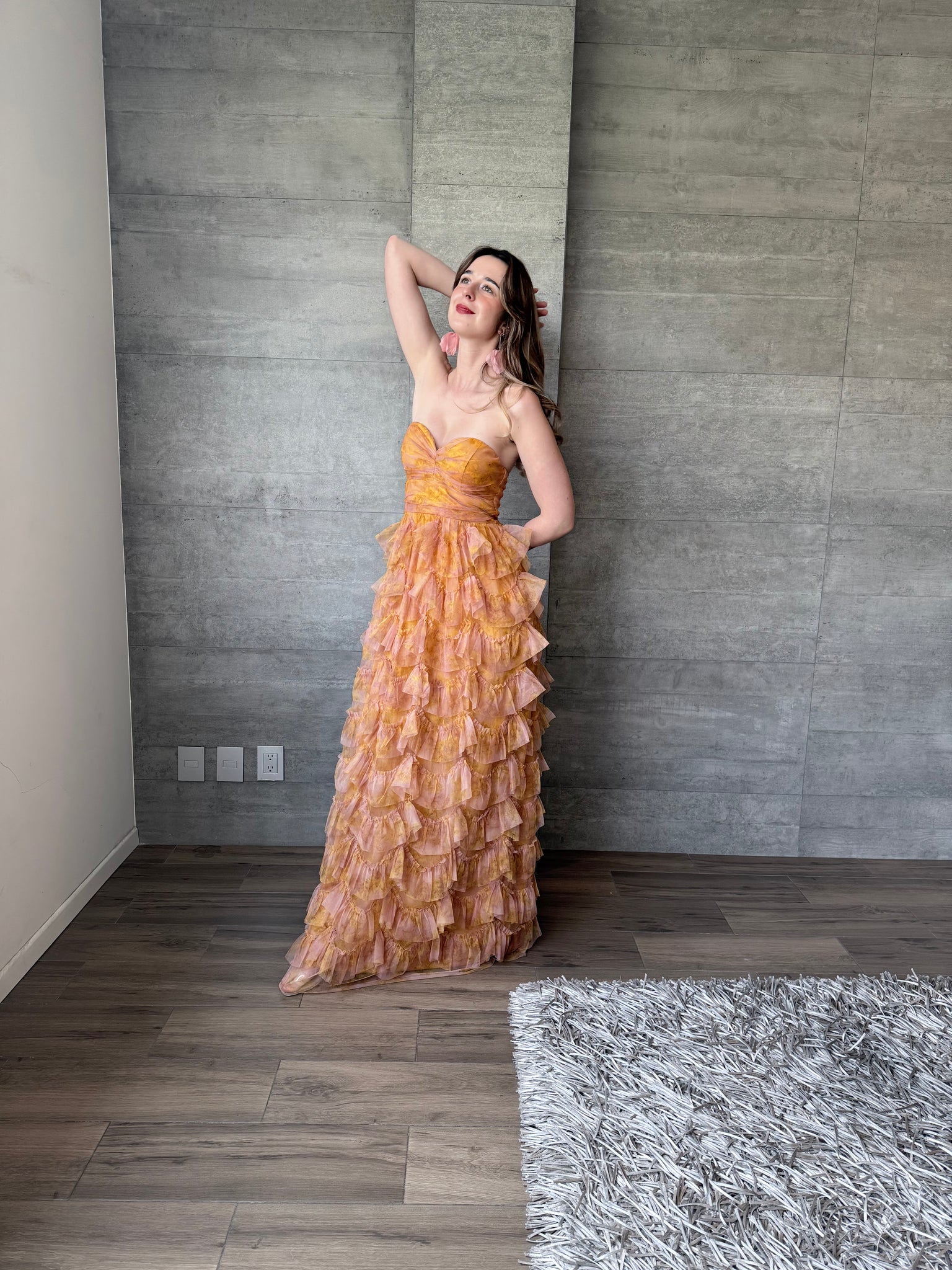 Vestido largo de tul strapless con olanes y estampado floral.