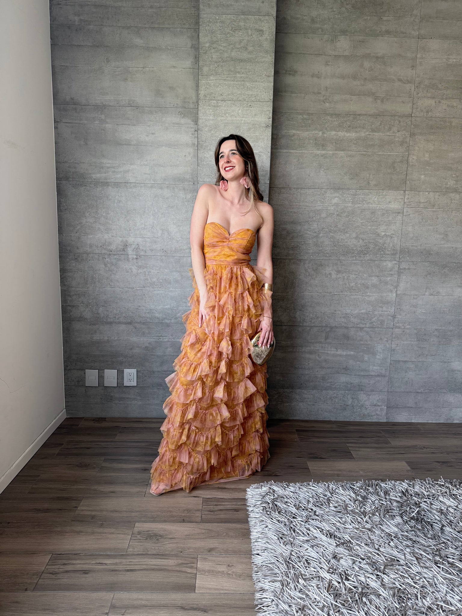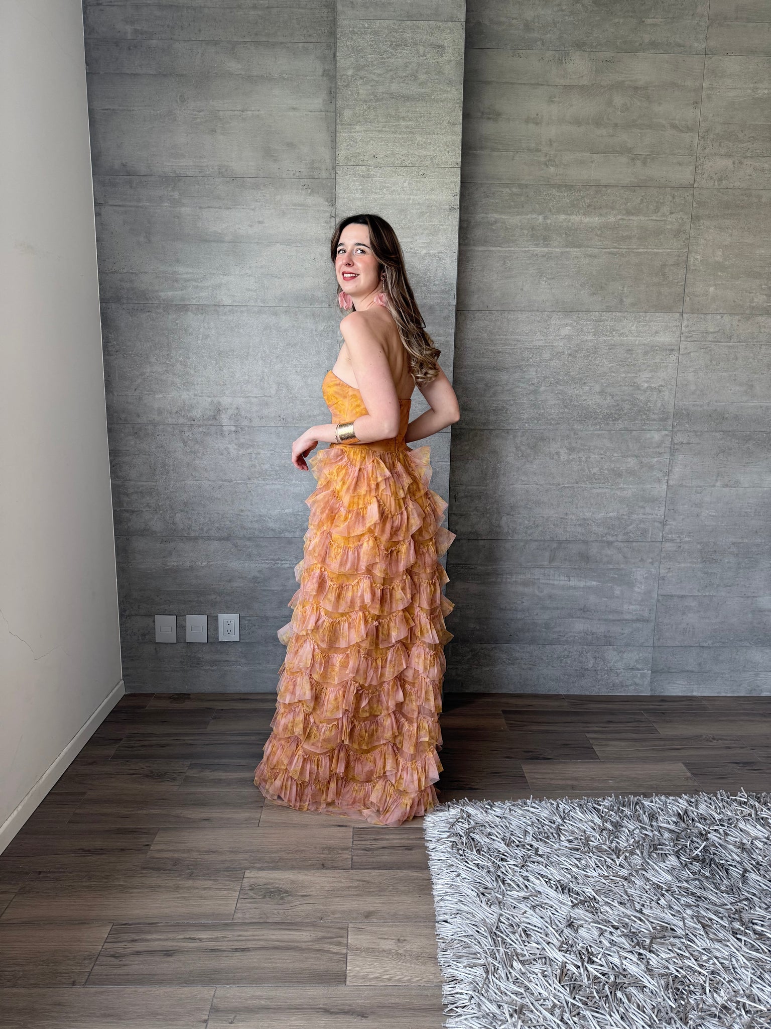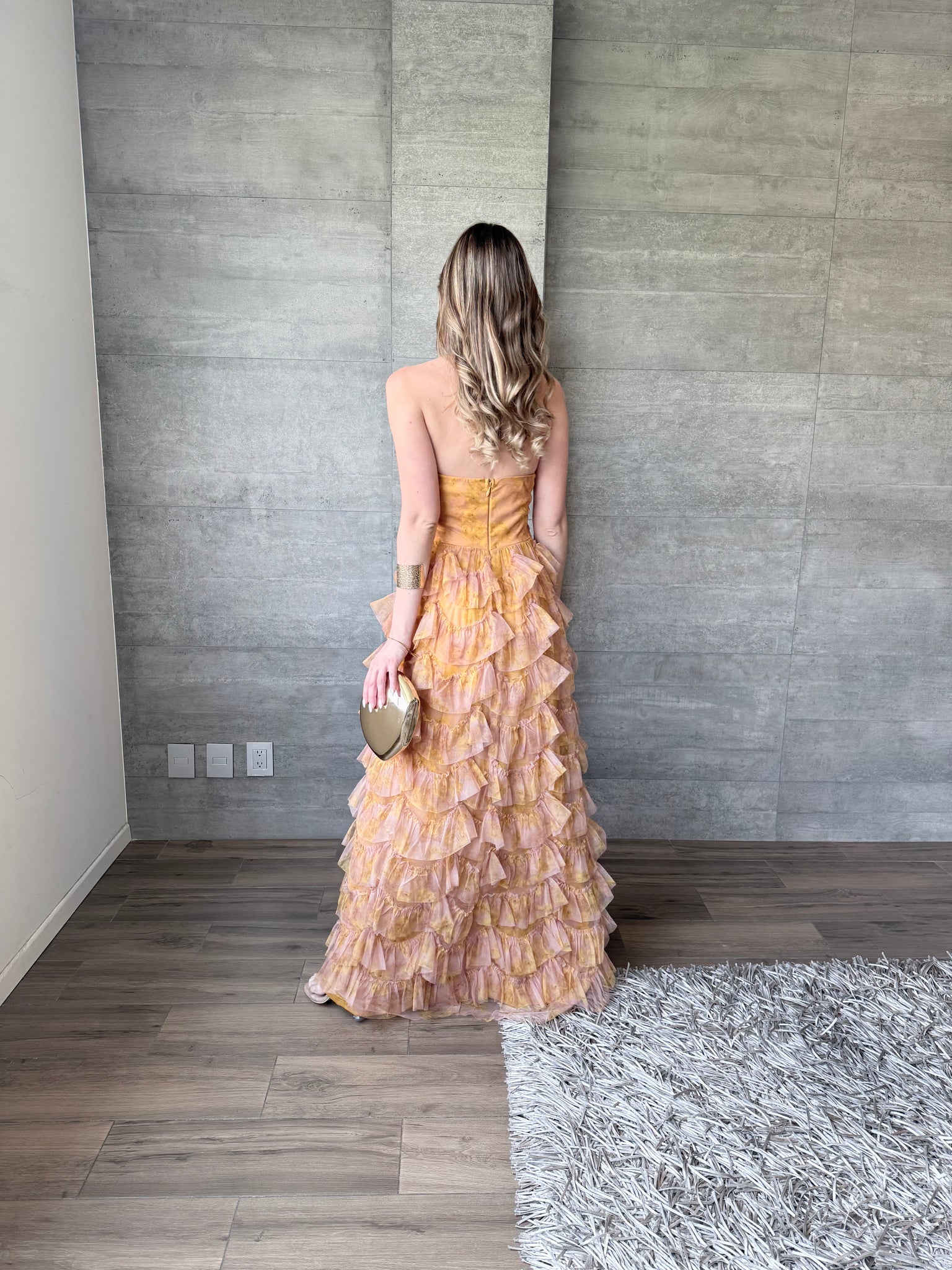 Vestido largo de tul strapless con olanes y estampado floral.