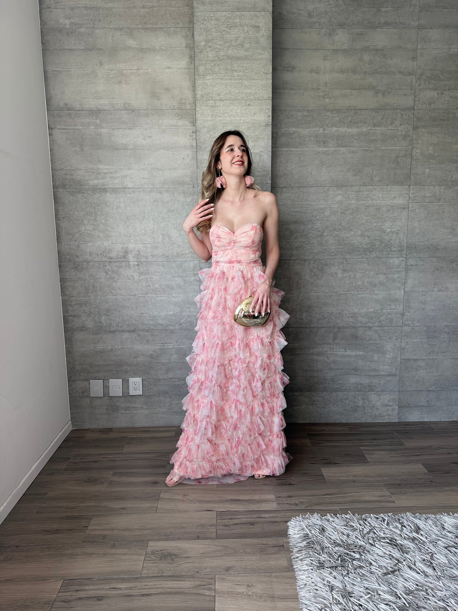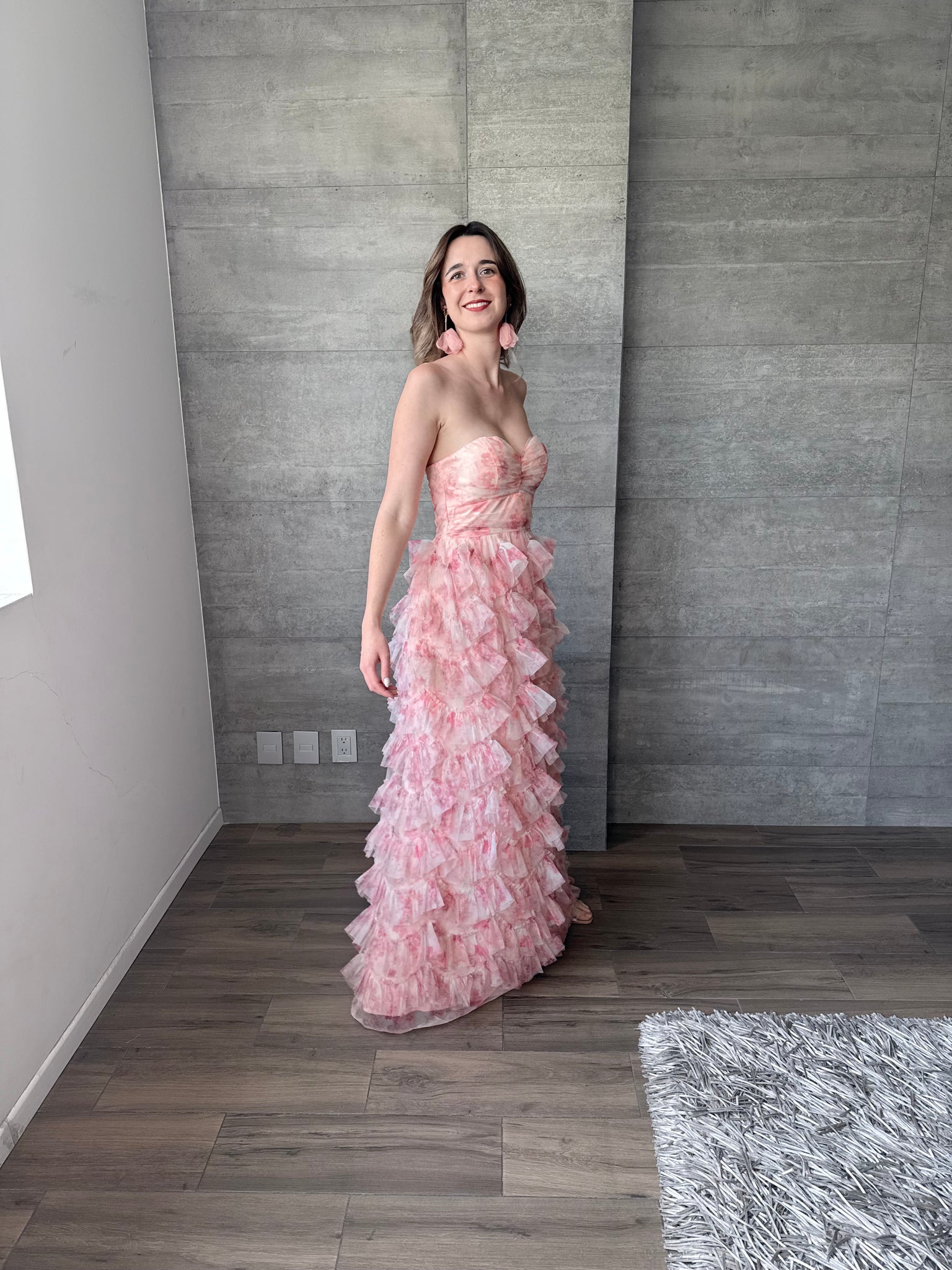 Vestido largo strapless de tul con olanes y estampado floral.