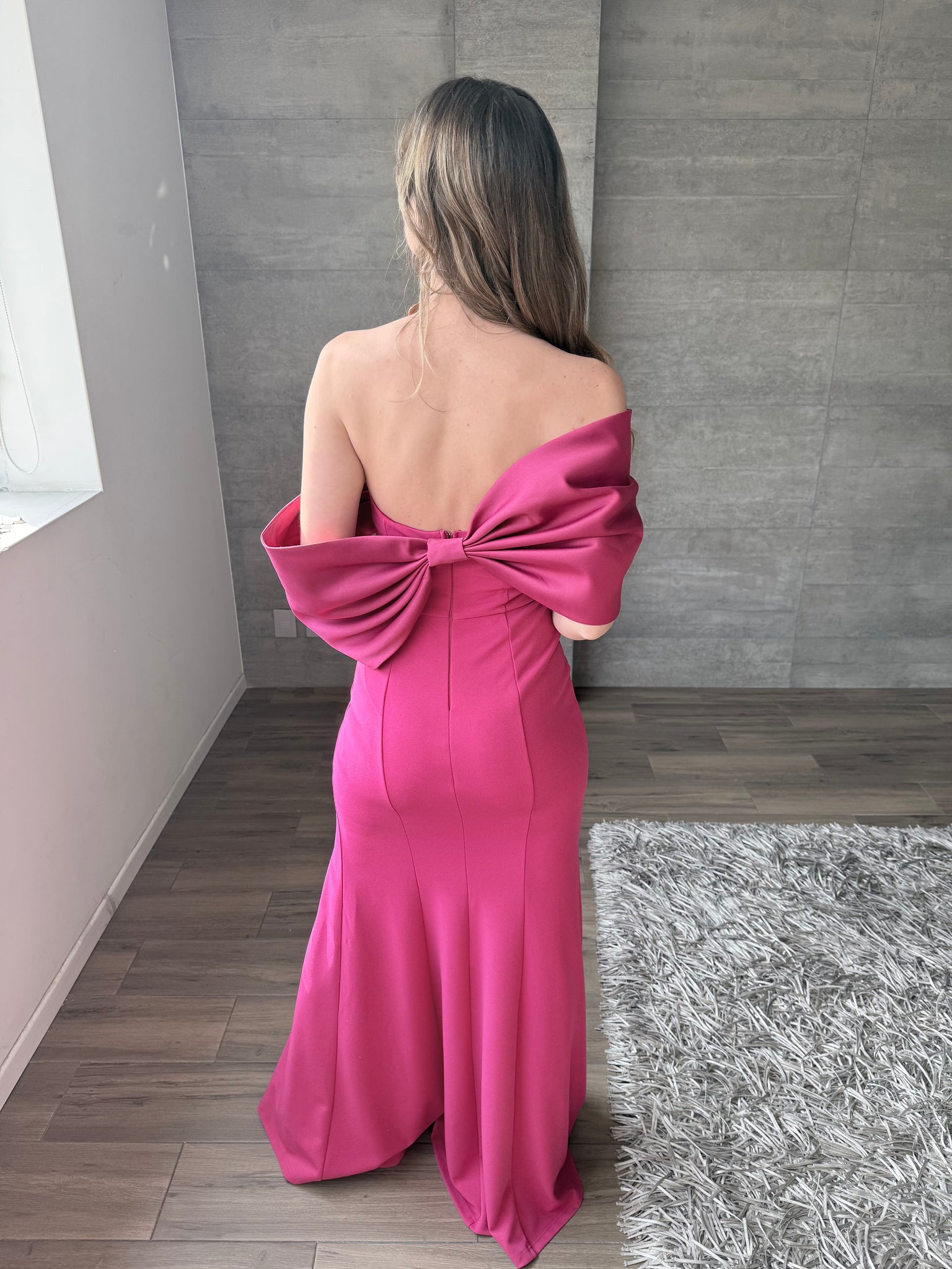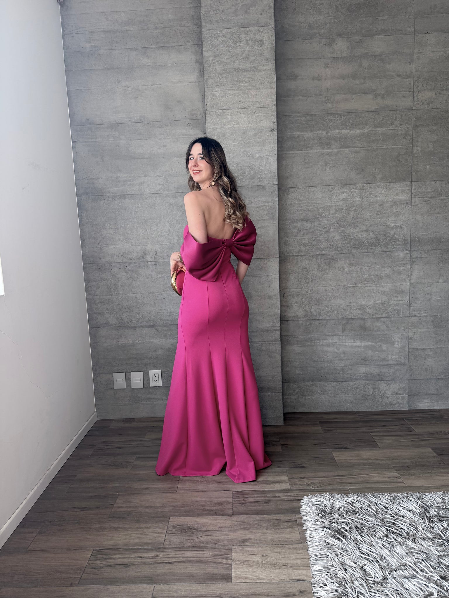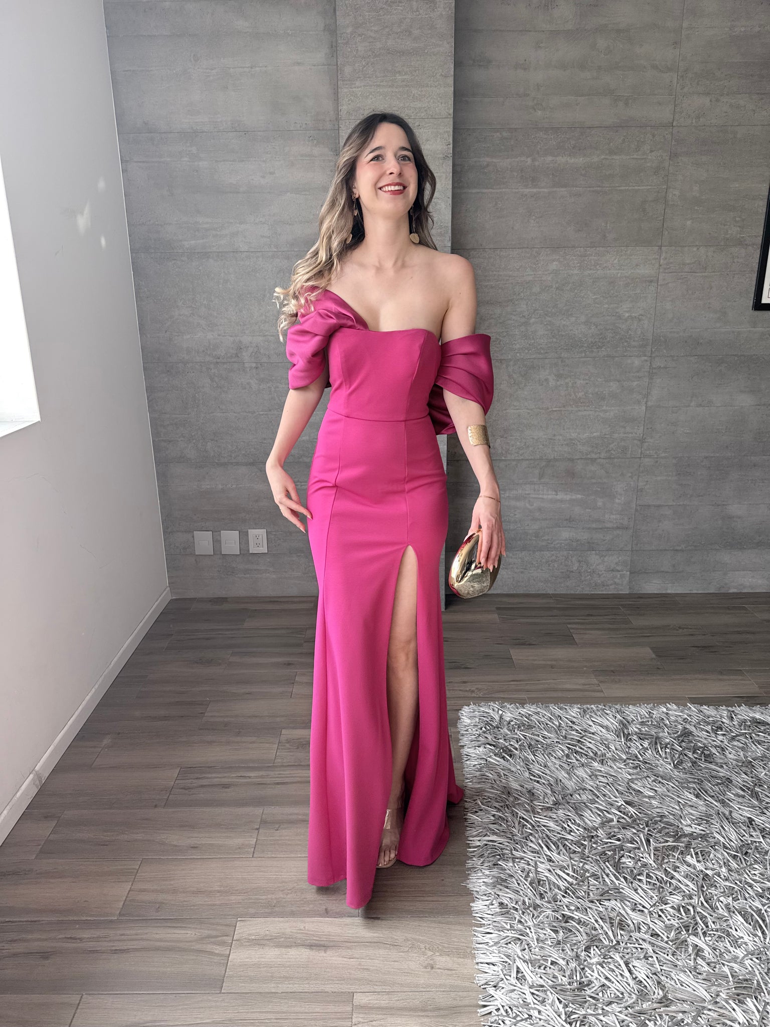 Vestido largo con hombros caídos y abertura en pierna. Moño en espalda.