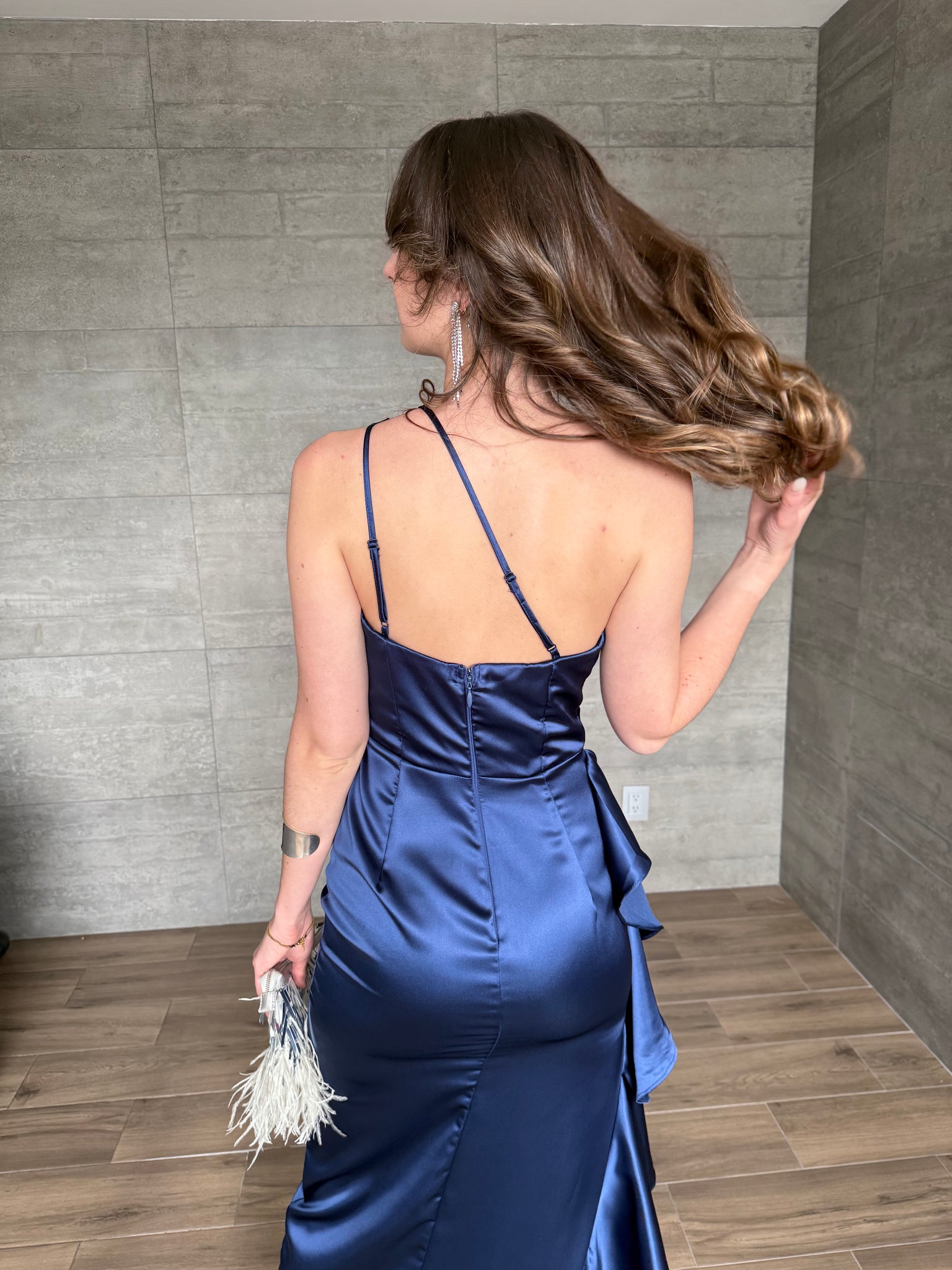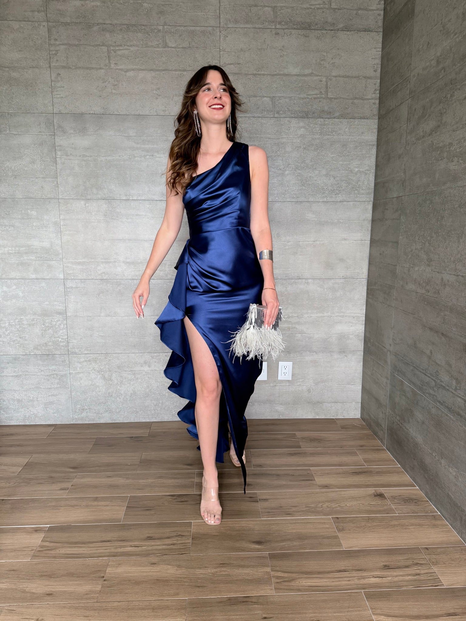 Vestido largo satinado asimétrico con olanes laterales y abertura en pierna.
