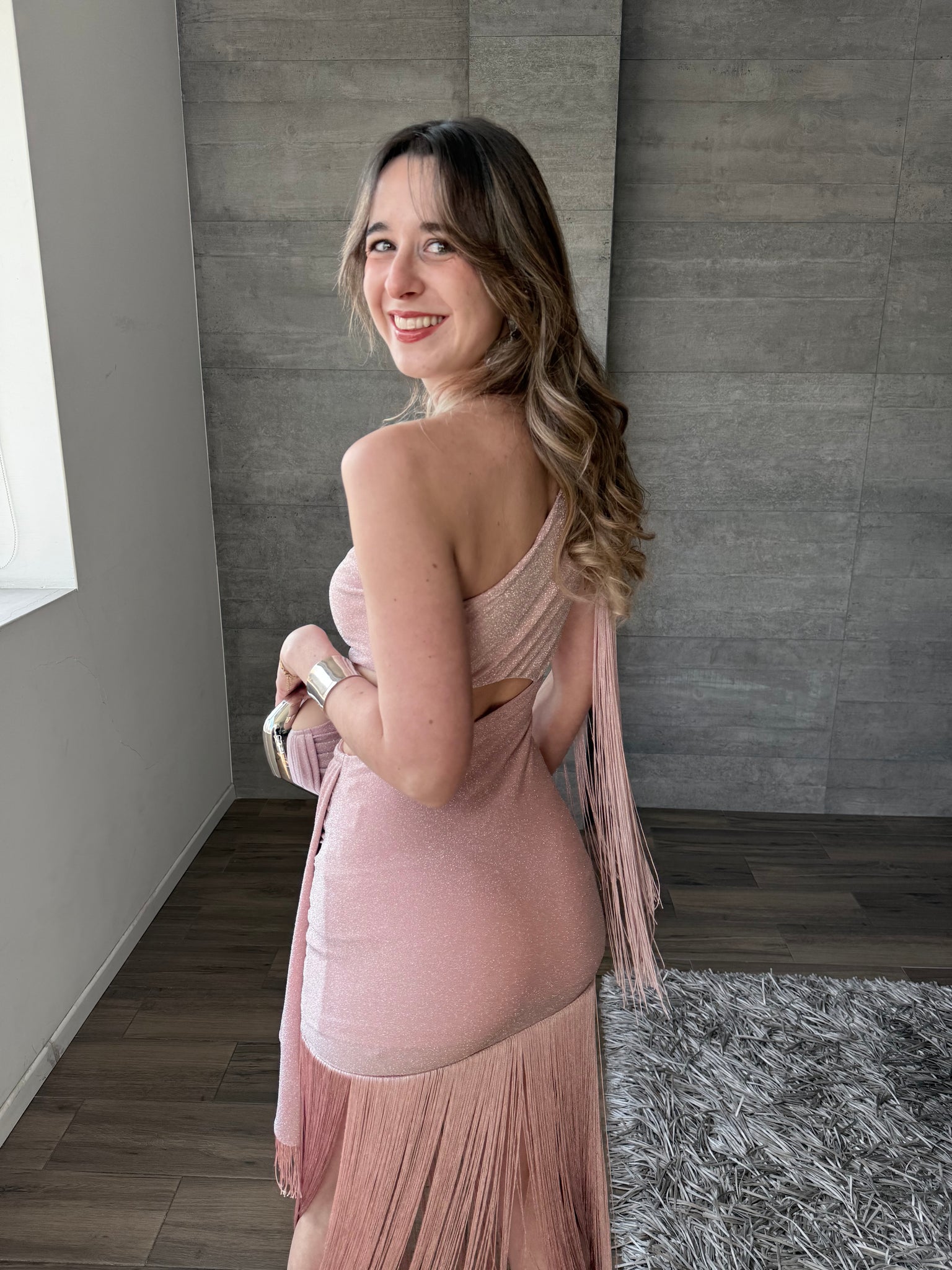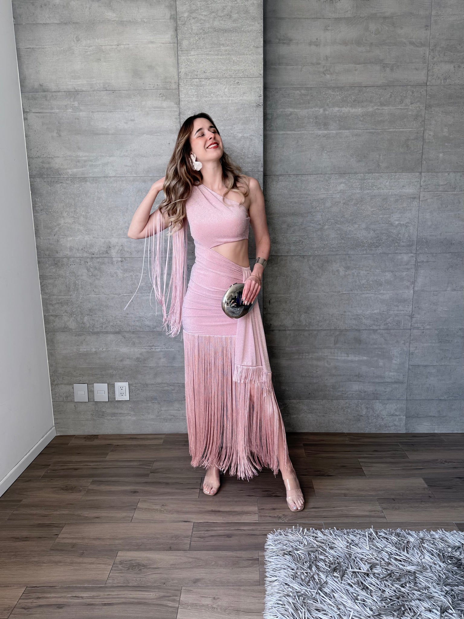 Vestido midi con flecos, un hombro asimétrico con hombrera, cutout en cintura.