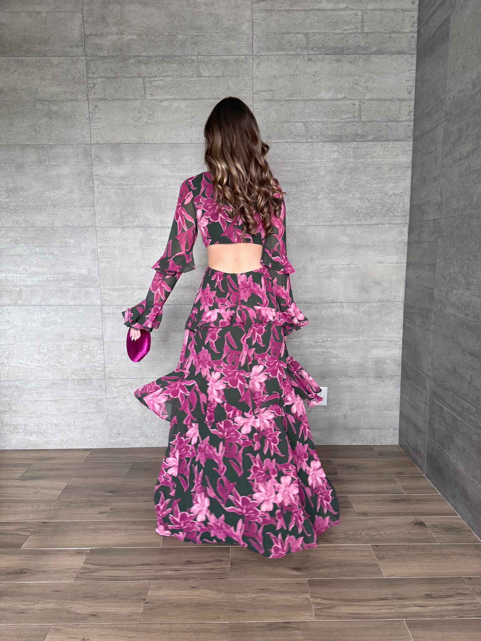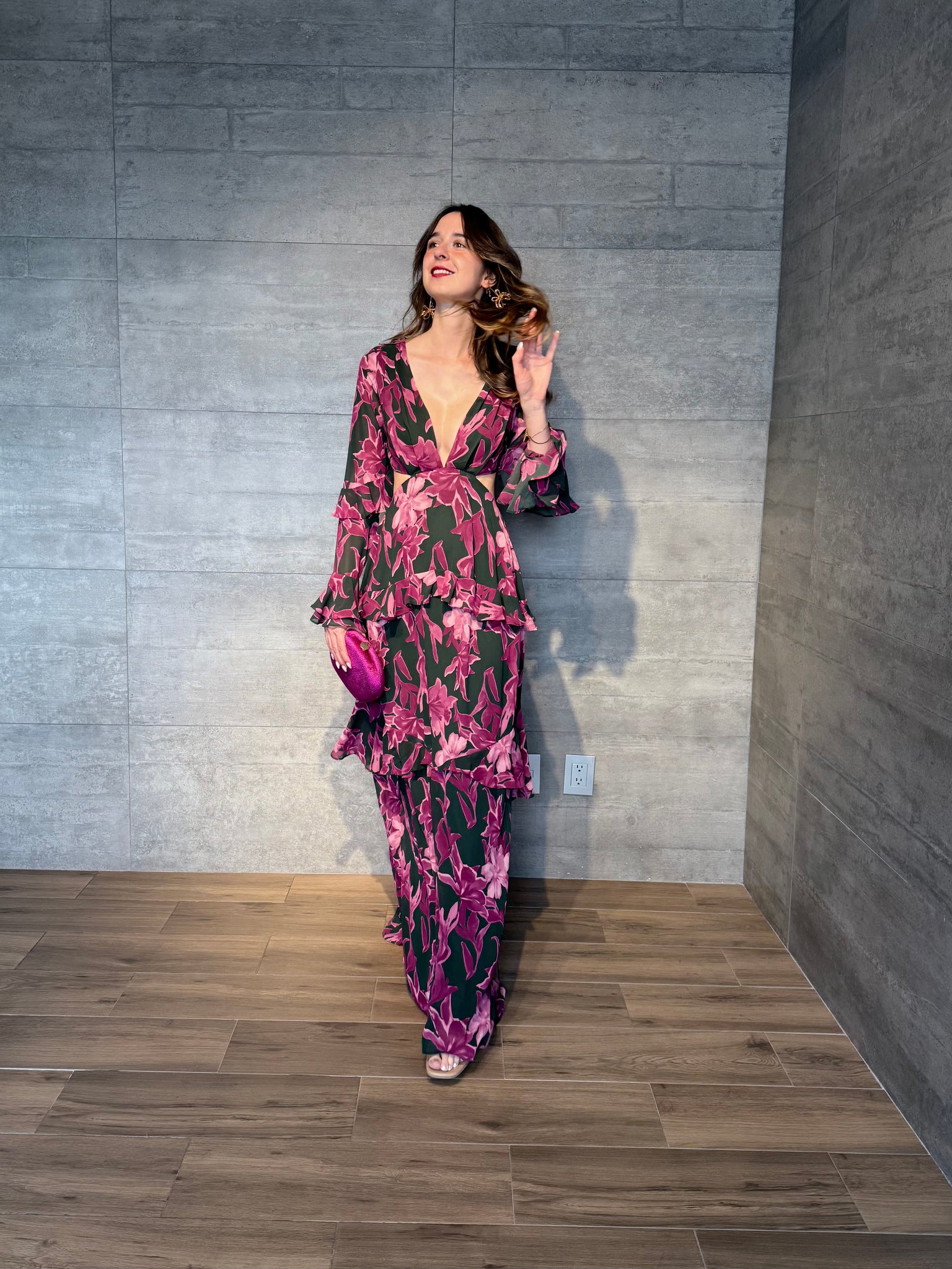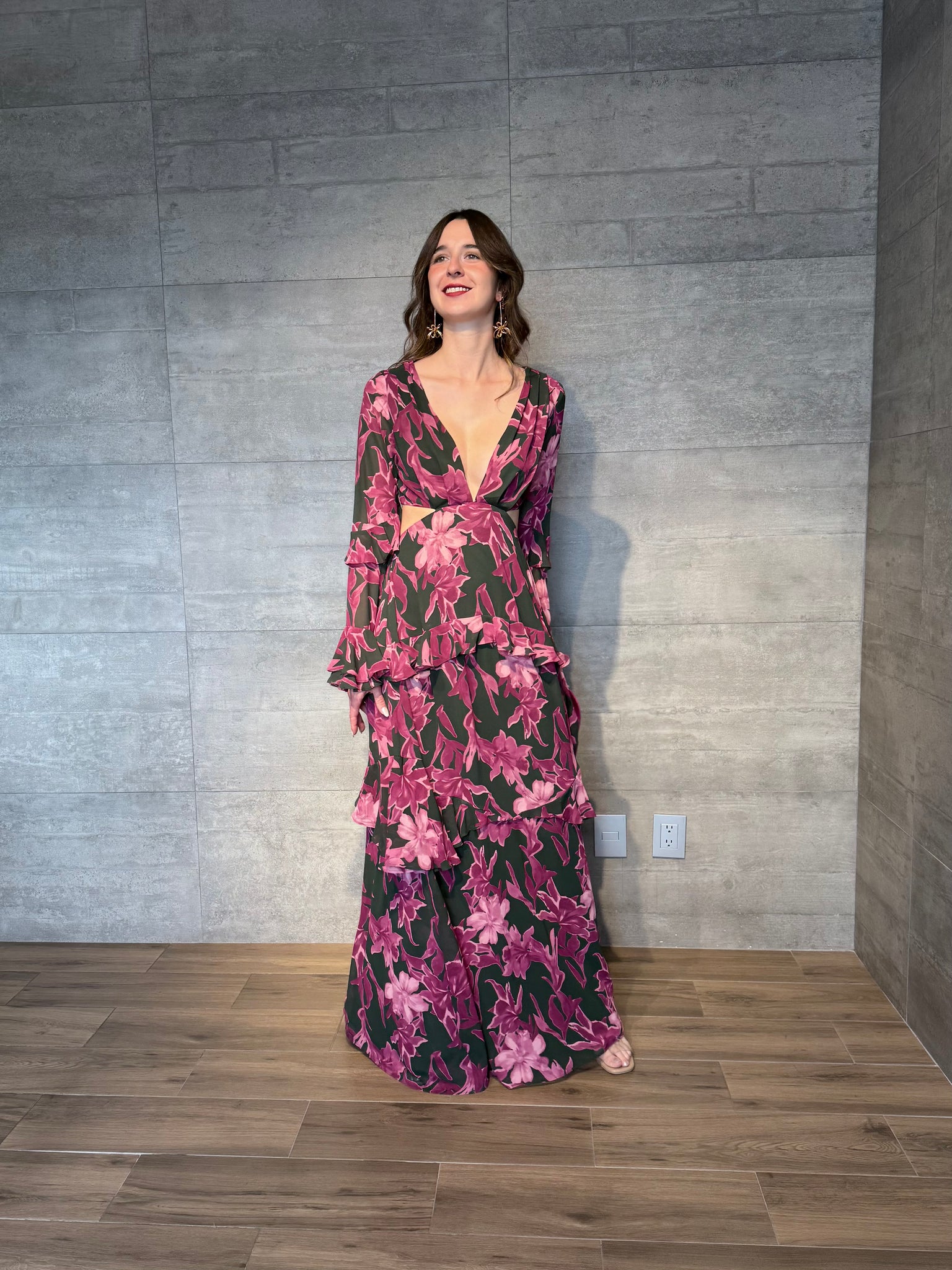 Vestido largo con mangas, escote en V y cutout en cintura. Estampado floral.