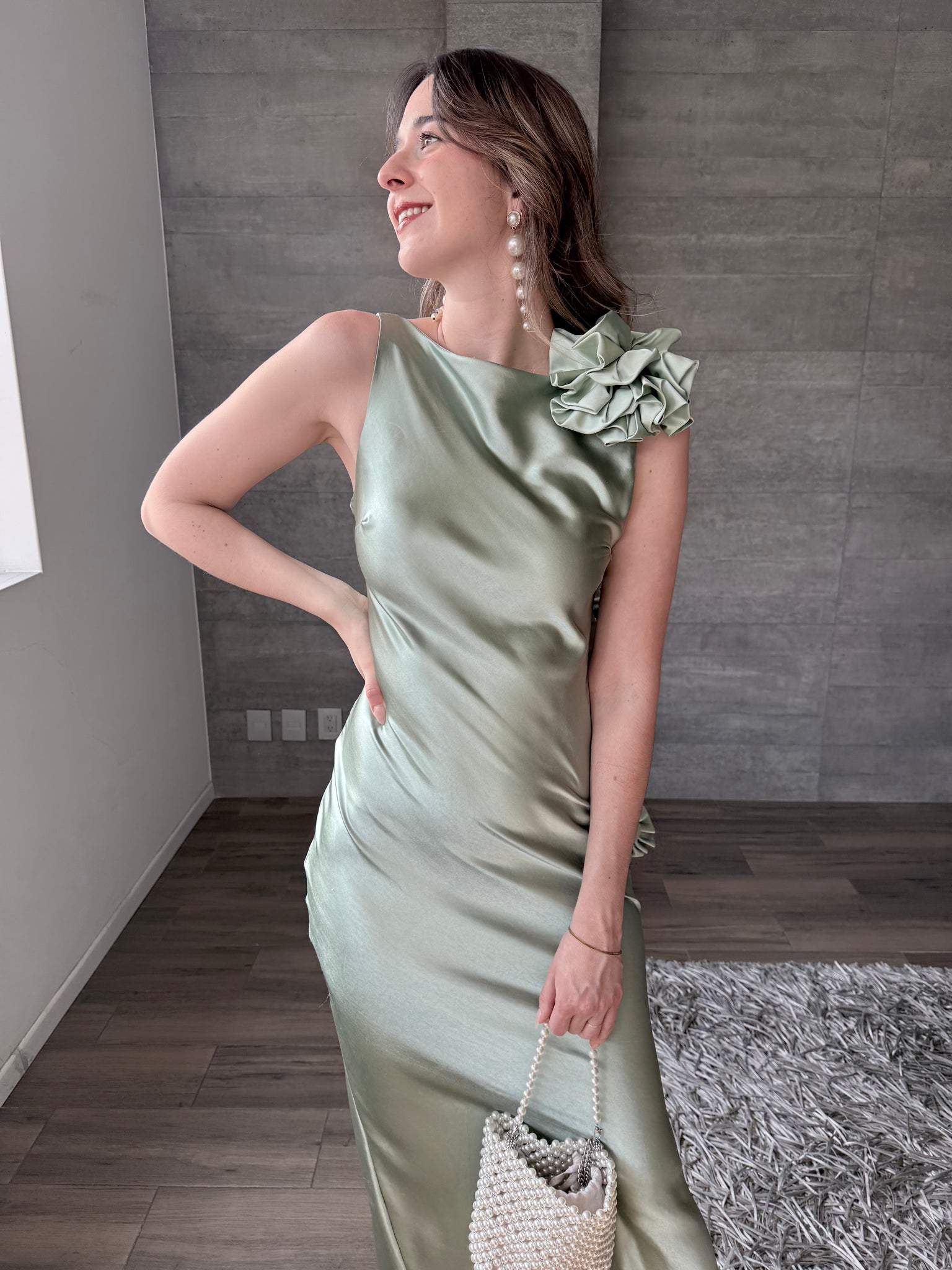 Vestido largo de satín con escote en espalda y detalle de flor colgante en hombro.