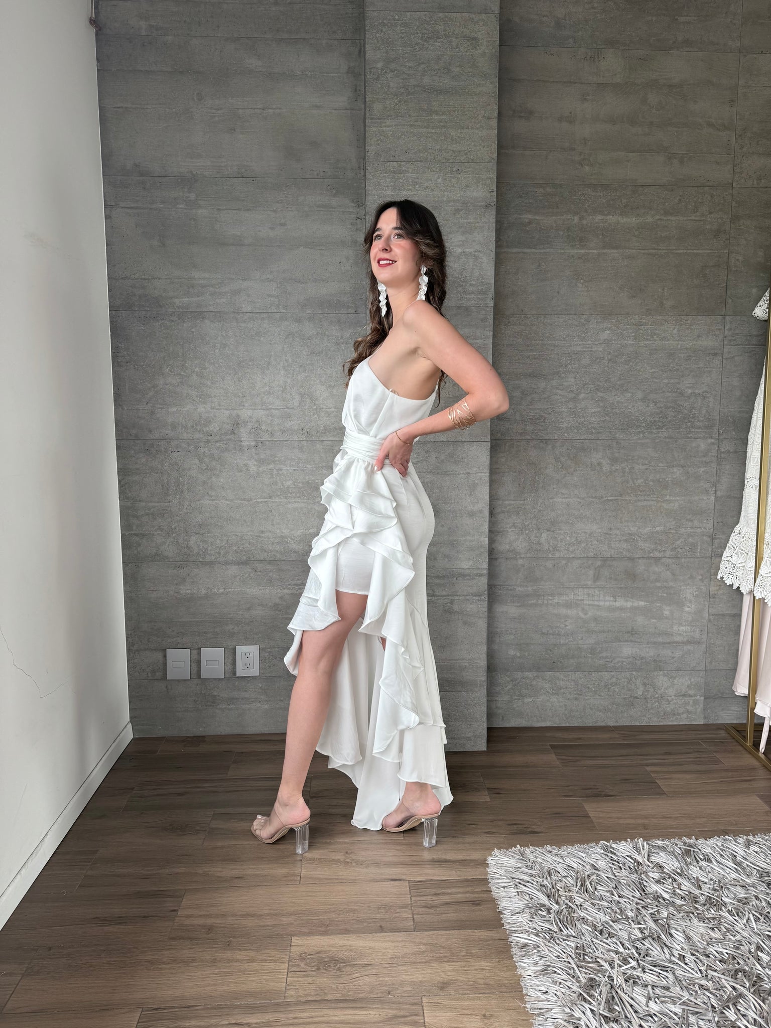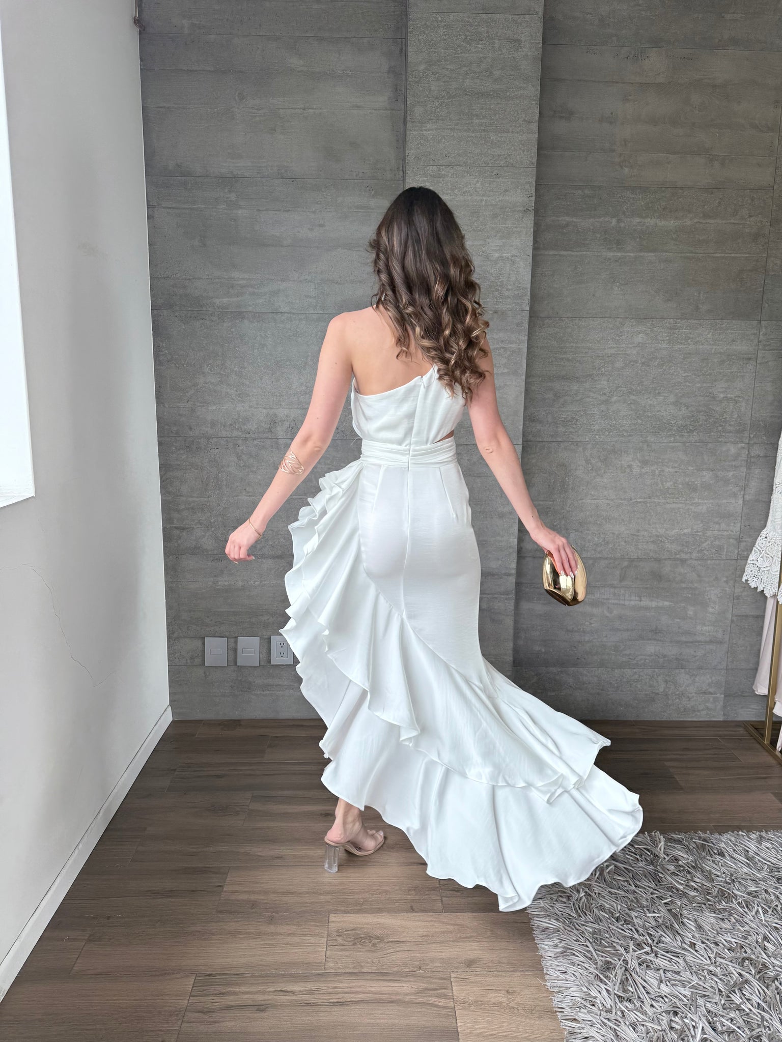 Vestido largo satinado asimetrico con olanes y cuout en cintura blanco.