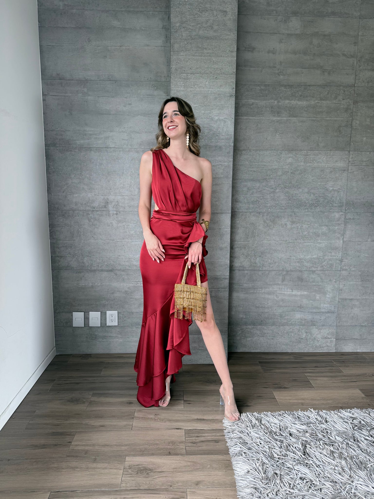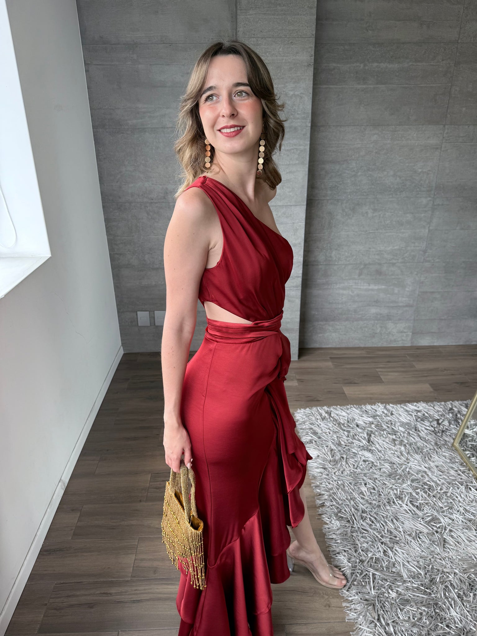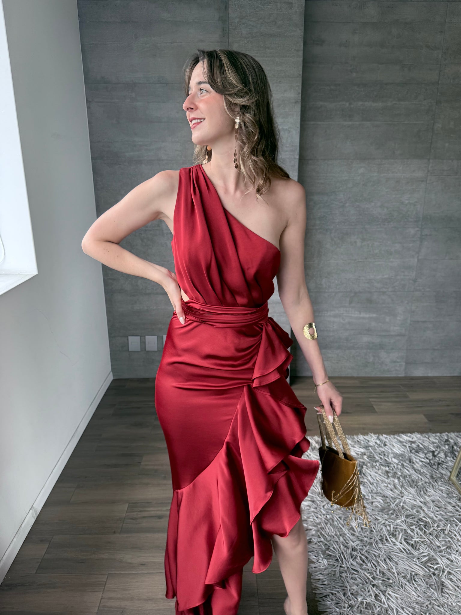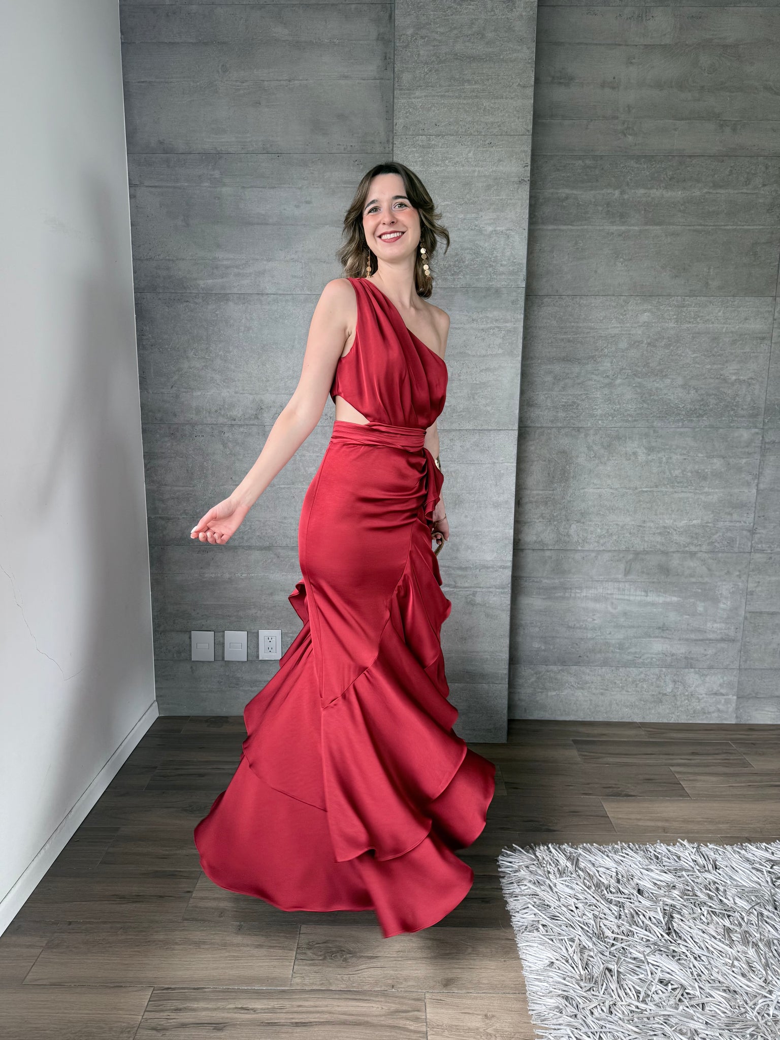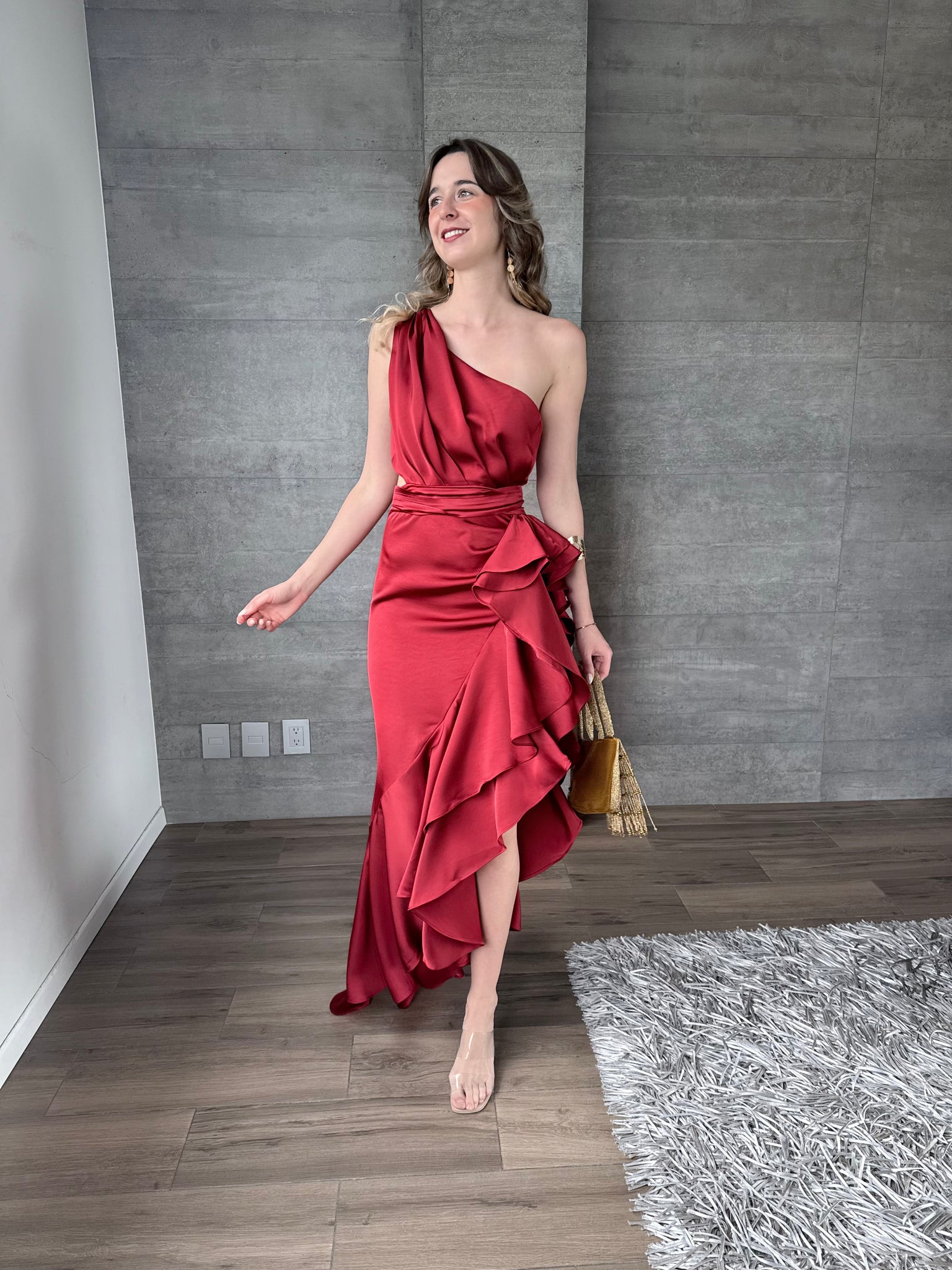 Vestido largo satinado asimétrico con olanes de un hombro y cutout en cintura.