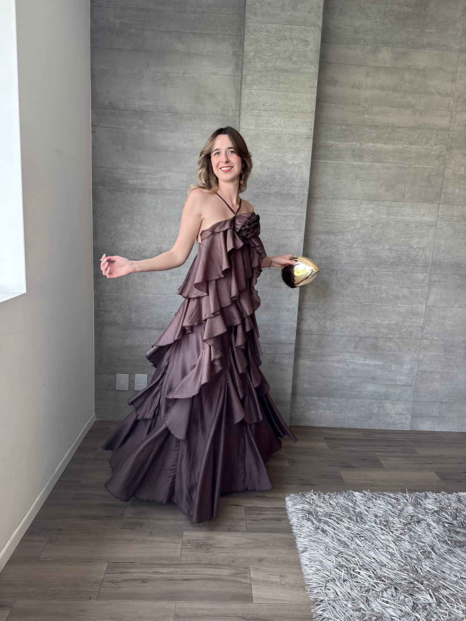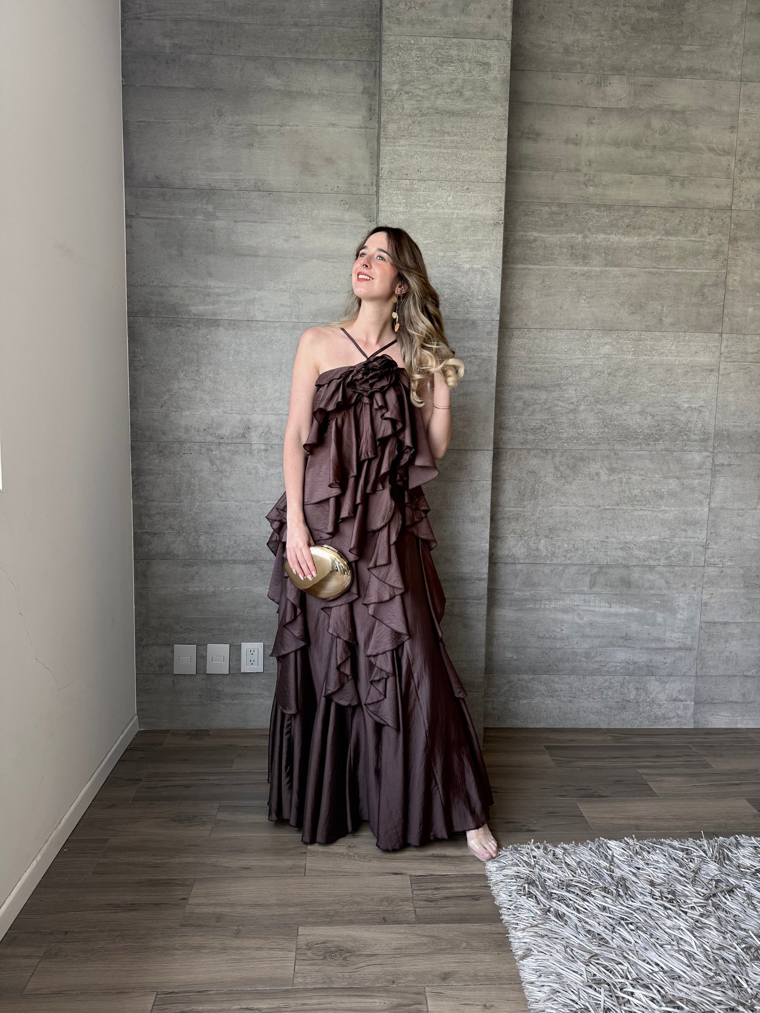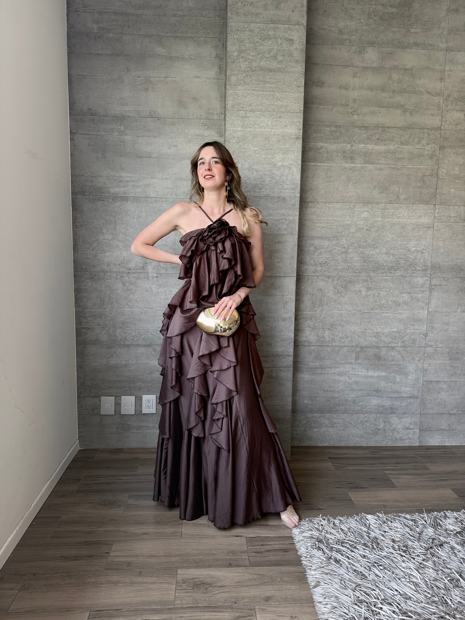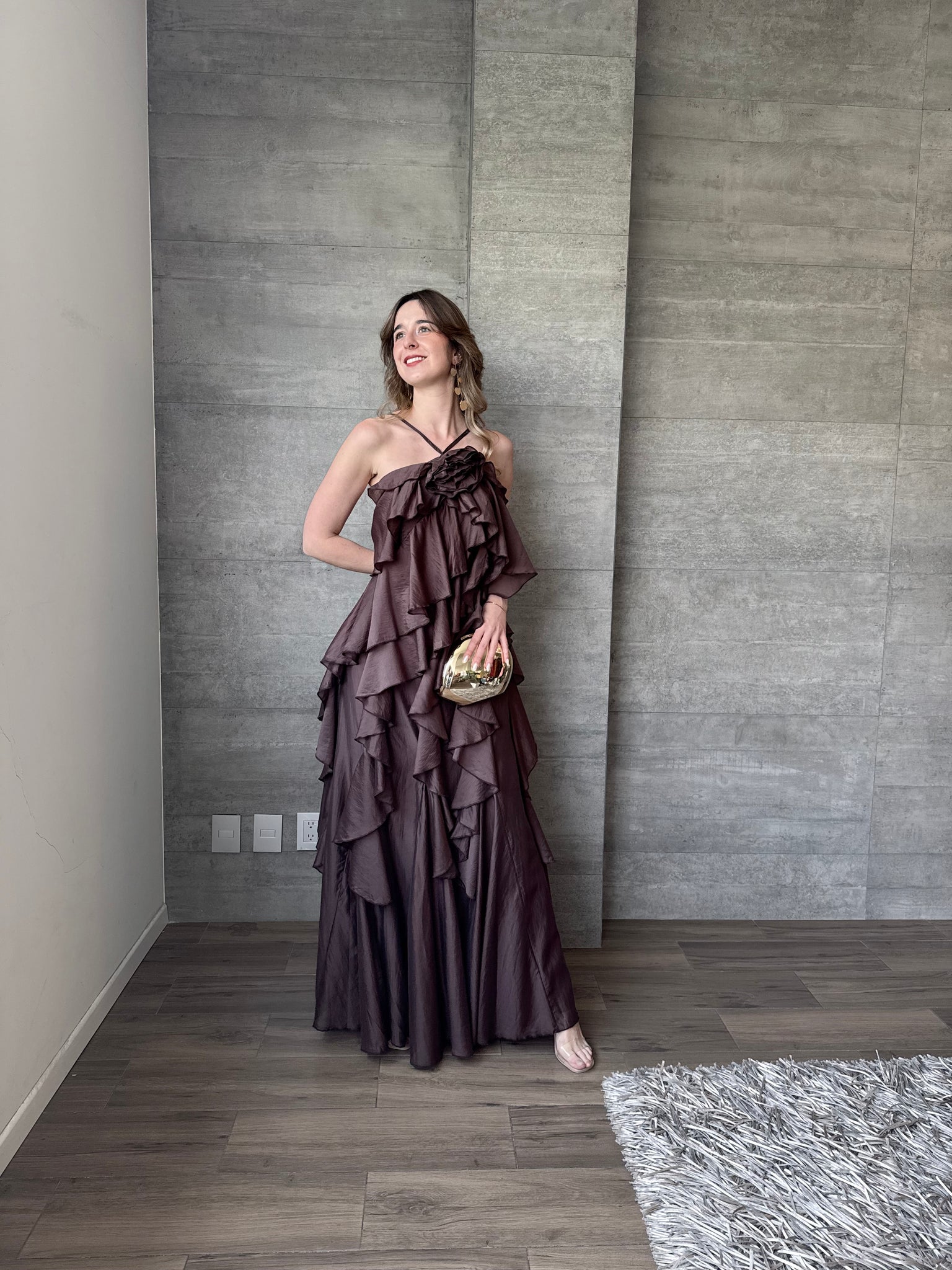 Hilda - Vestido largo con olanes color chocolate