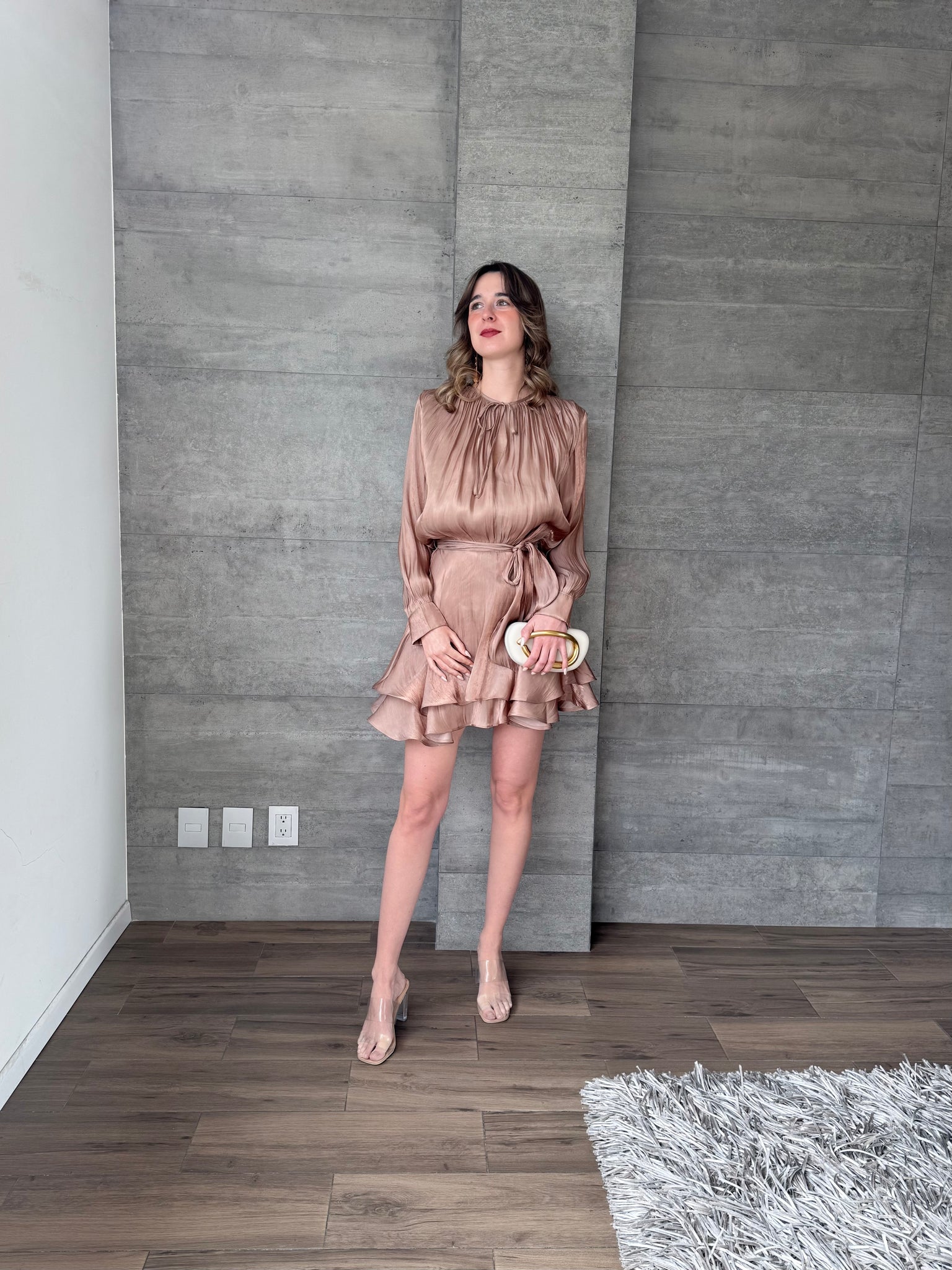 Vestido corto satinado con mangas, volantes en falda.