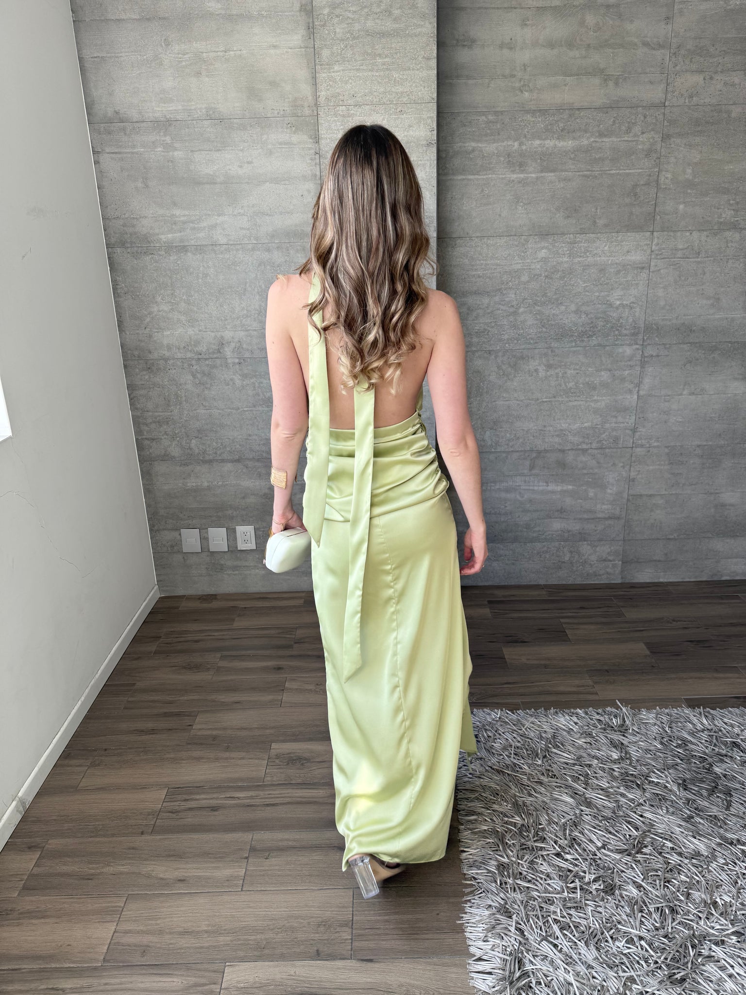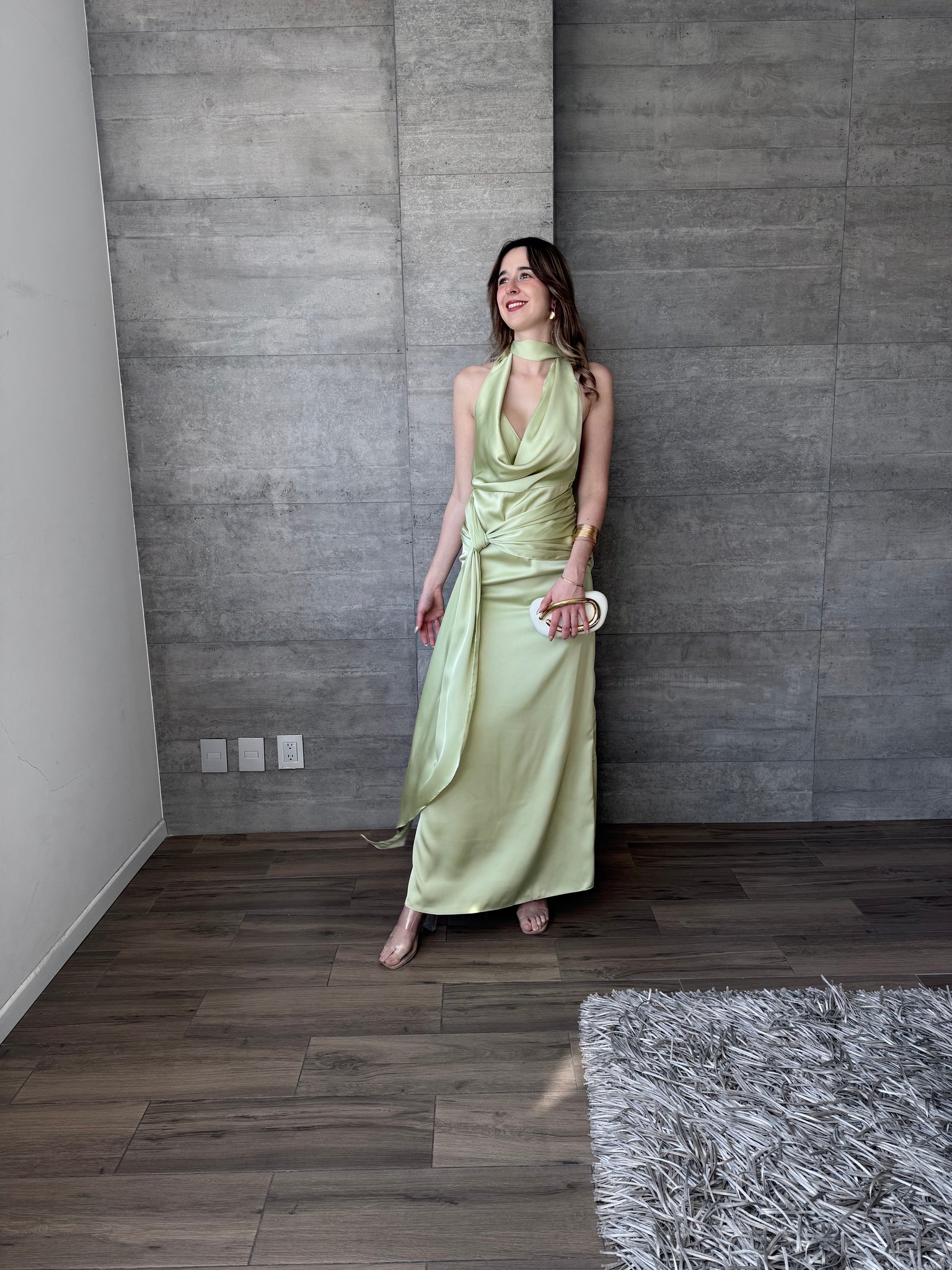 Vestido largo de satín halter con escote profundo, detalle de tela sutil en cintura.