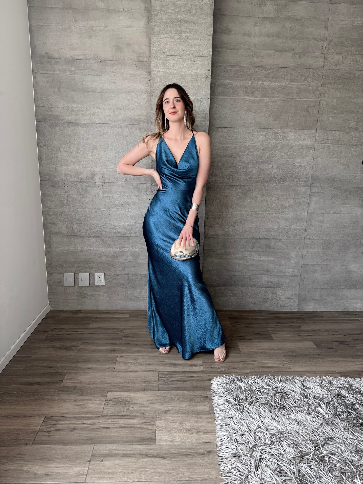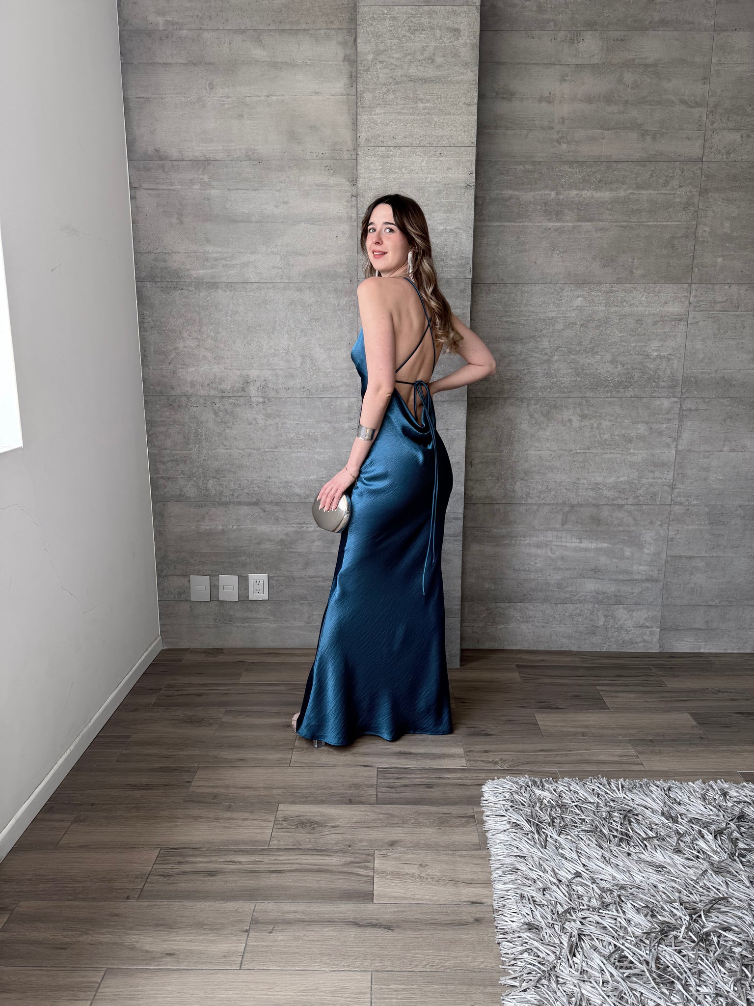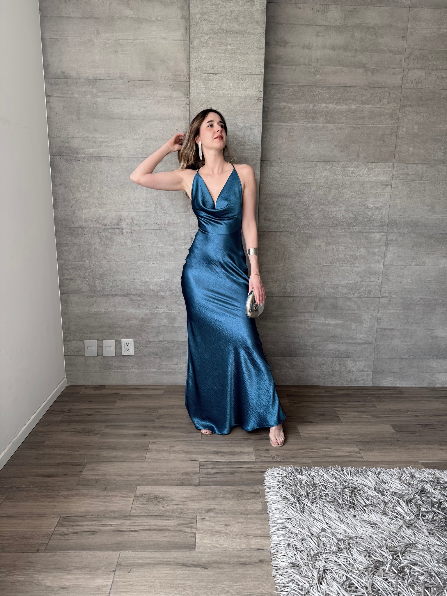 Vestido largo de satín, escote profundo y tirantes cruzados en espalda.