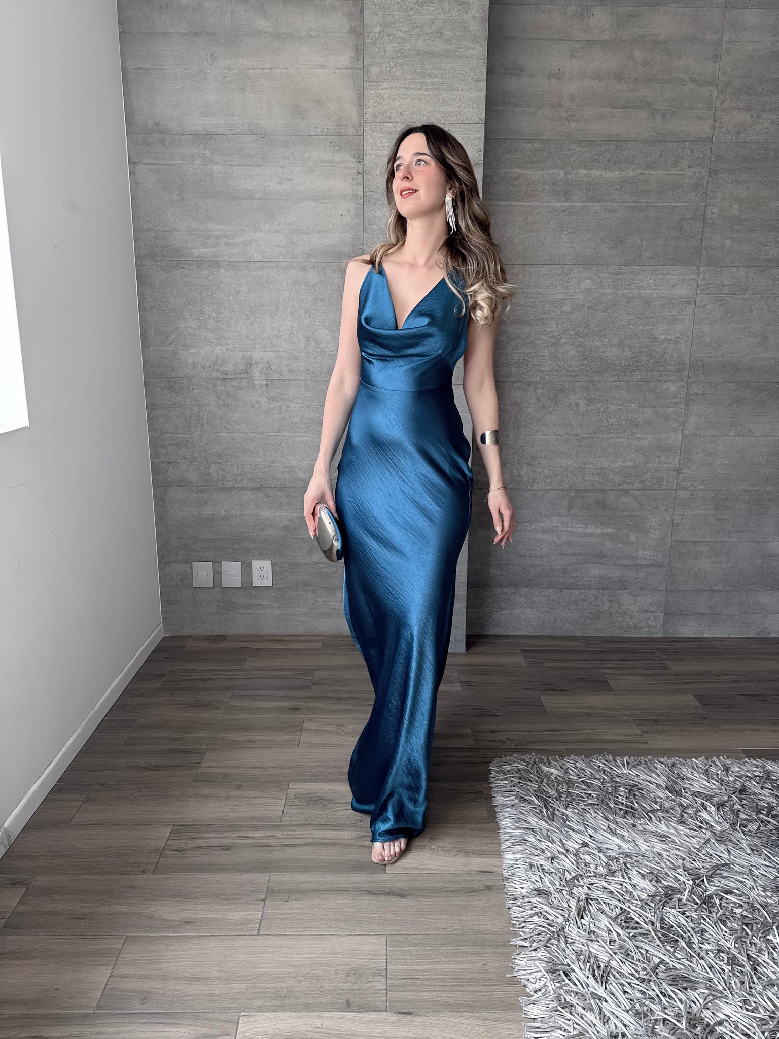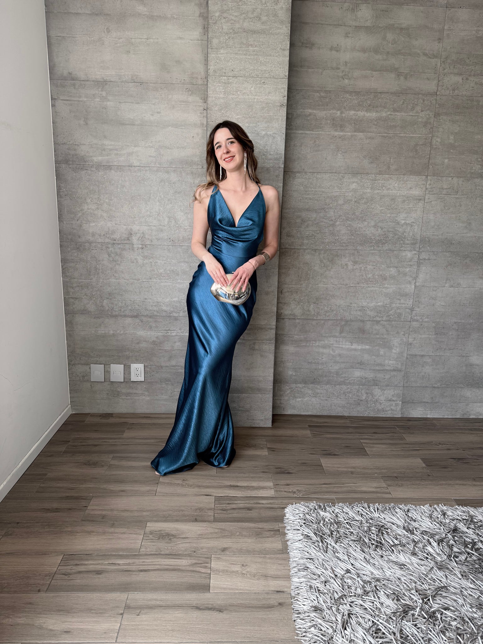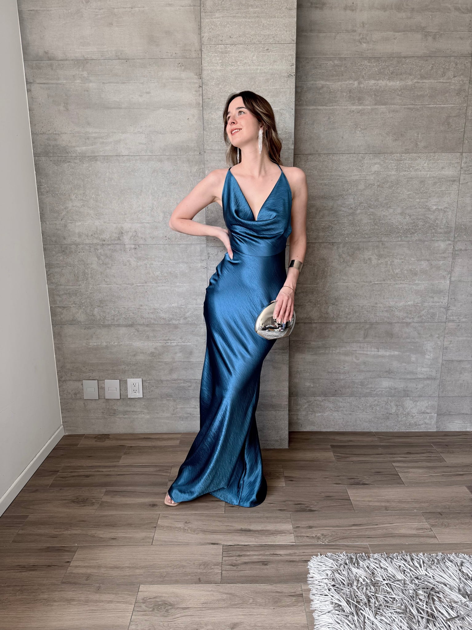 Vestido largo de satín, escote profundo y tirantes cruzados en espalda.