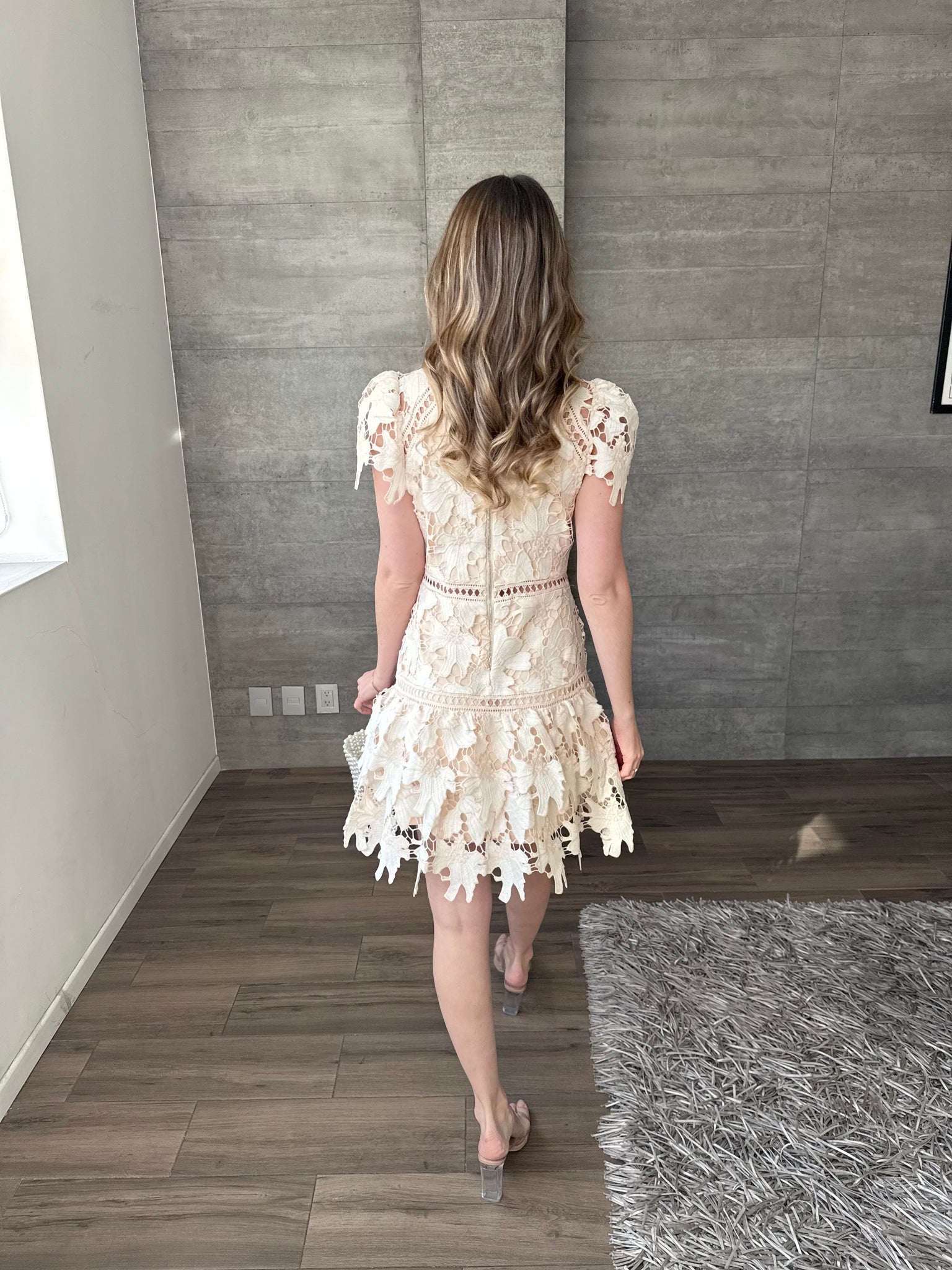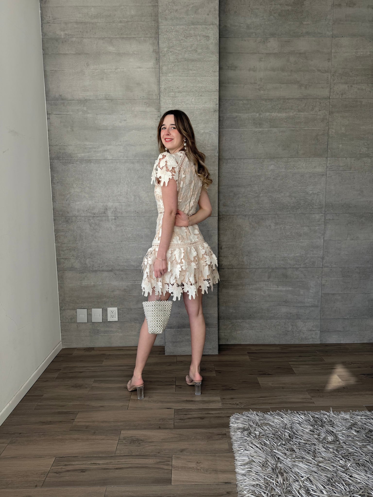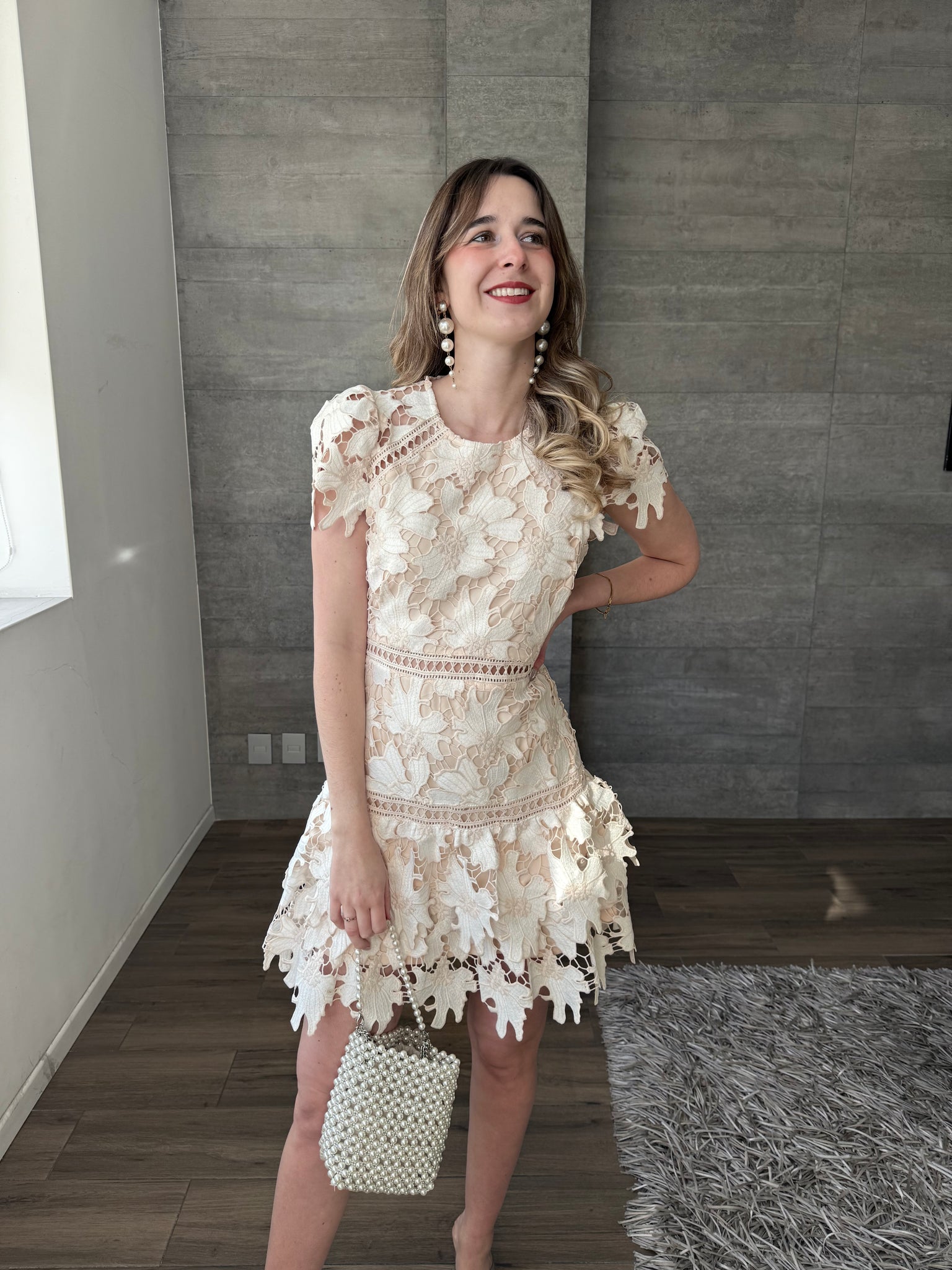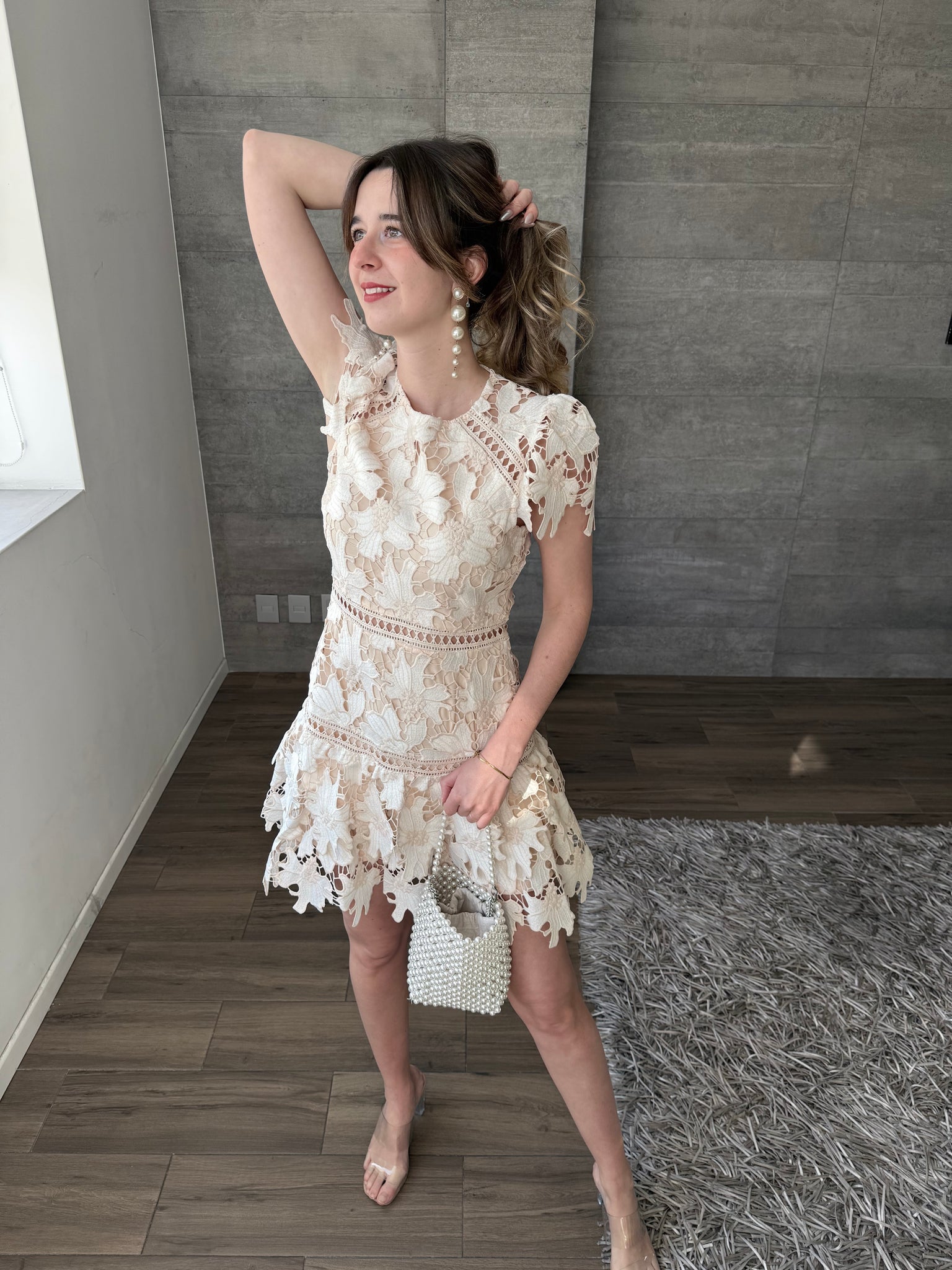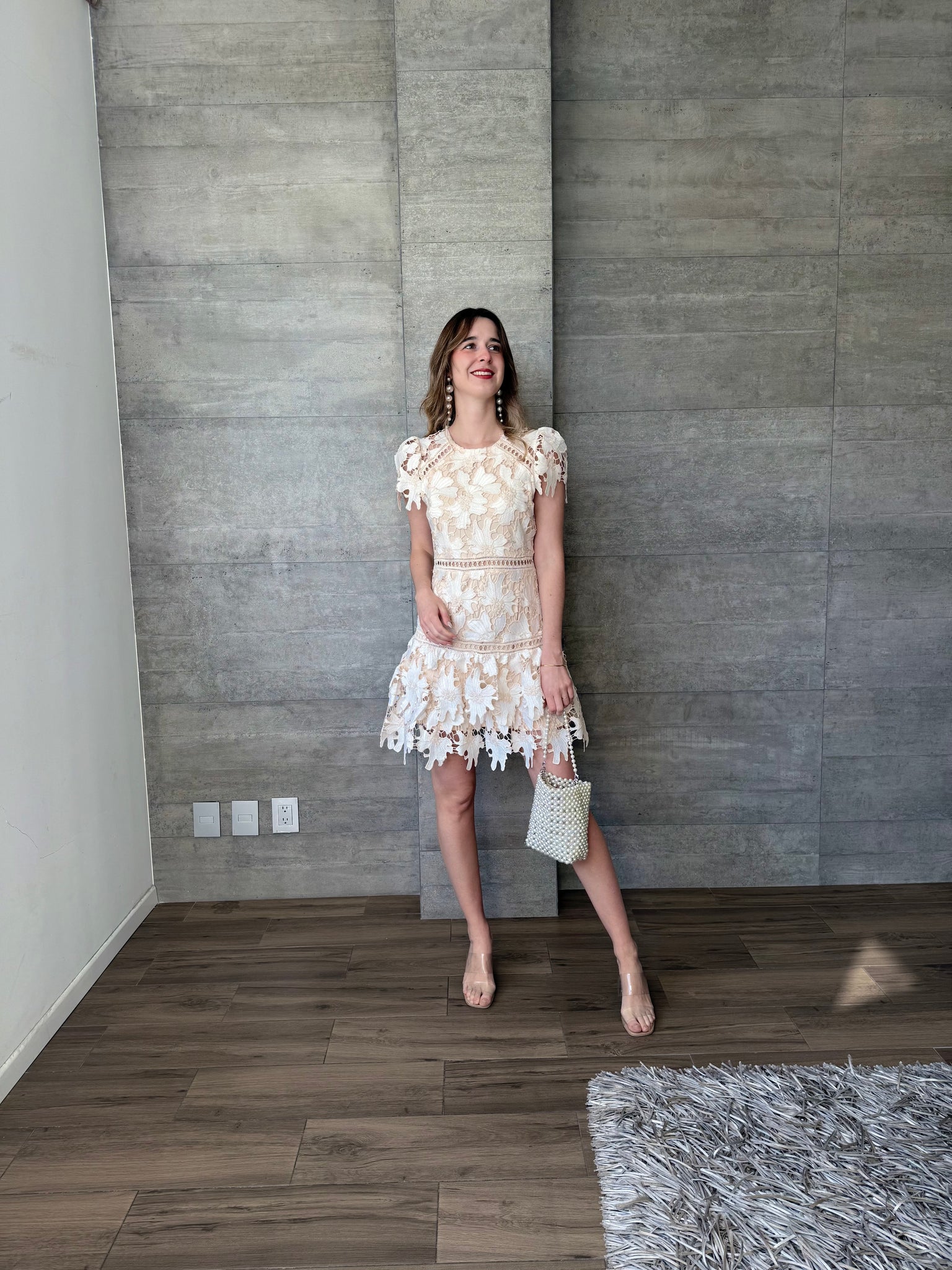 Vestido mini crochet color nude, entallado a la silueta, manga corta y falda con ligero vuelo, ideal para eventos de día y celebraciones especiales.