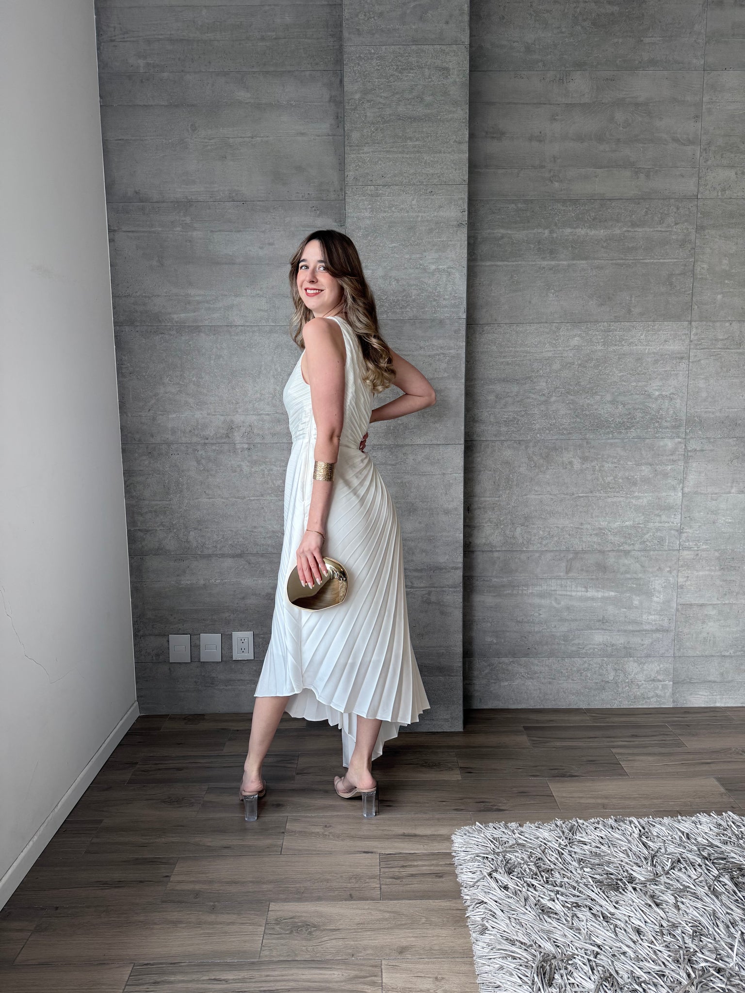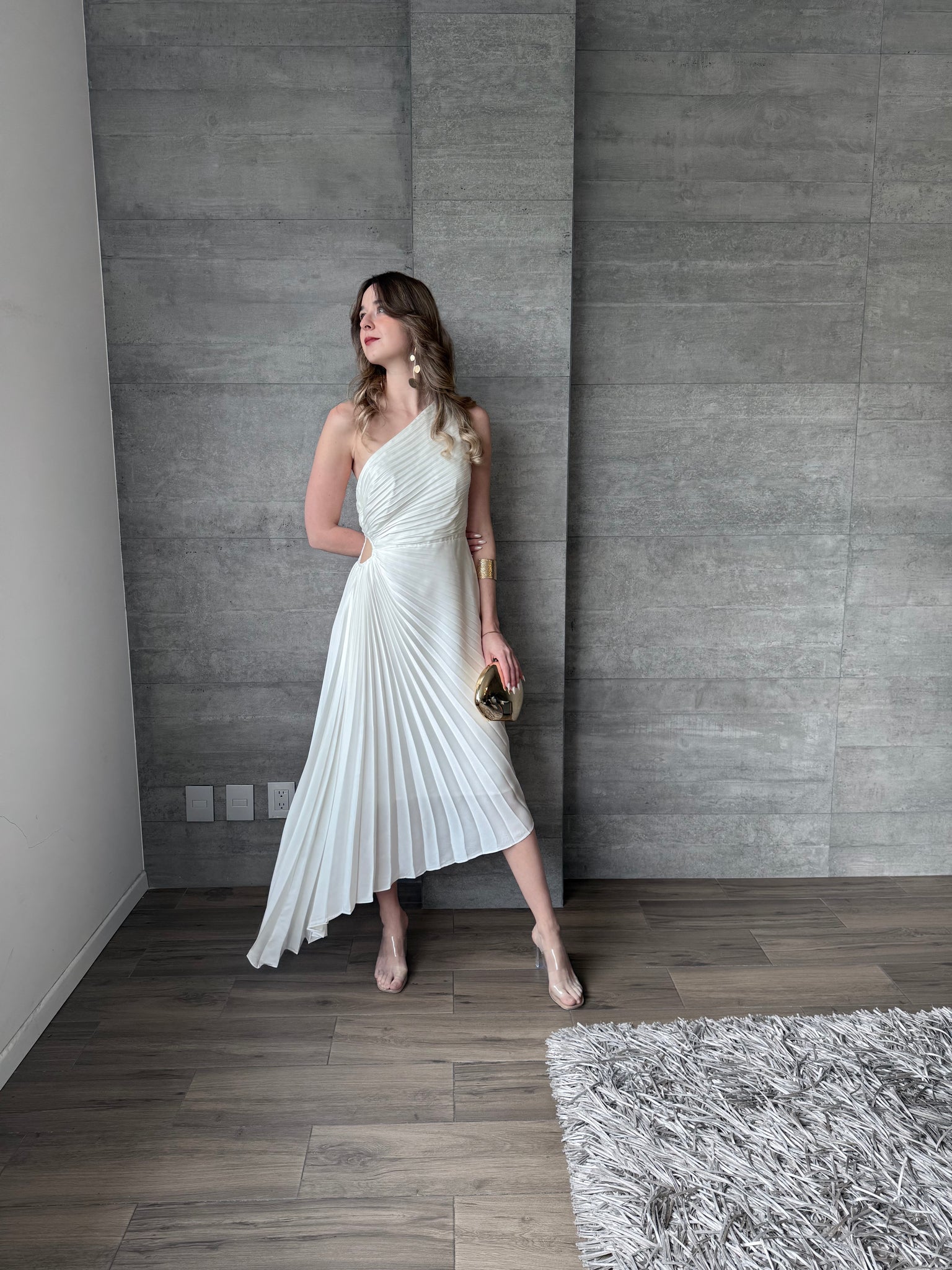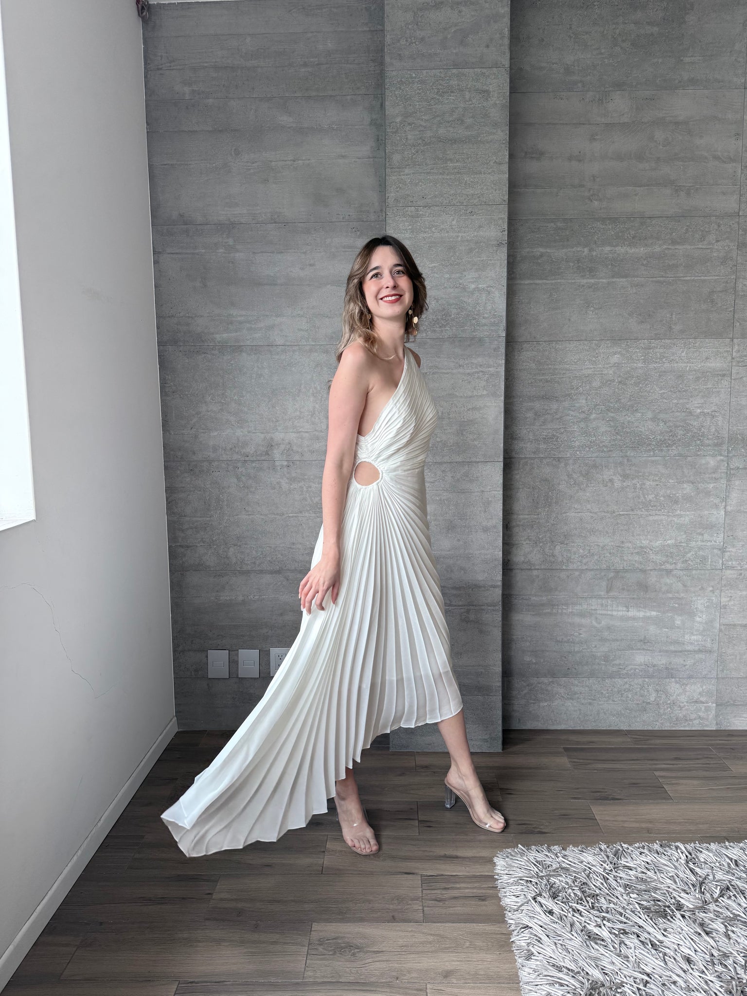 Vestido midi plisado, asimetrico, cutout lateral. Tela satinada.