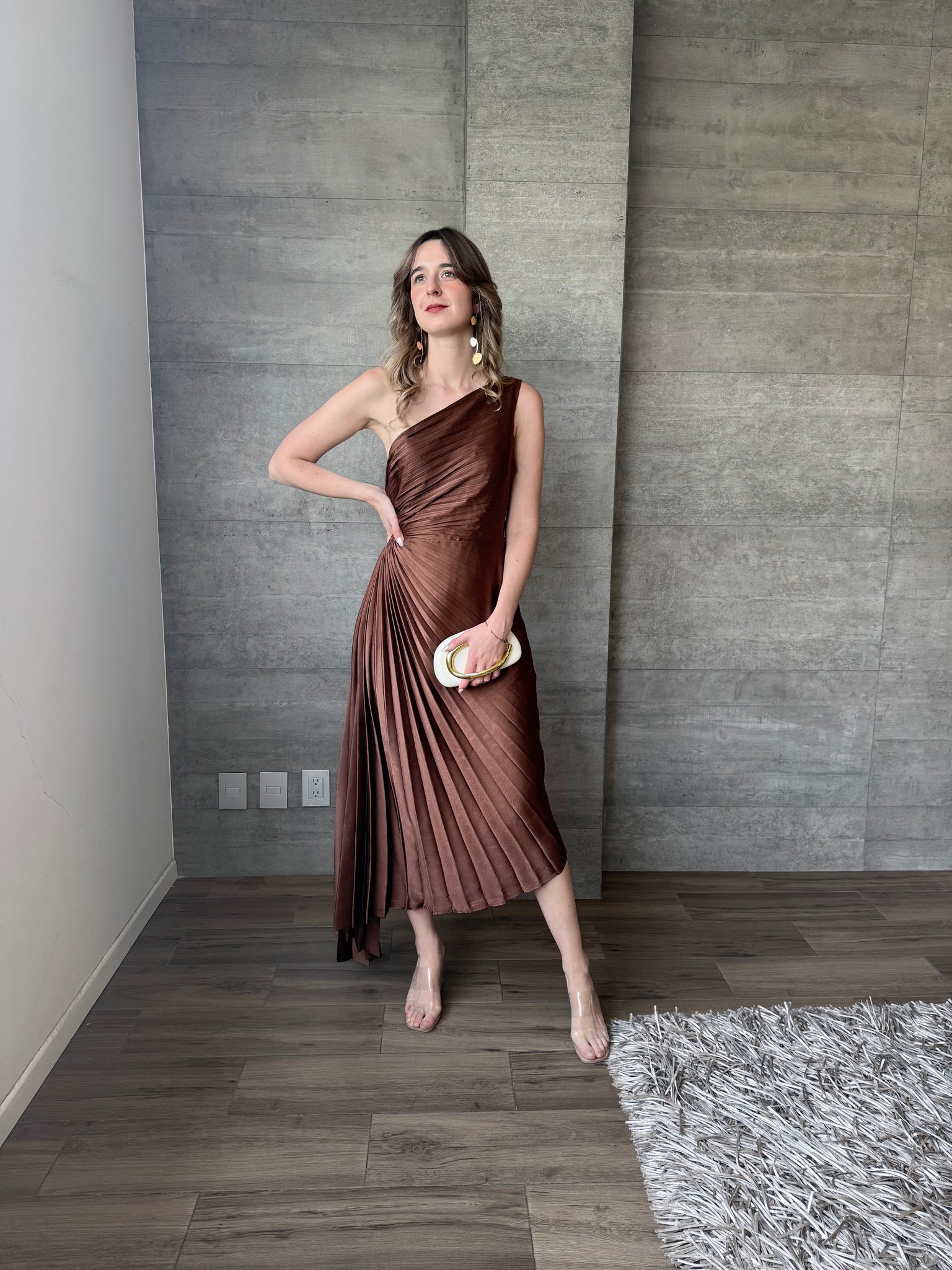 Vestido midi plisado, asimetrico, cutout lateral. Tela satinada.