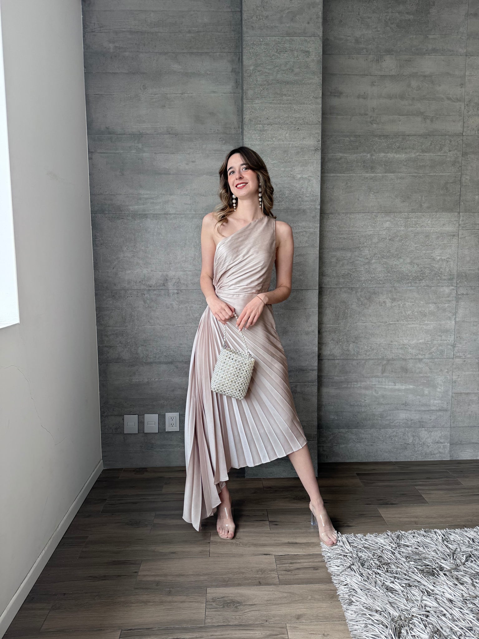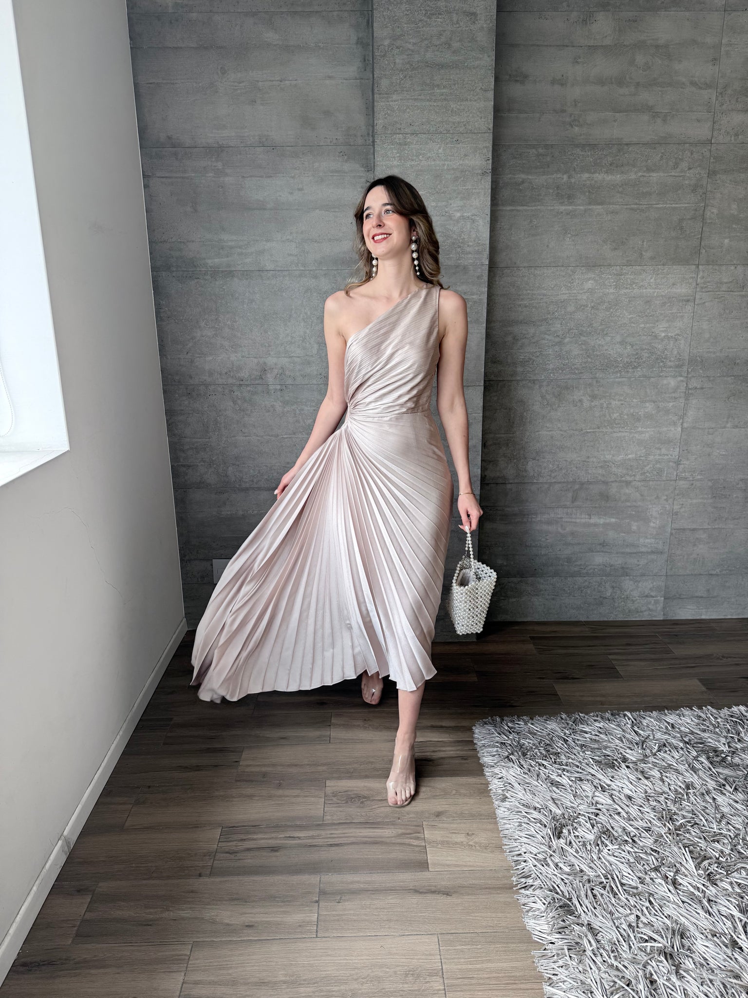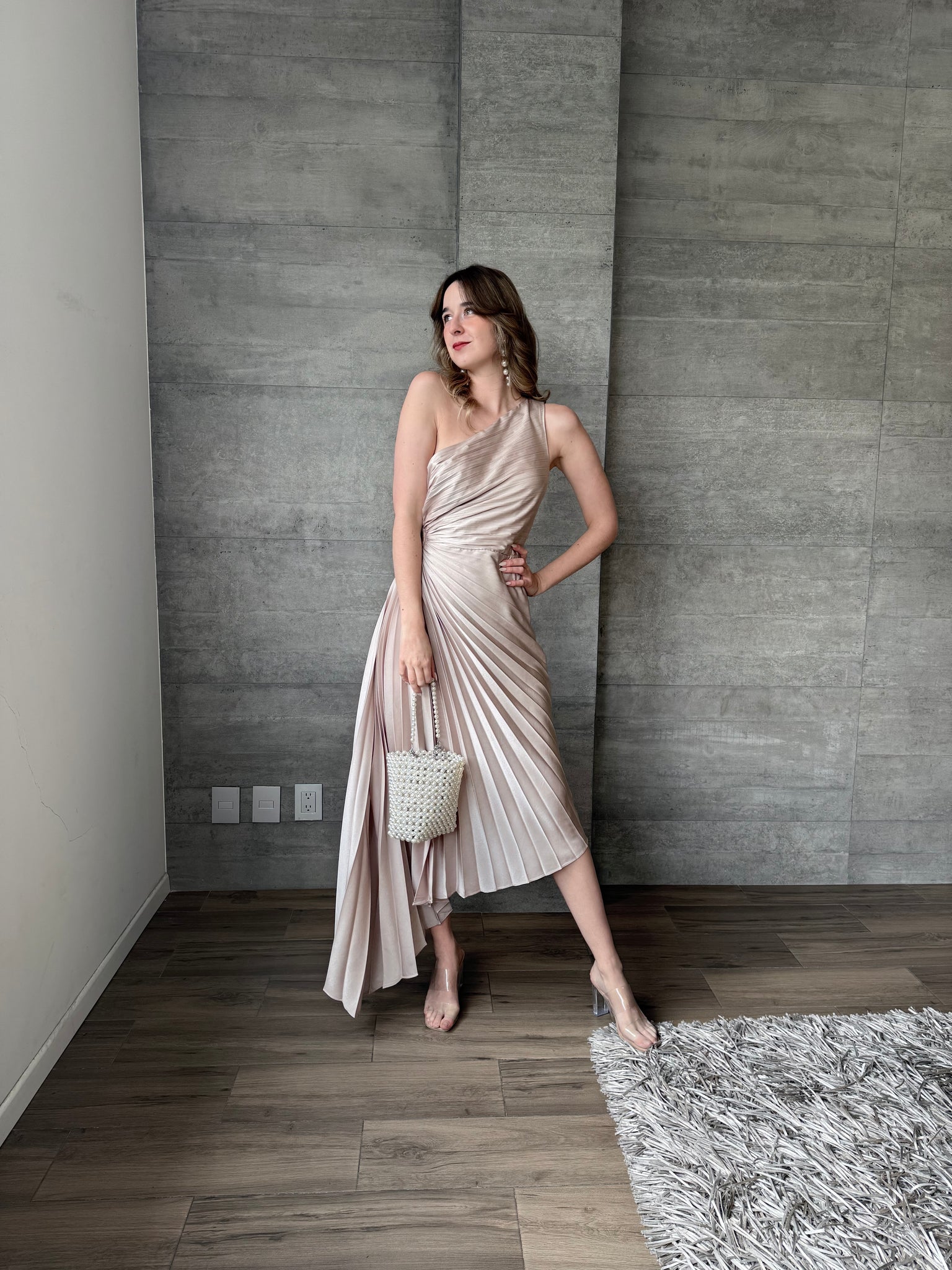 Vestido midi plisado, asimetrico, cutout lateral. Tela satinada.