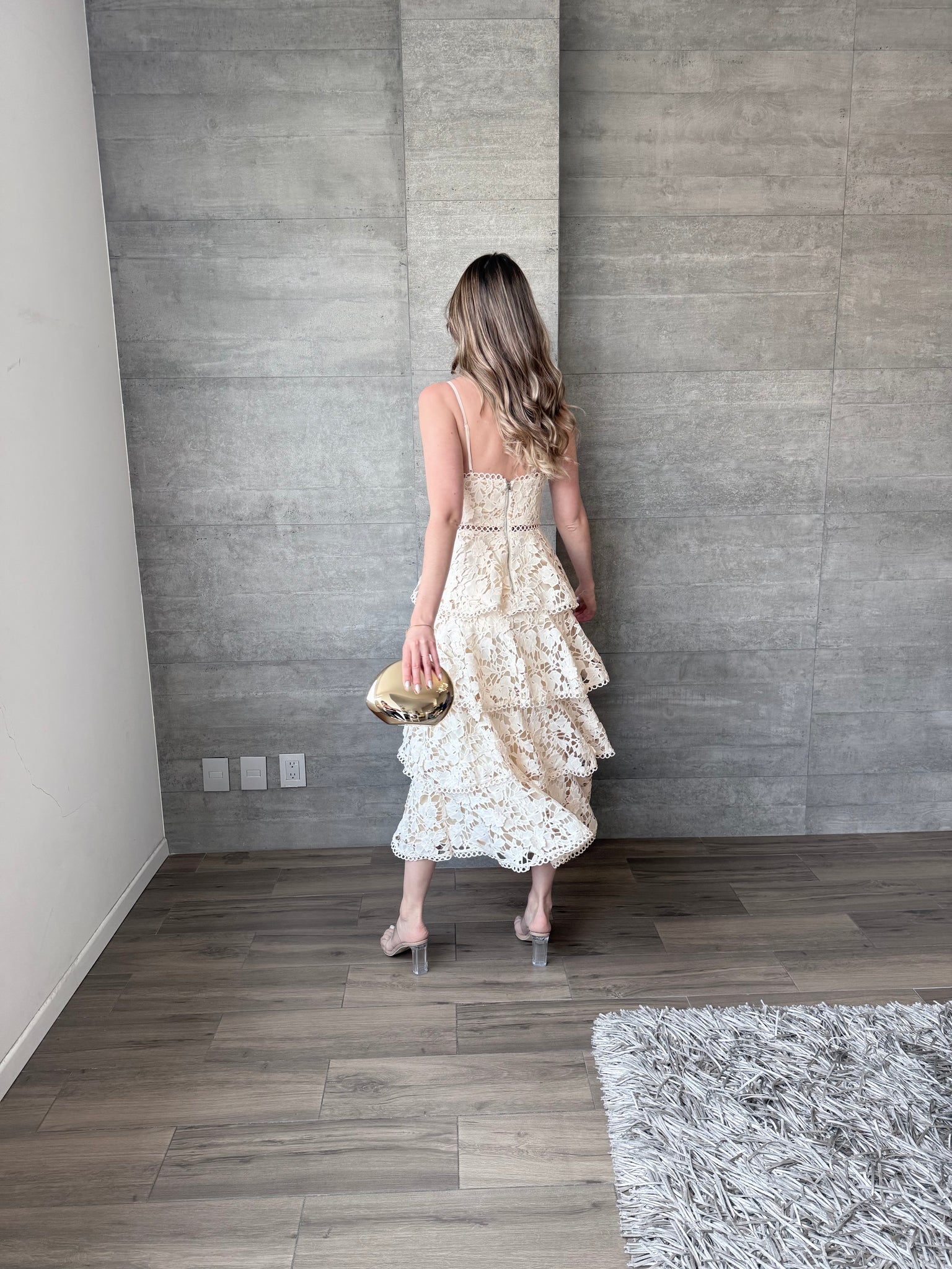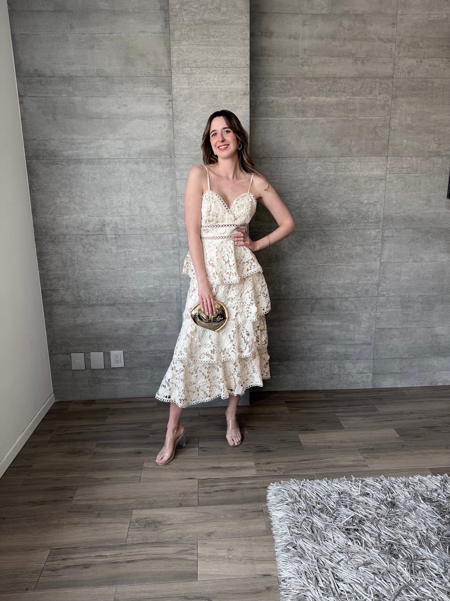 Vestido midi de crochet con tirantes y cierre en espalda.