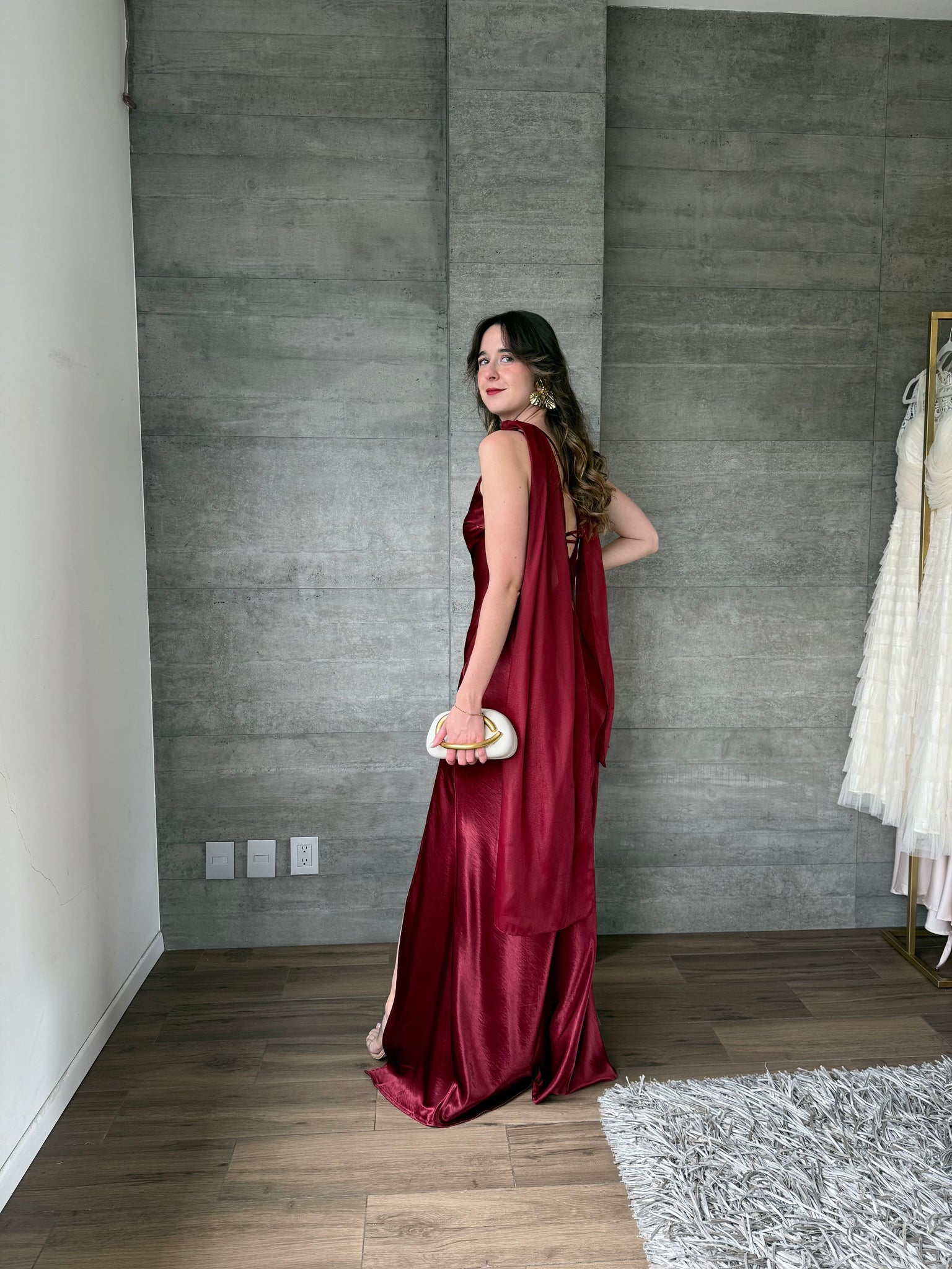 Vestido largo asimetrico con estola colgante y abertura en pierna.