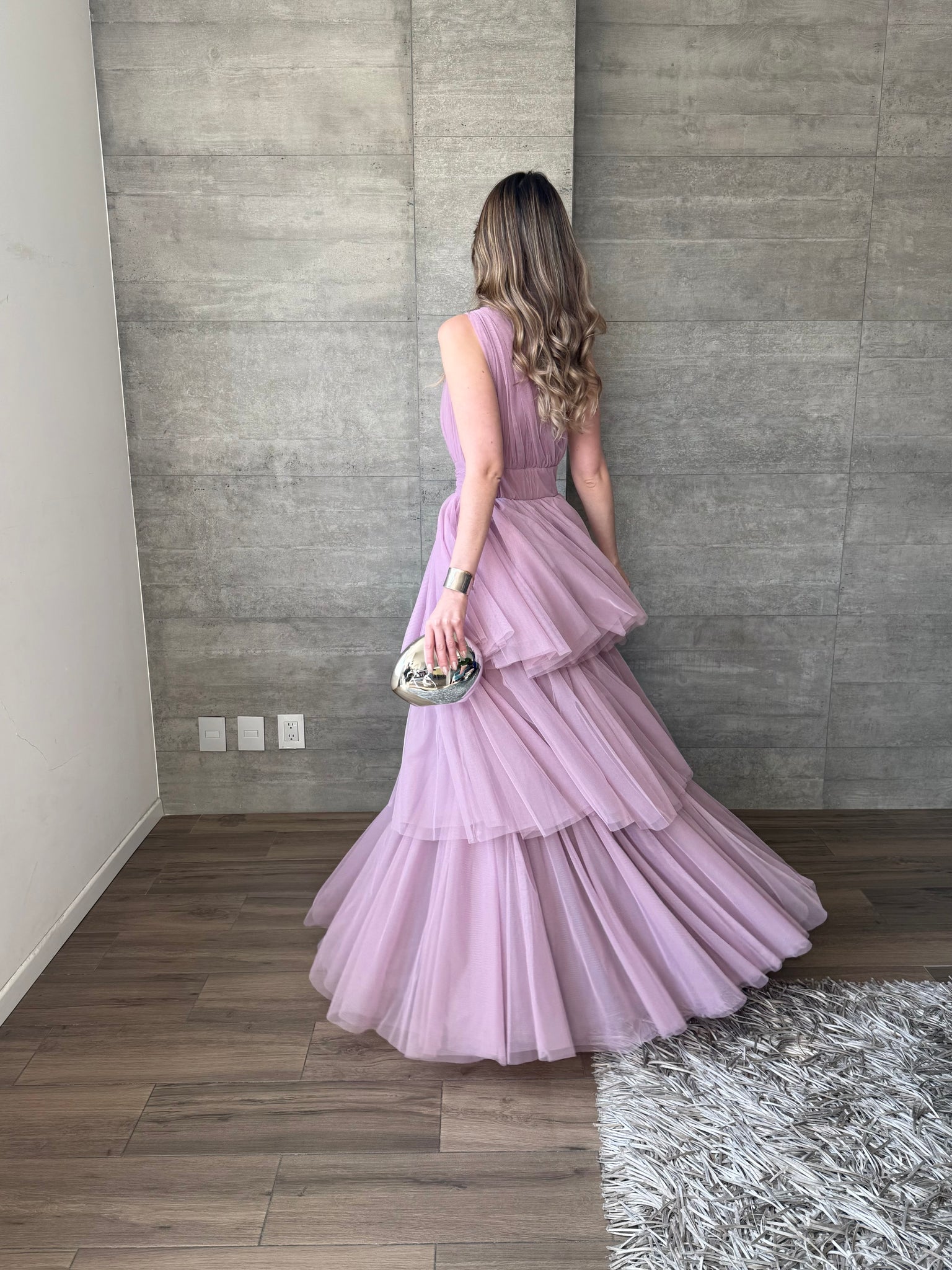 Vestido largo con tul en capas, a un hombro, escote en pierna.