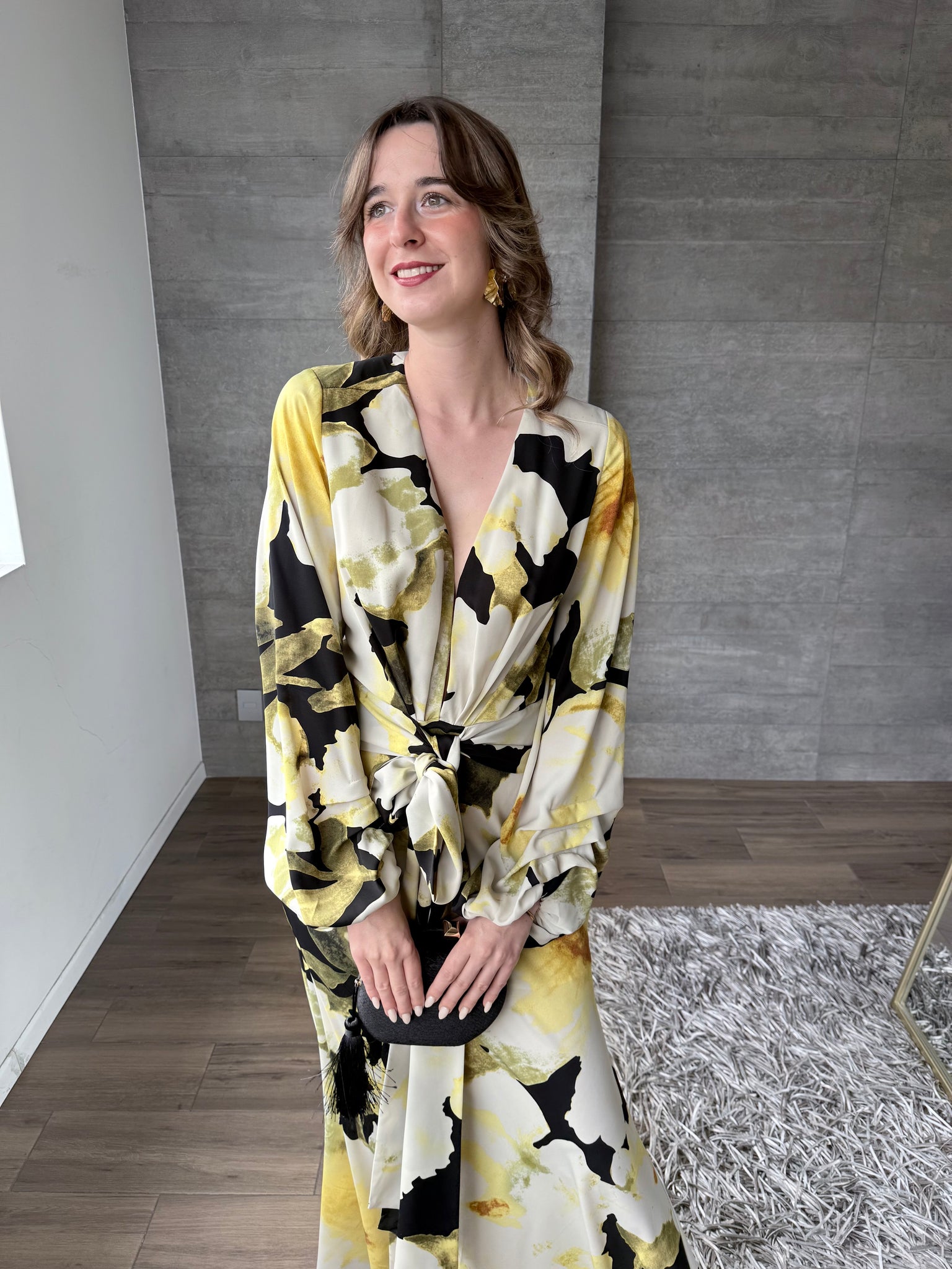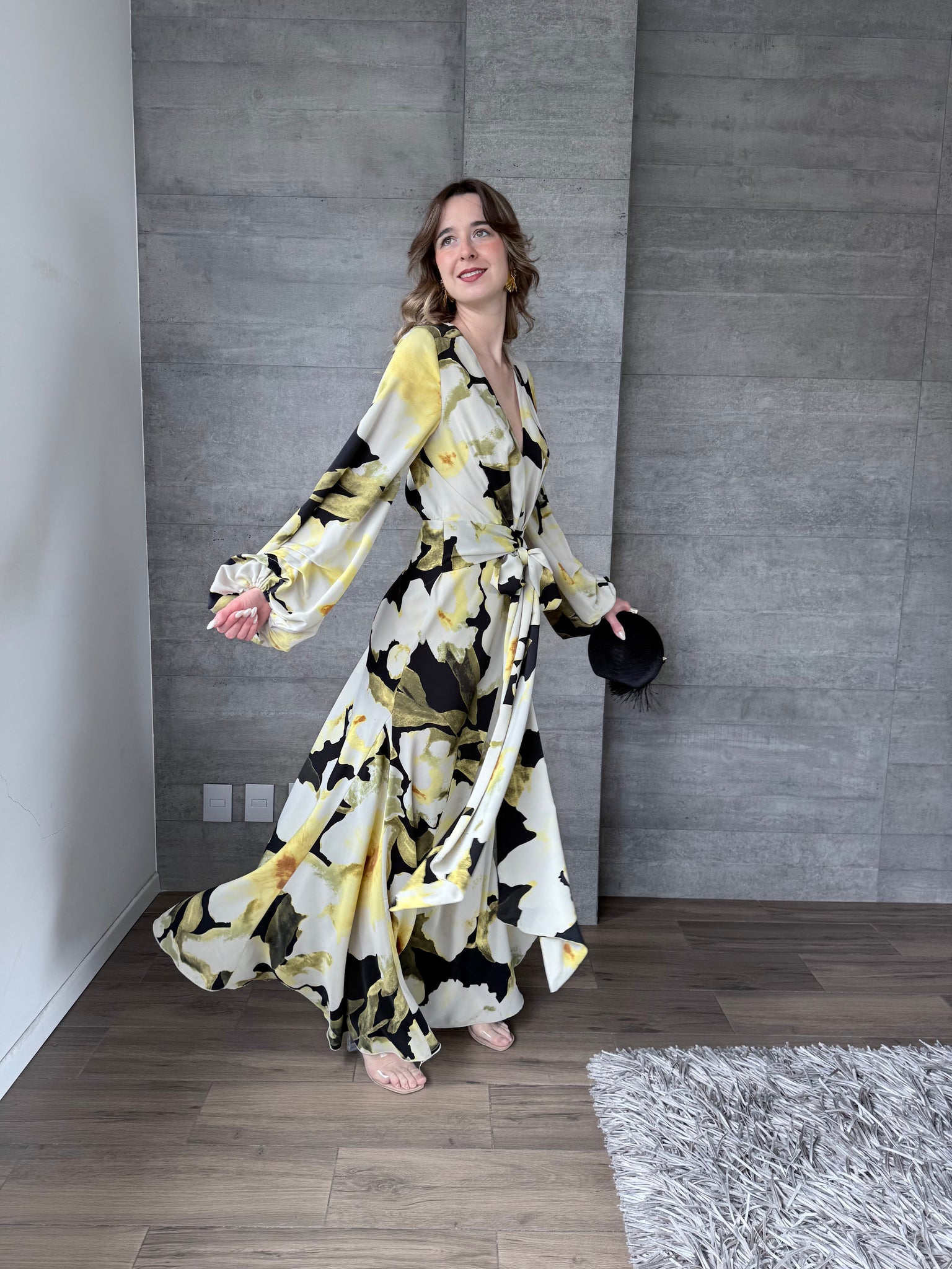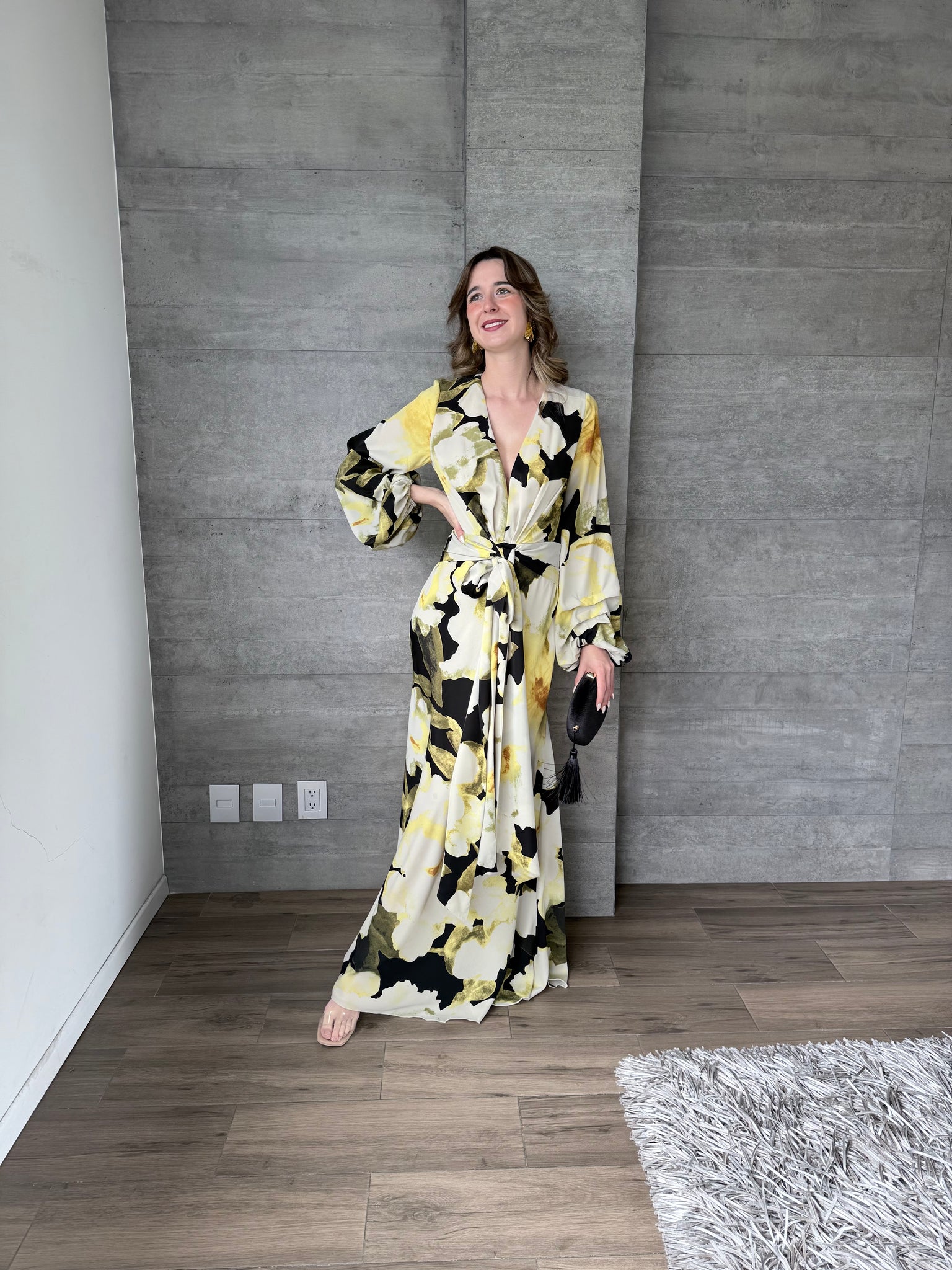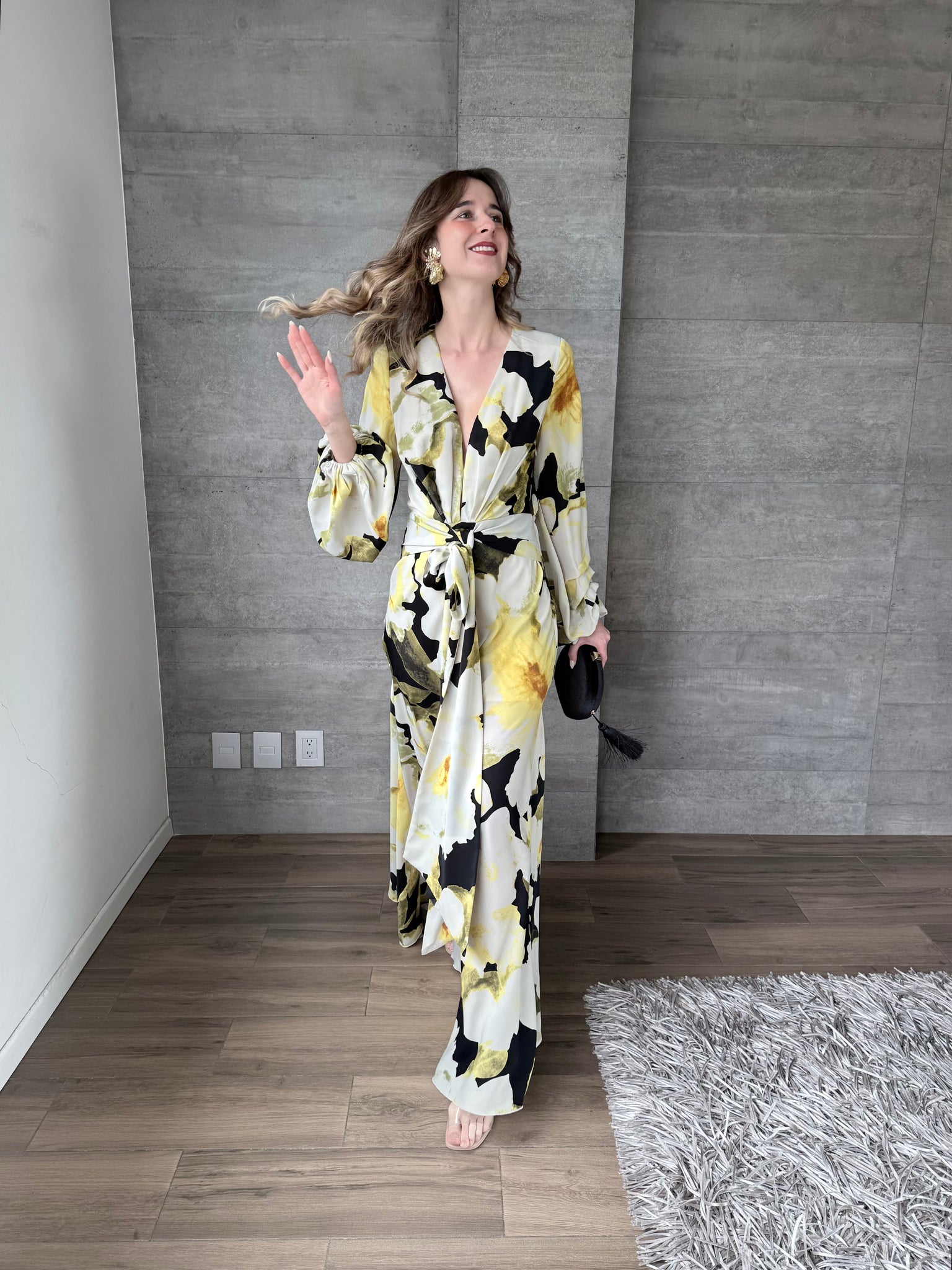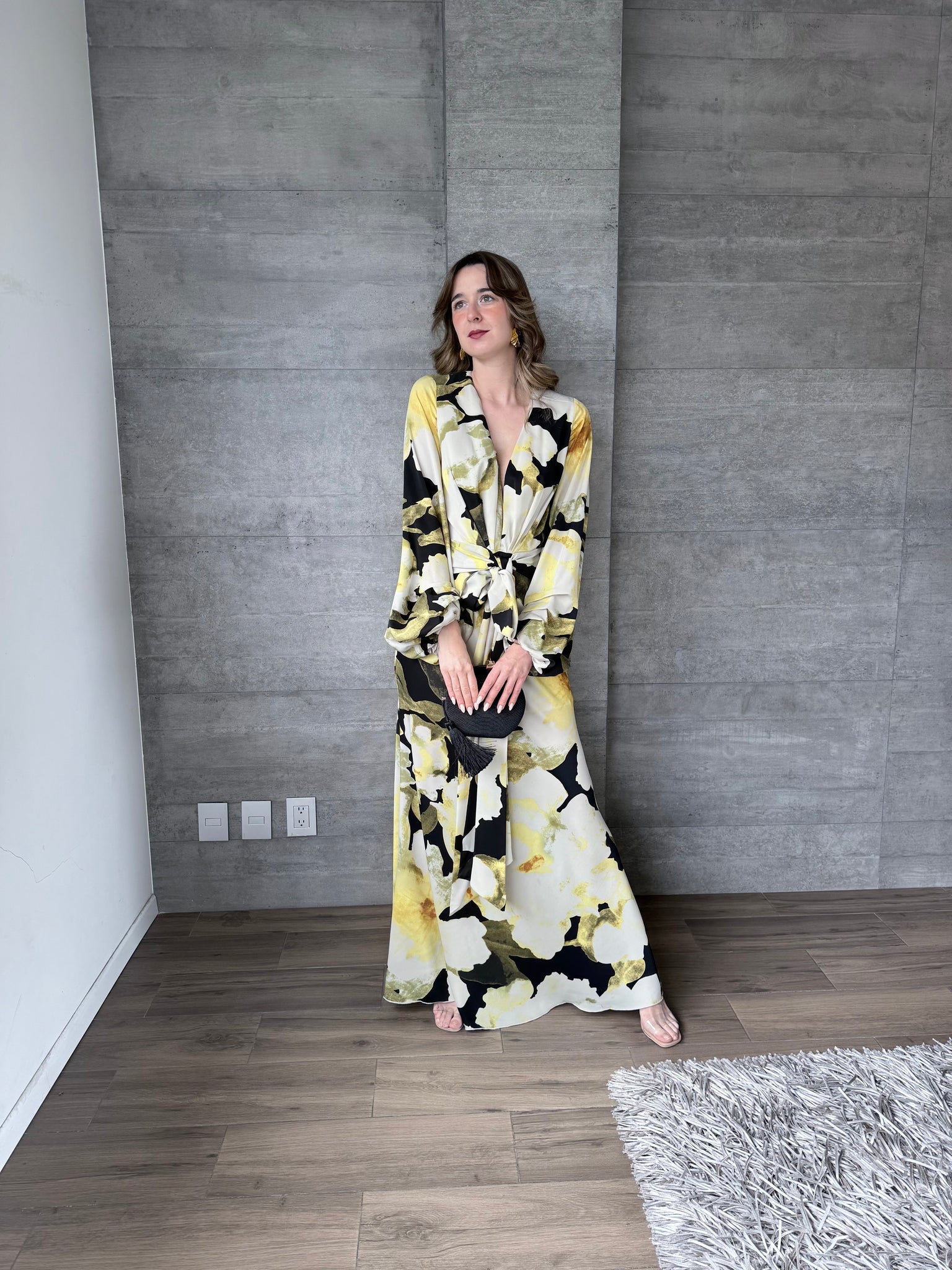 Vestido largo con mangas floral, escote en V.