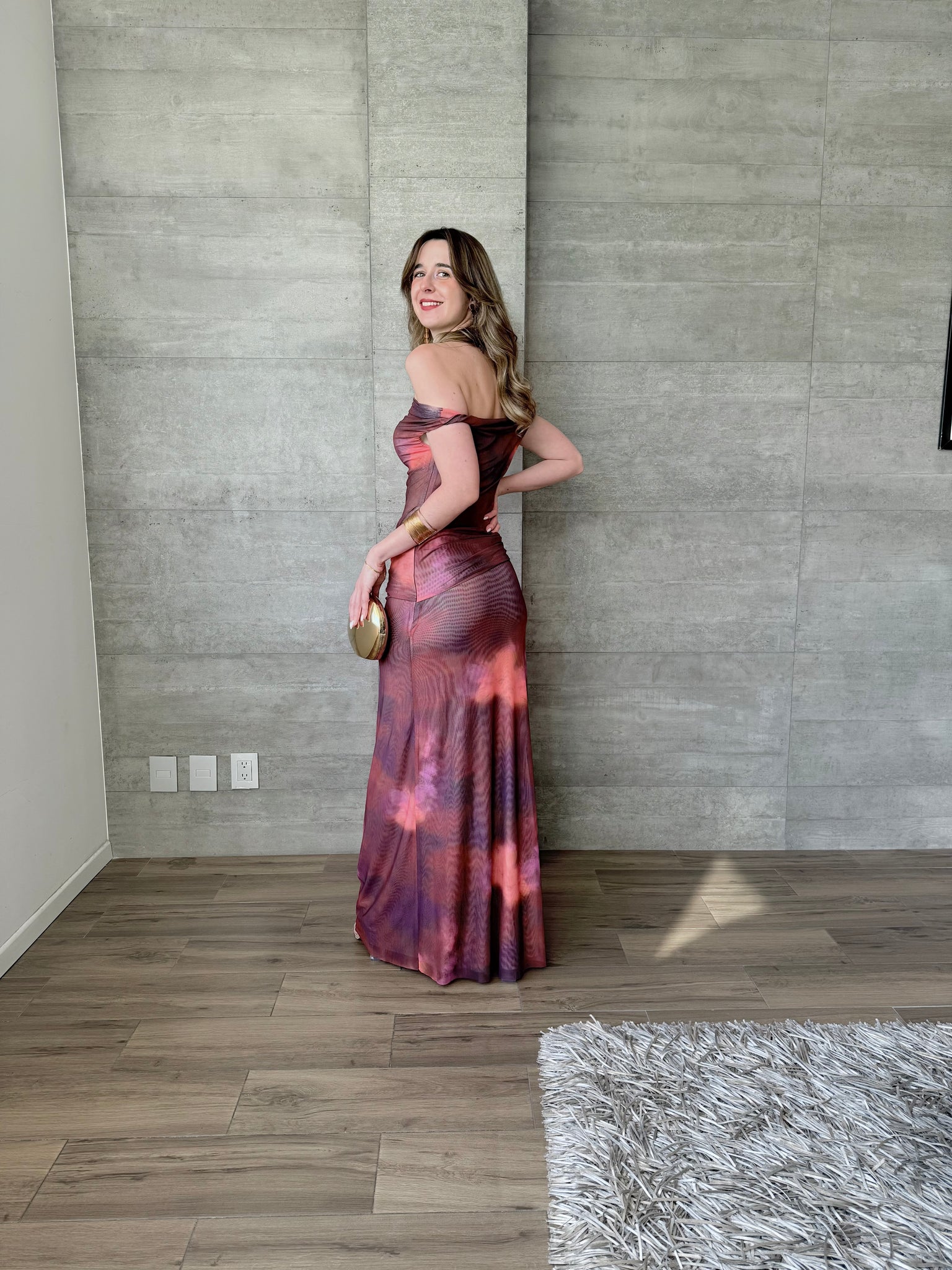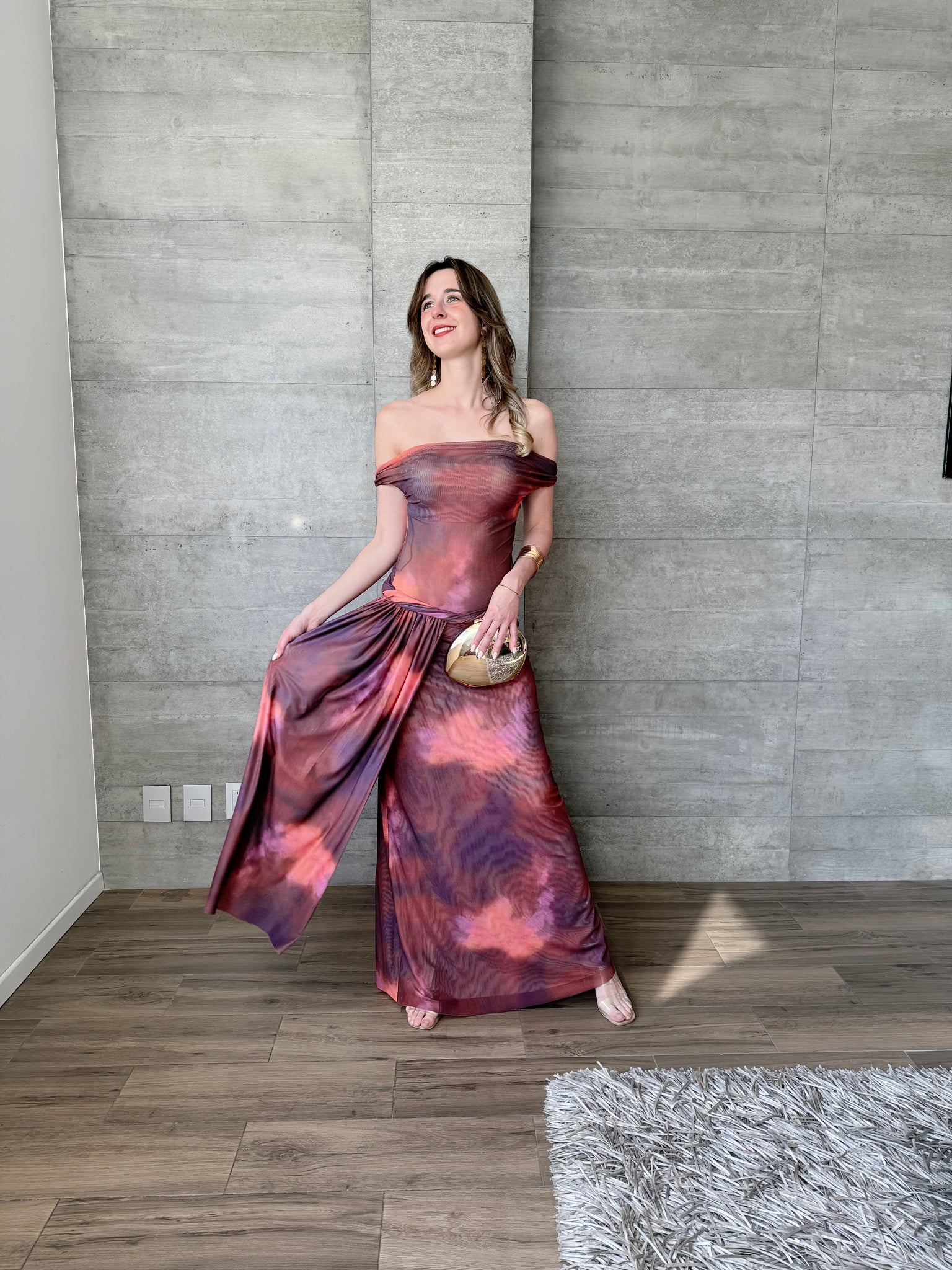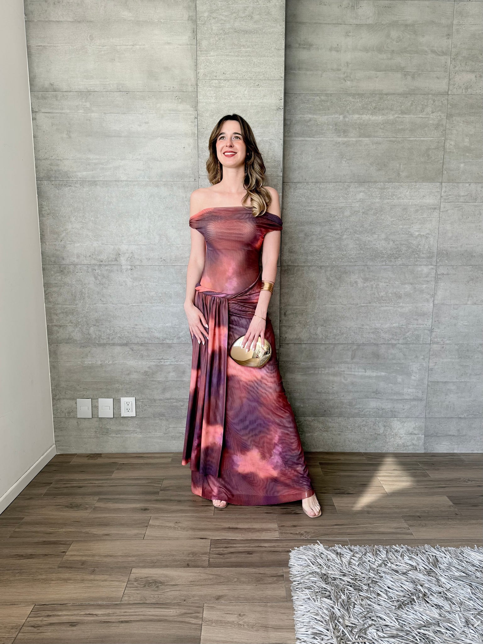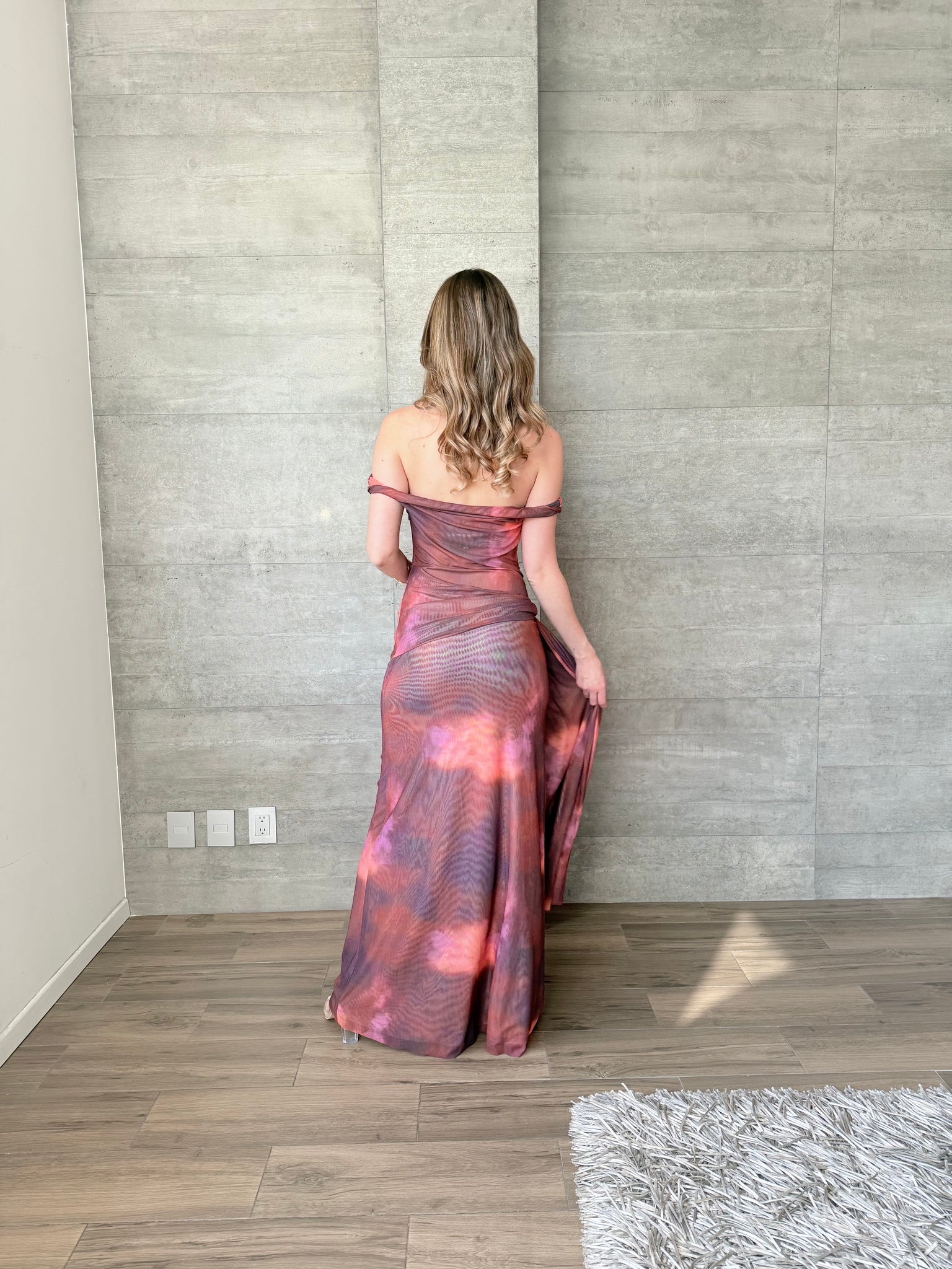 Vestido largo de mesh con hombros descubiertros y transparencia. Estampado acuarela.
