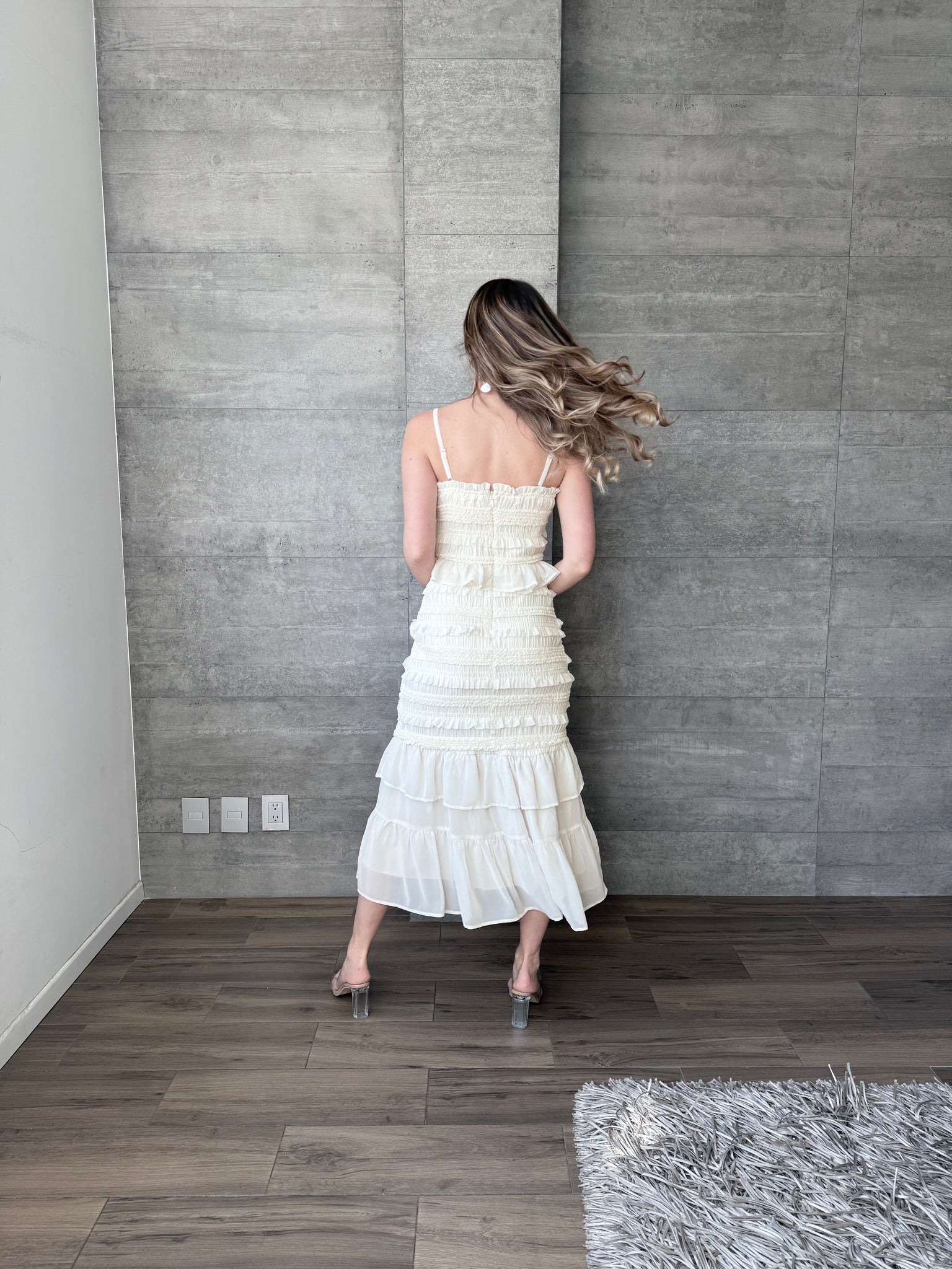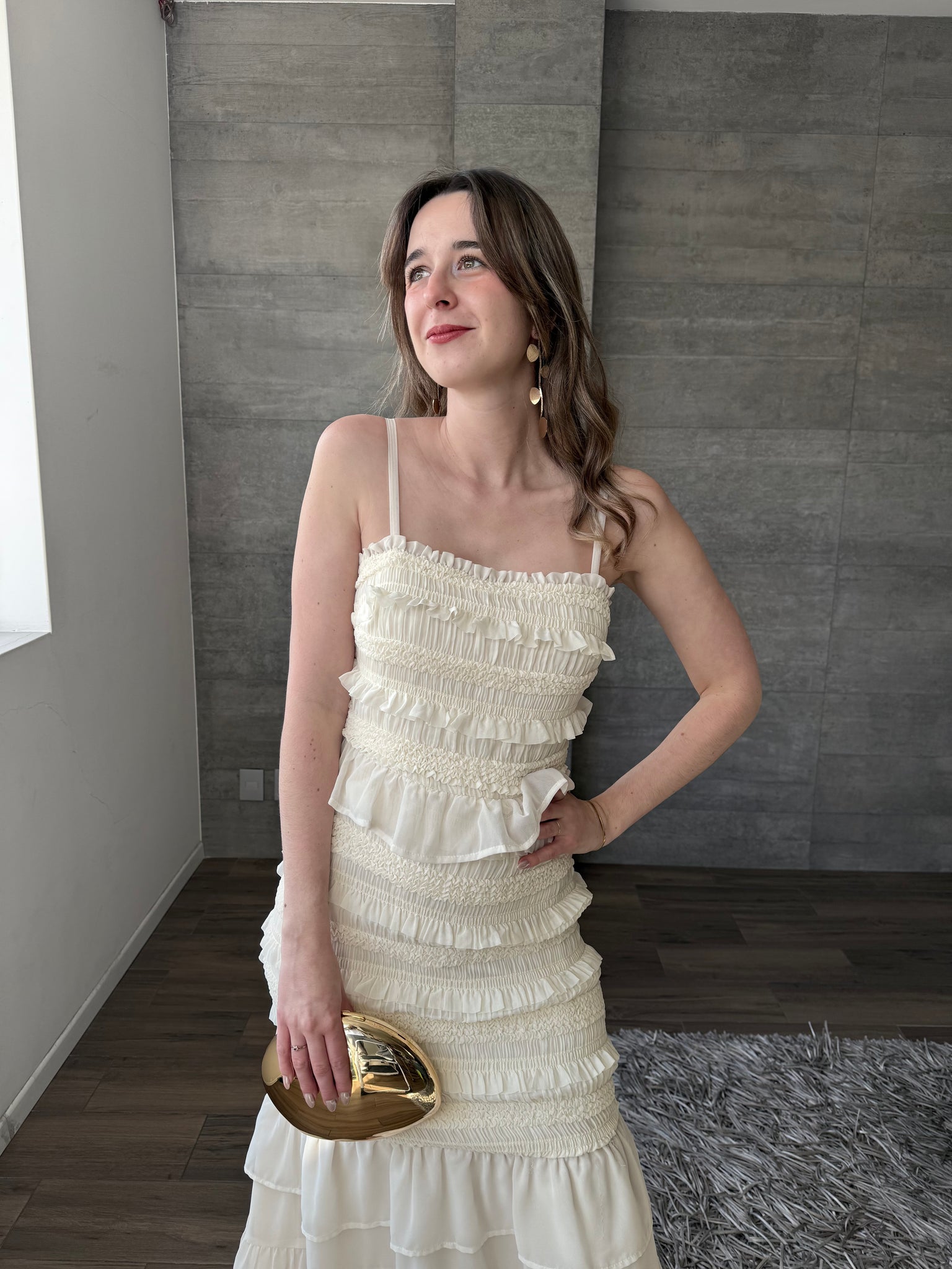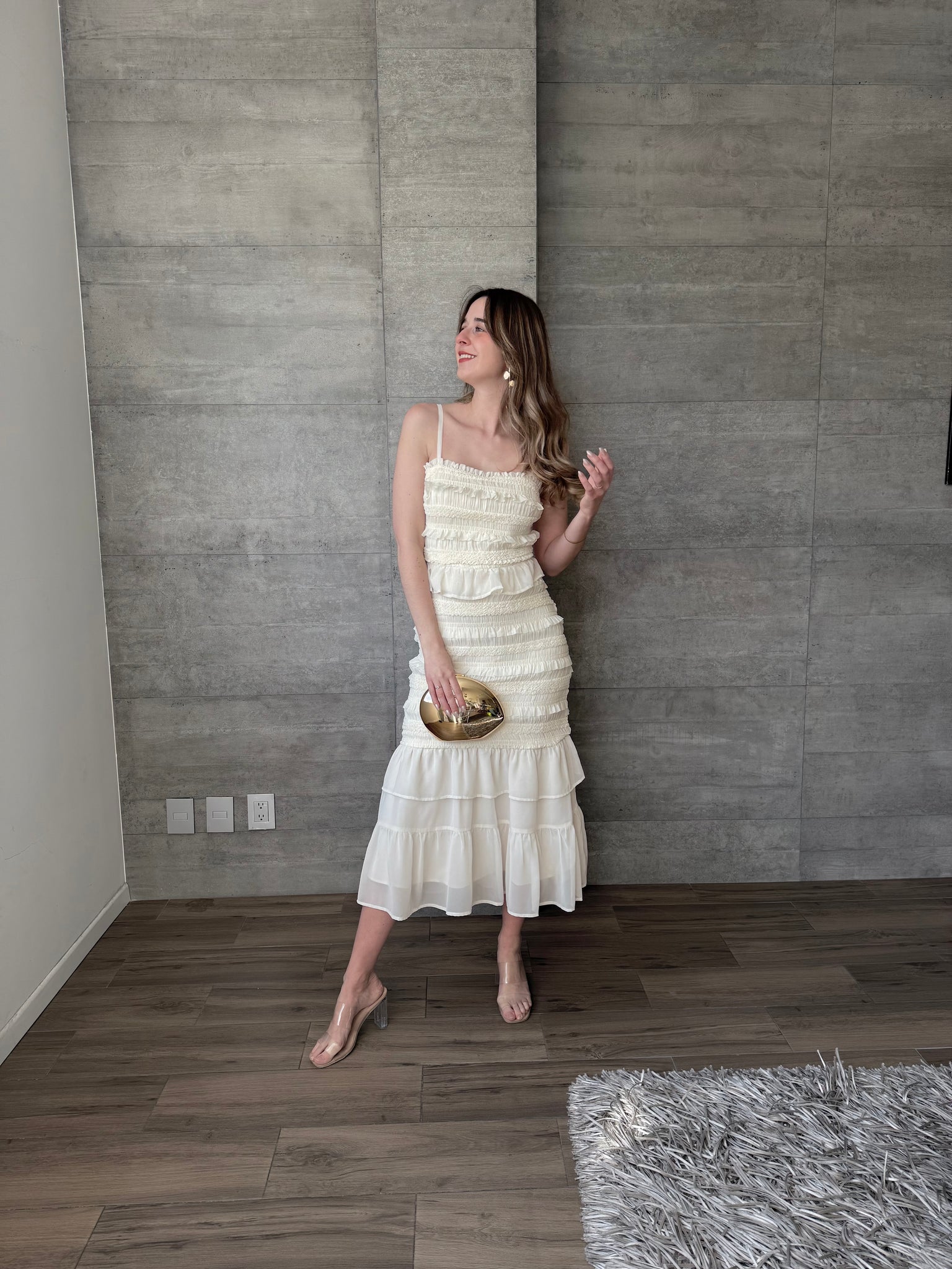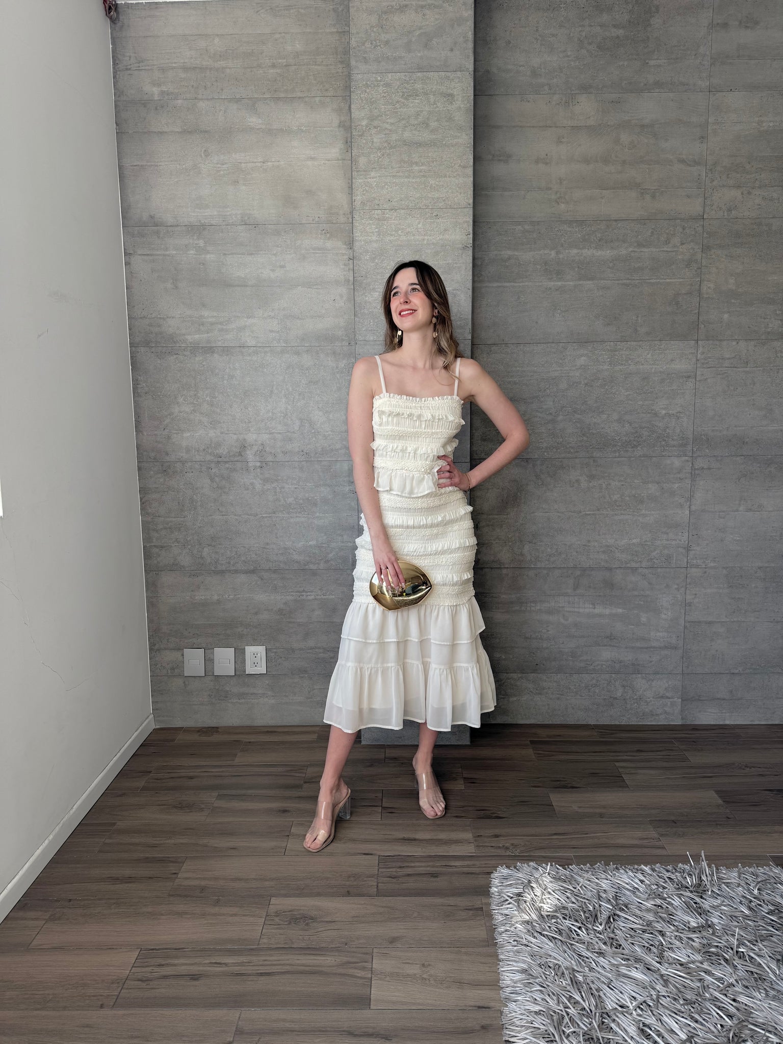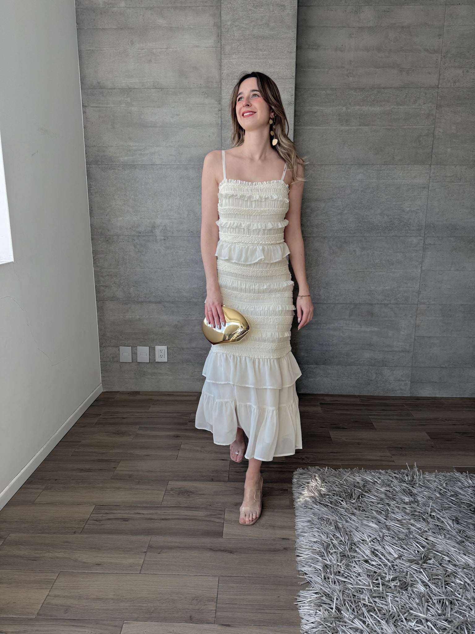 Vestido midi color crema, entallado a la silueta, con tirantes delgados, ideal para eventos de día y celebraciones especiales.