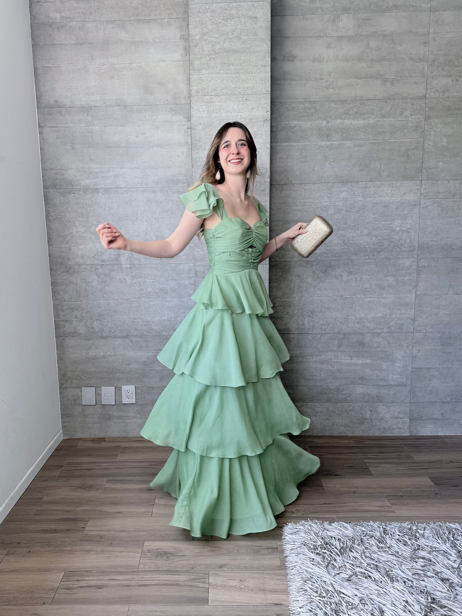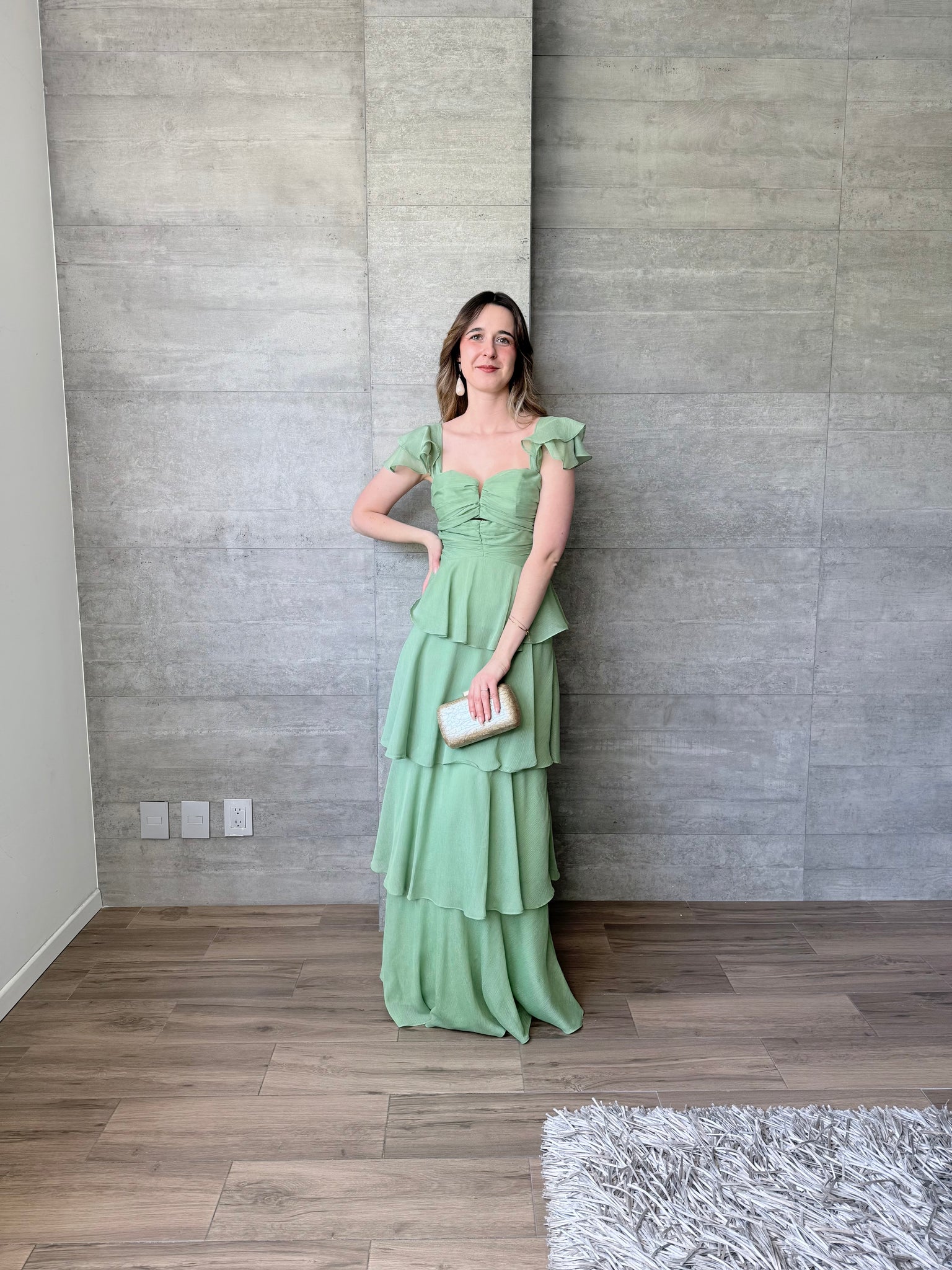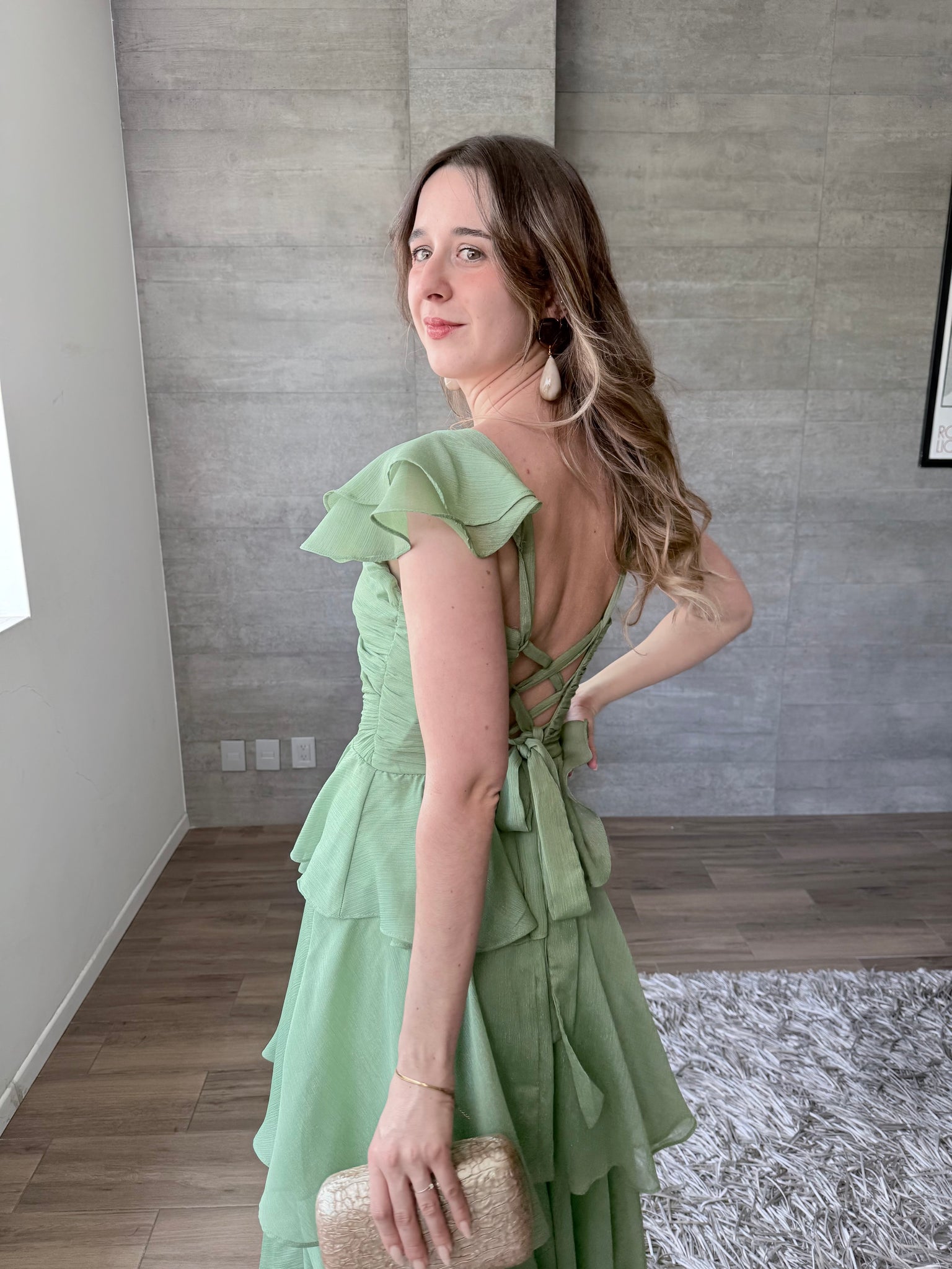 Viña - Vestido largo con olanes olivo