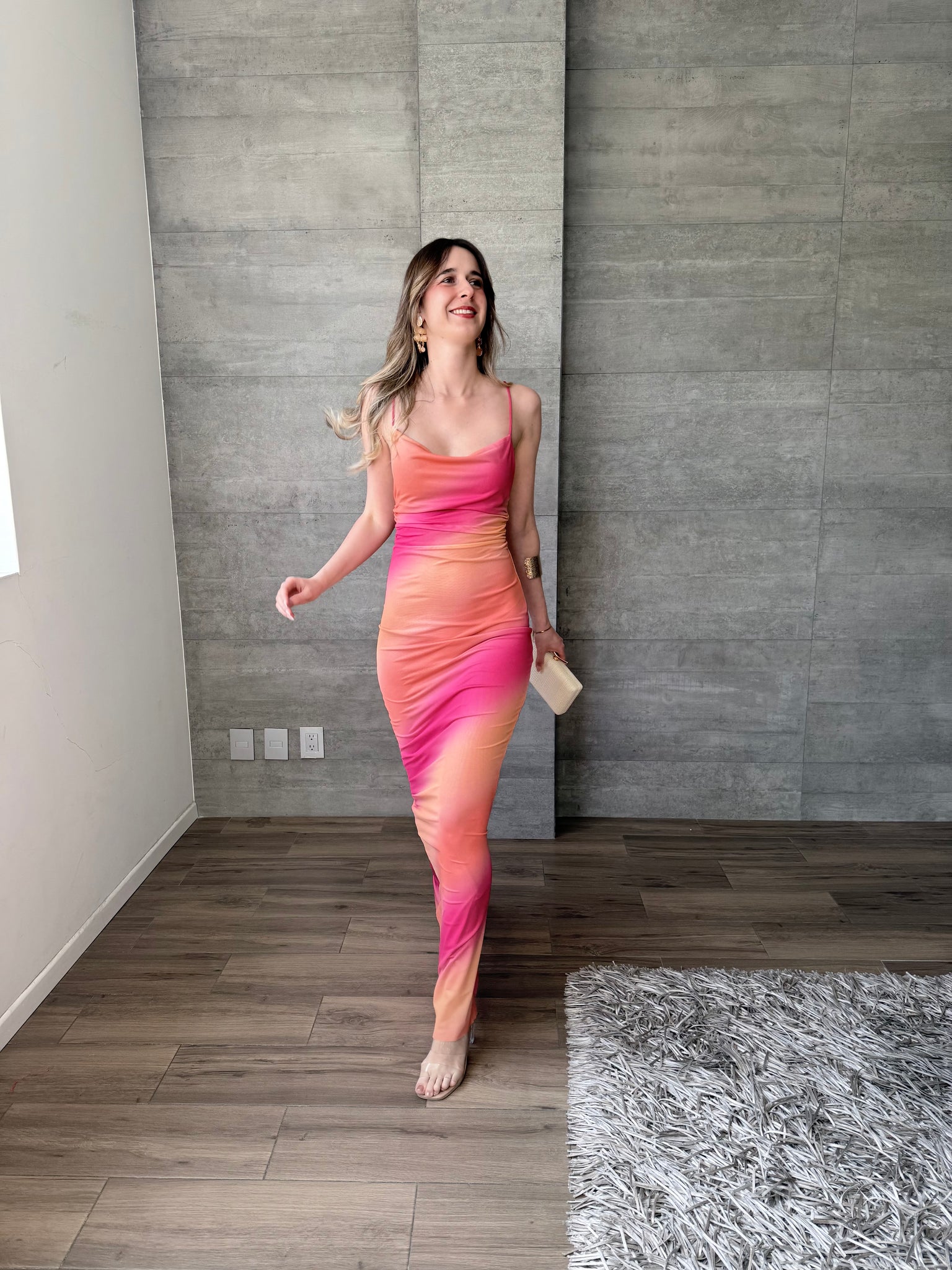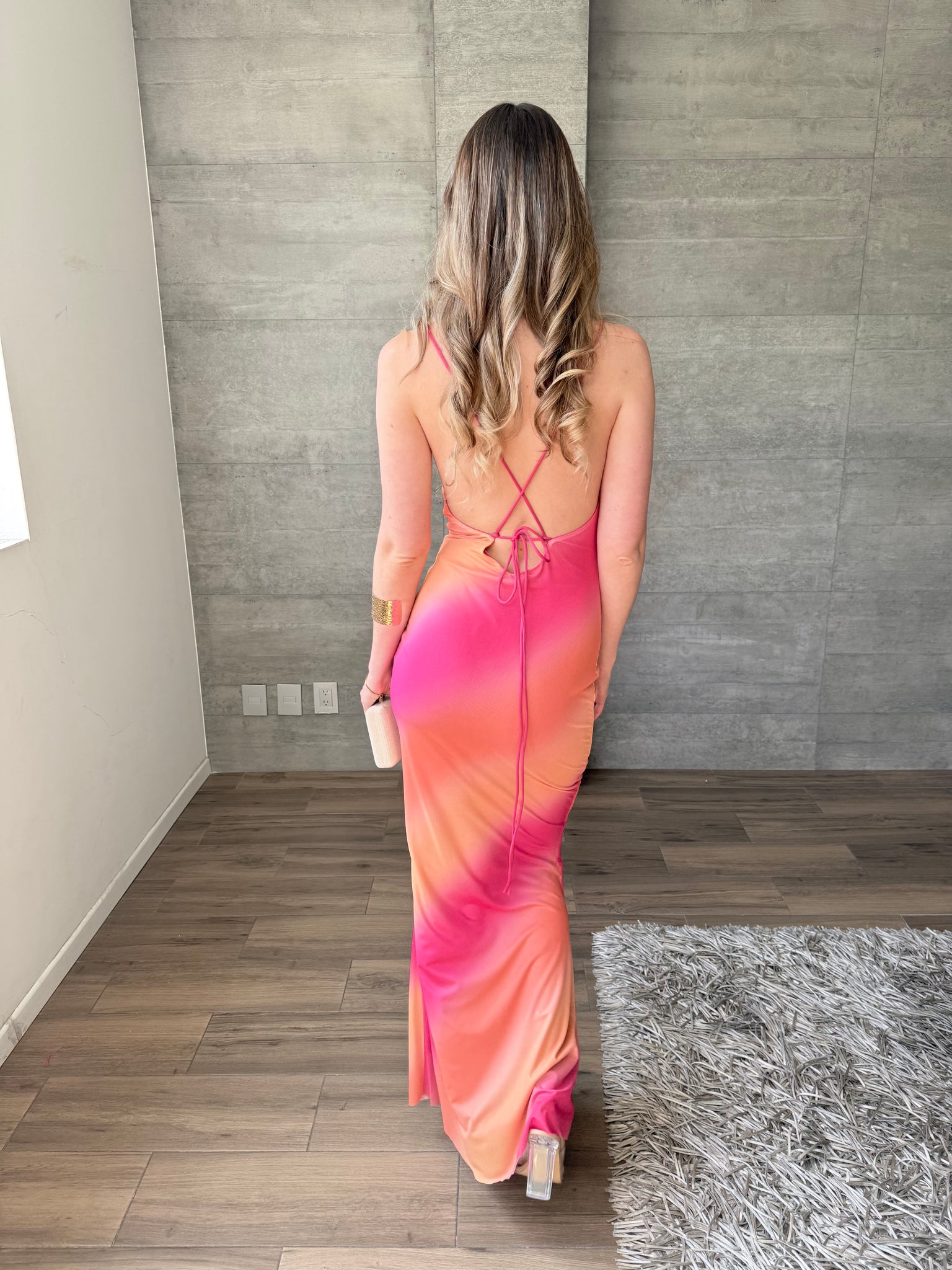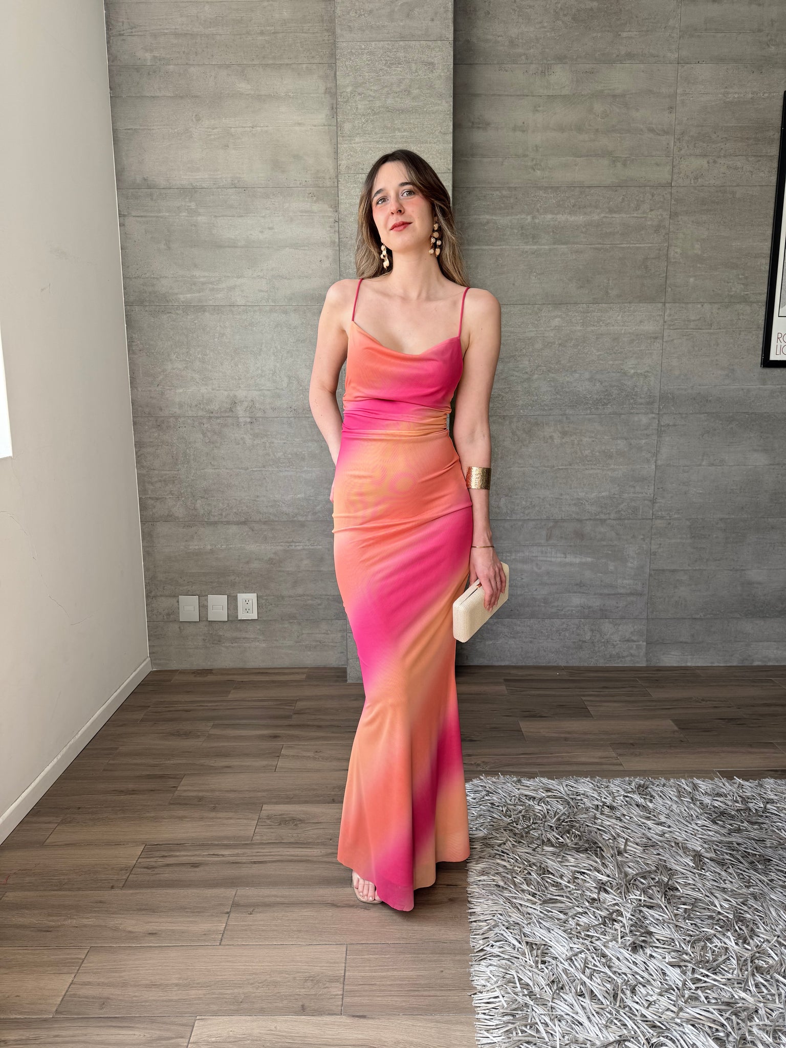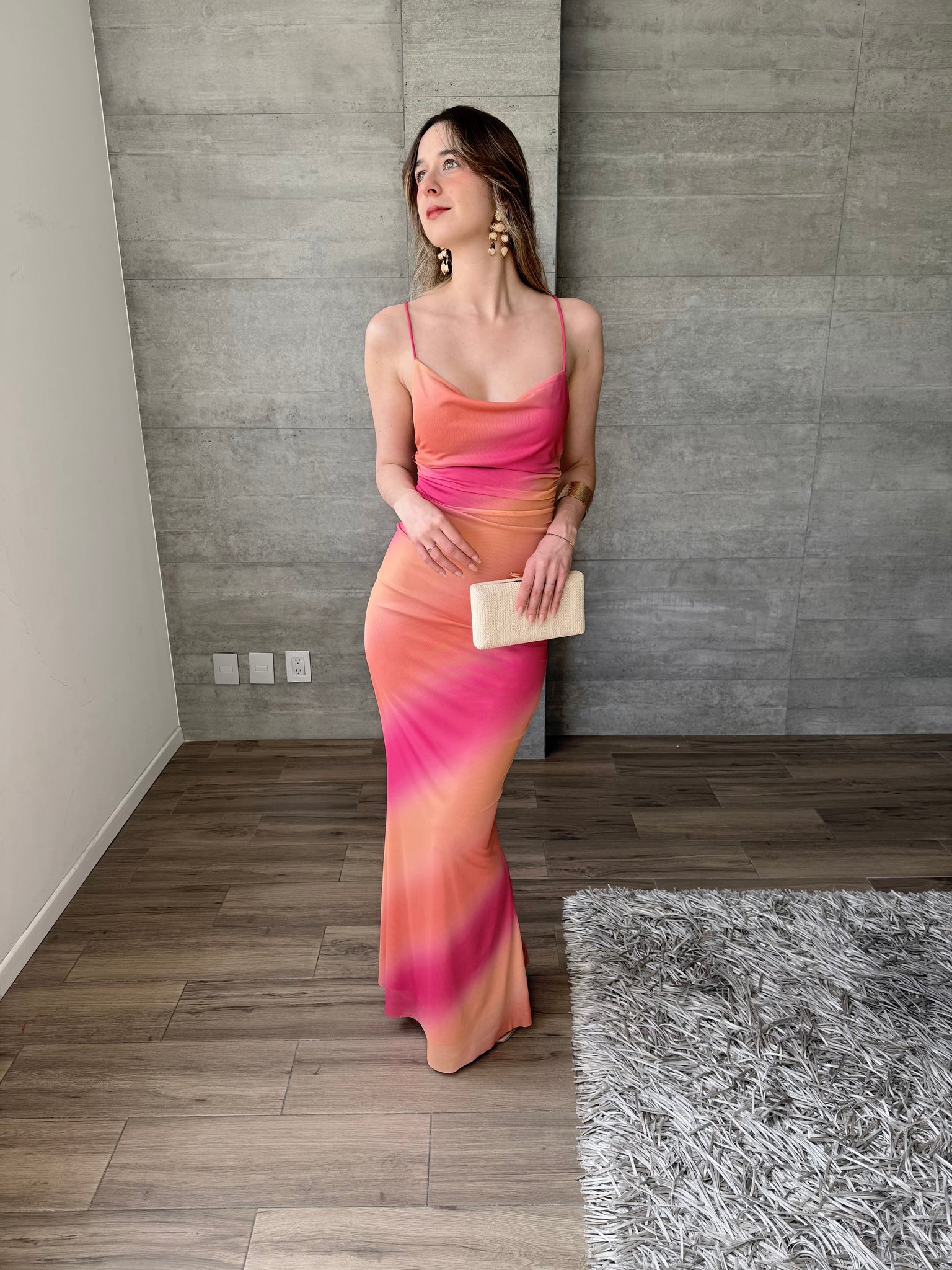 Vestido largo de mesh, de tirantes finos cruzados en espalda. Combinación de color naranja y rosa.
